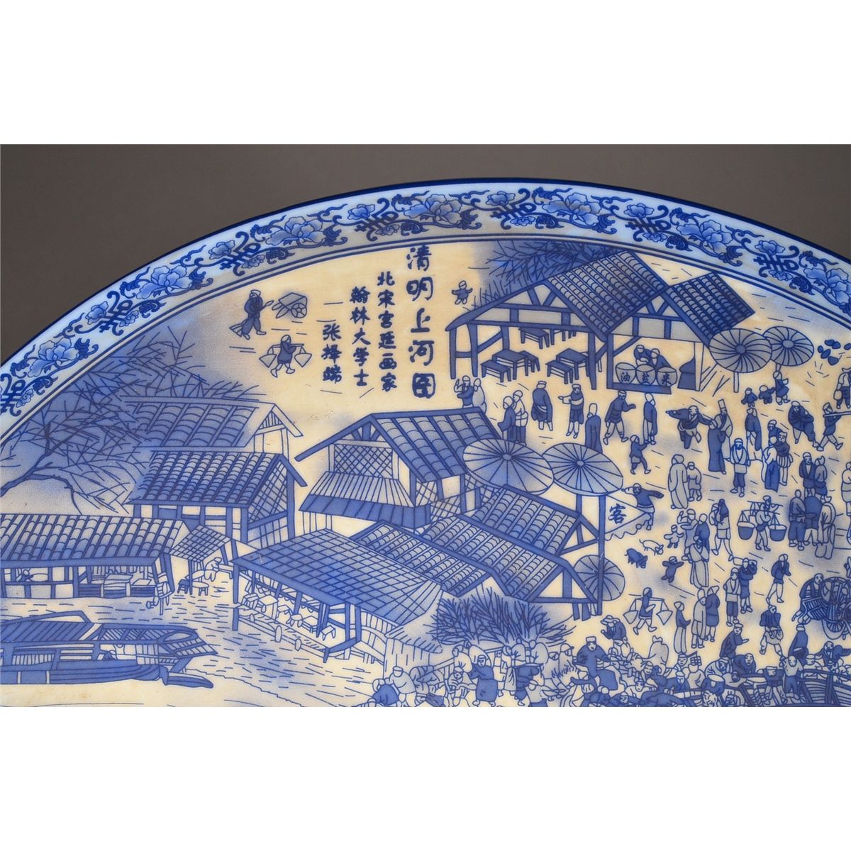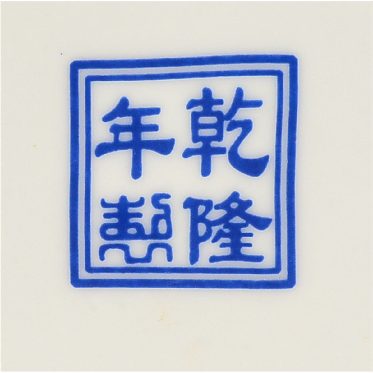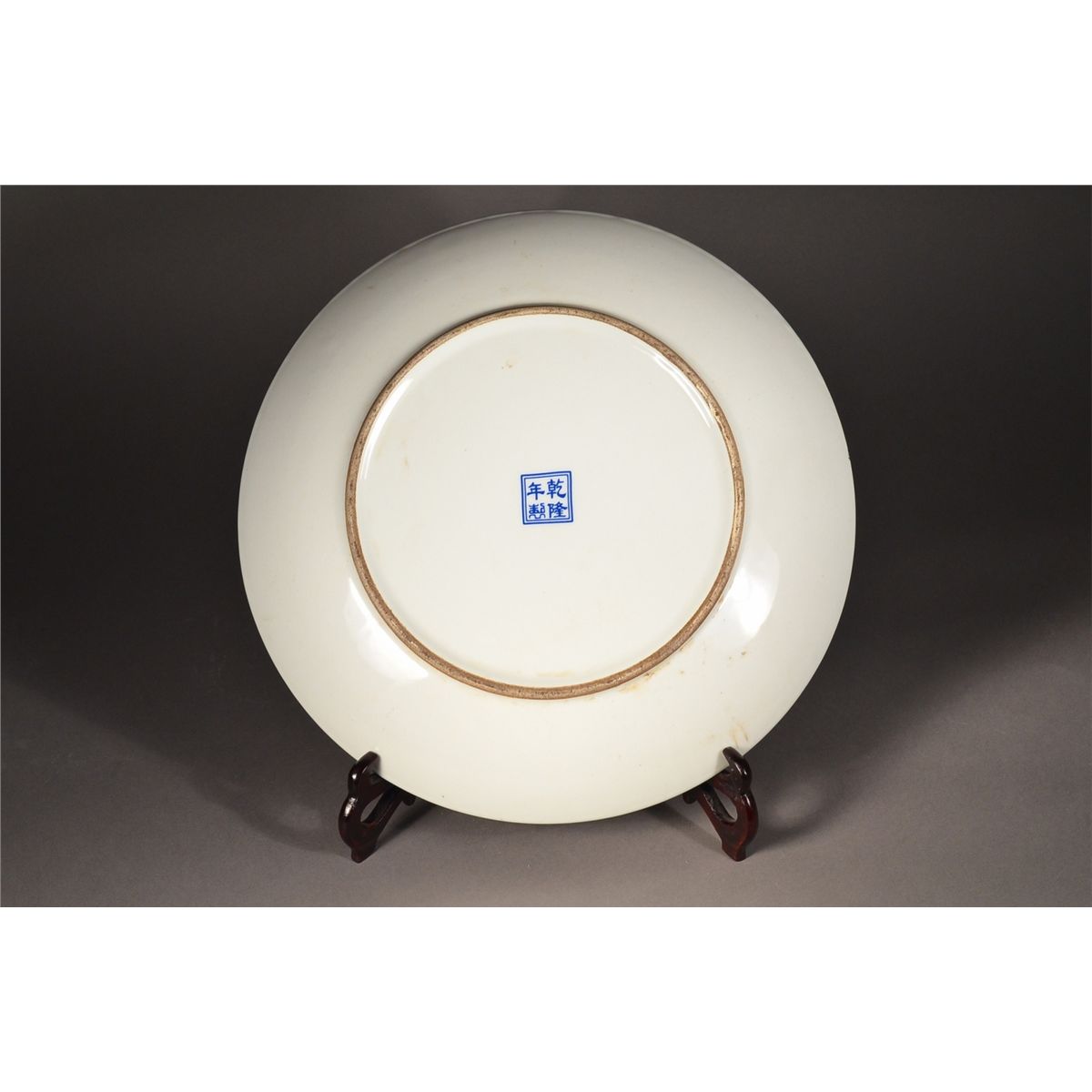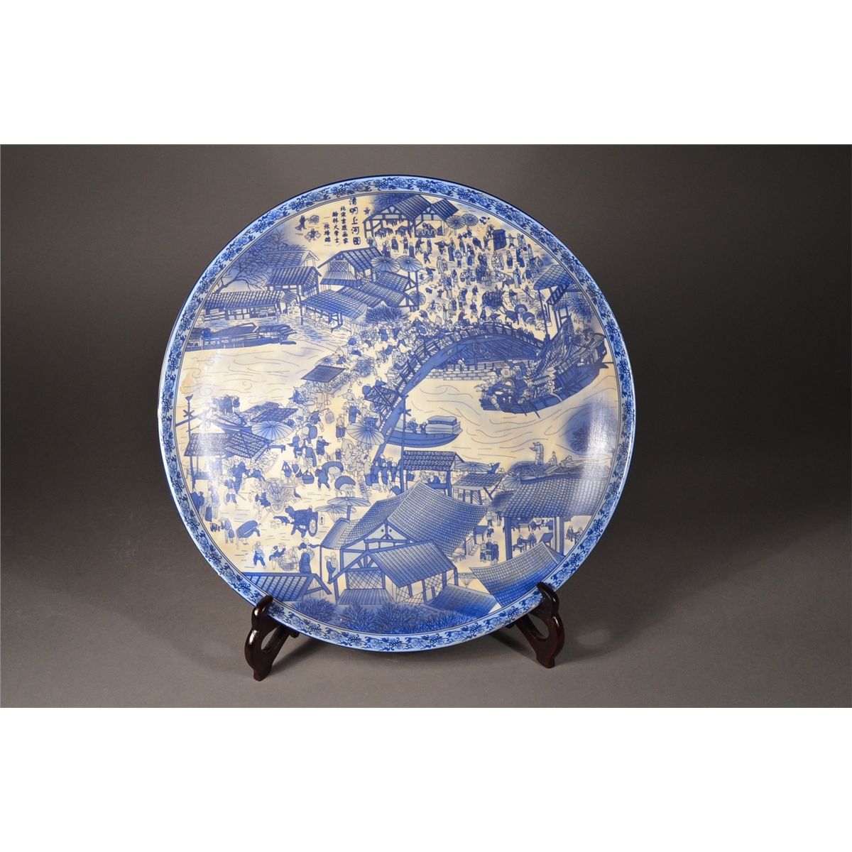 Chinese blue and white porcelain plate: featuring landscape design enclosed within classic scroll band on rim; four-character Qianlong mark on base; D: 35 cm, H: 4 cm