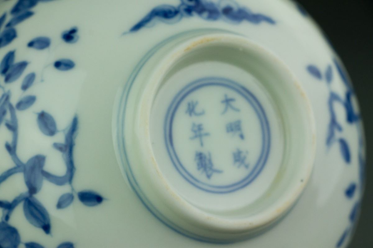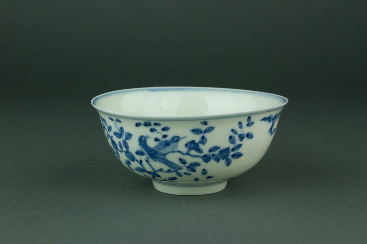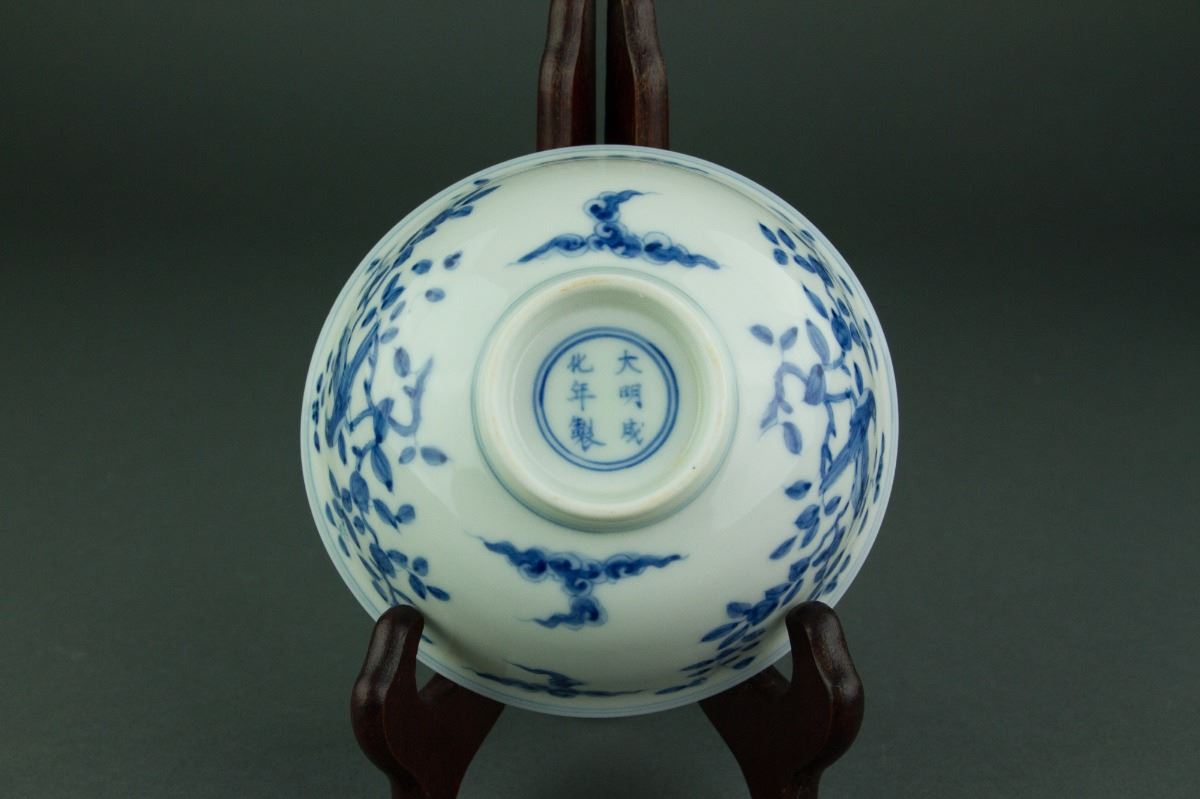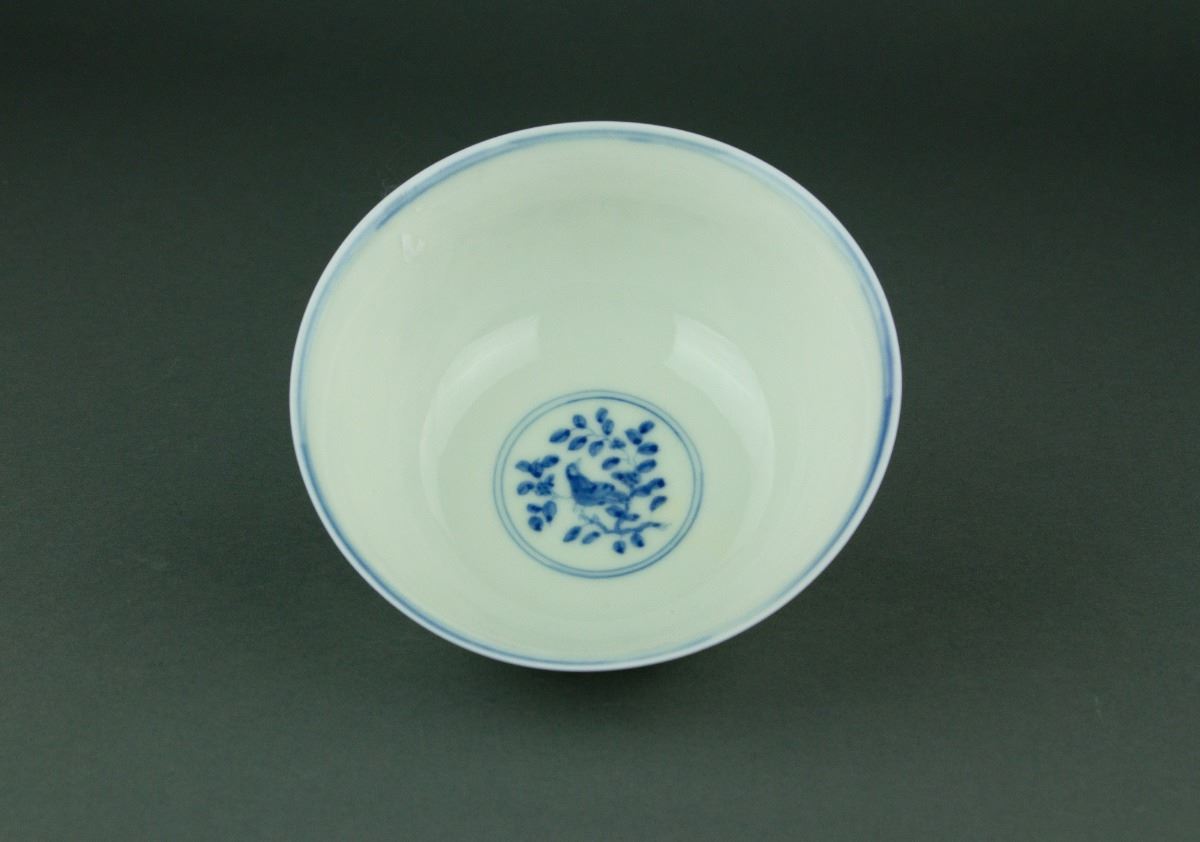 Chinese blue and white porcelain bowl; of rounded sides with everted rim; supported on short foot rim; the exterior painted with birds perching on tree branches; six-character Ming Chenghua mark on base; H: 6 cm, D: 13 cm, 127 grams