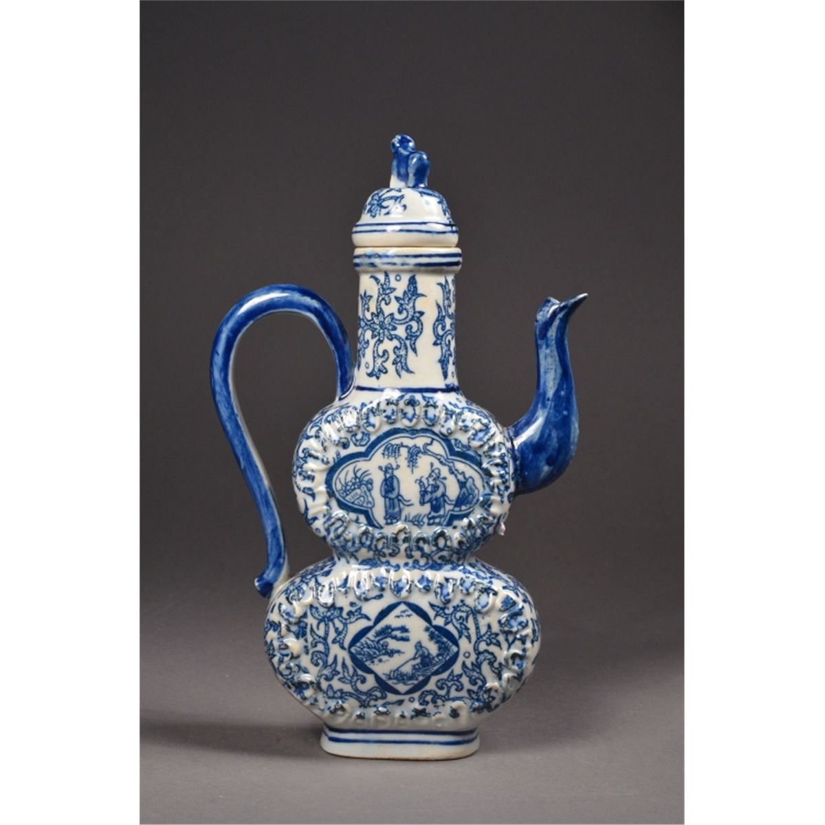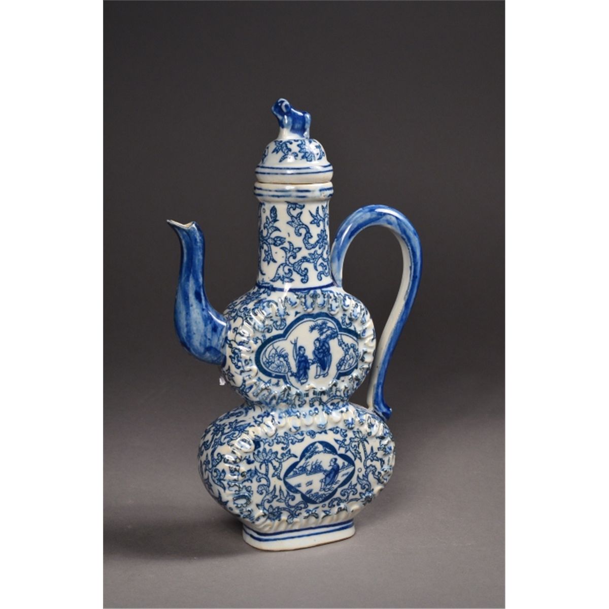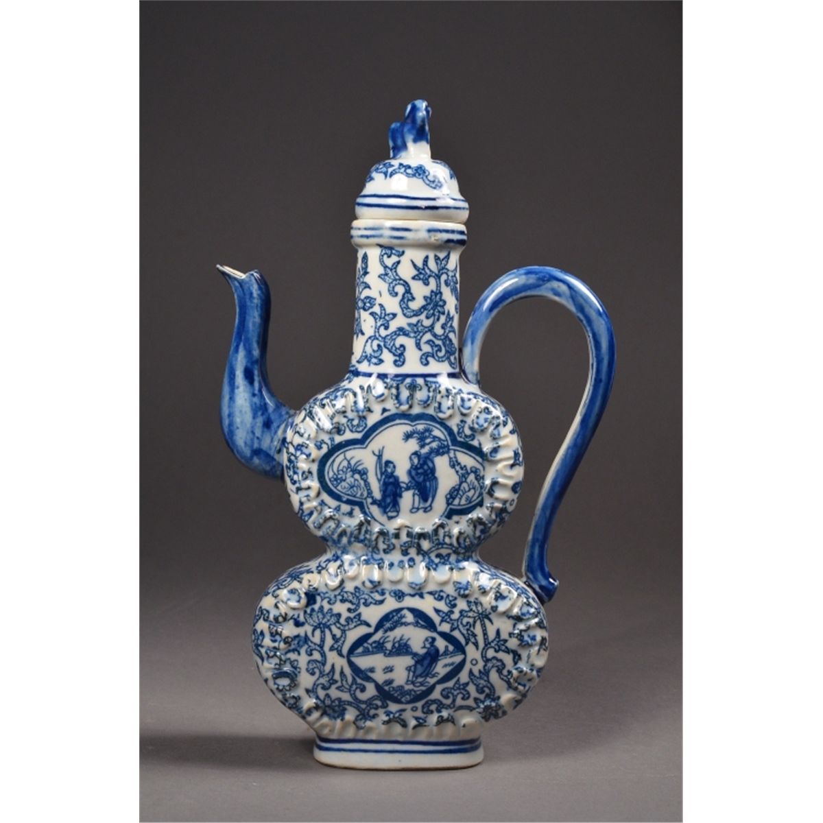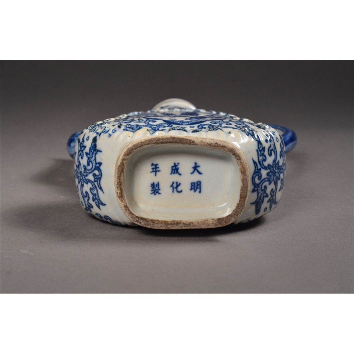 Chinese blue and white porcelain ewer; of flattened form; featuring sages enclosed in quatrefoil cartouche; cover surmounted by fu lion; the neck featuring lotus borne on vines; six-character Ming Chenghua mark on base; 8 3/4" tall, 5 1/8" wide