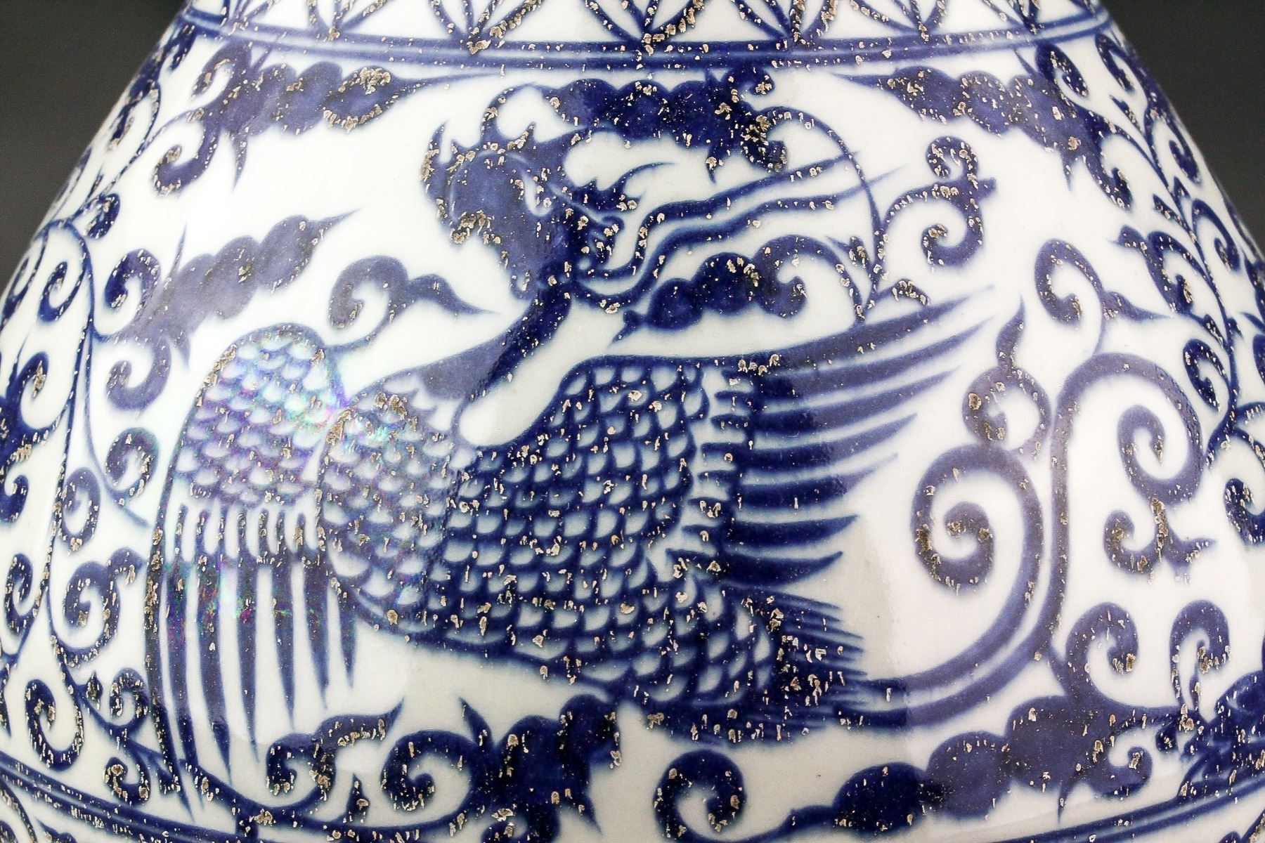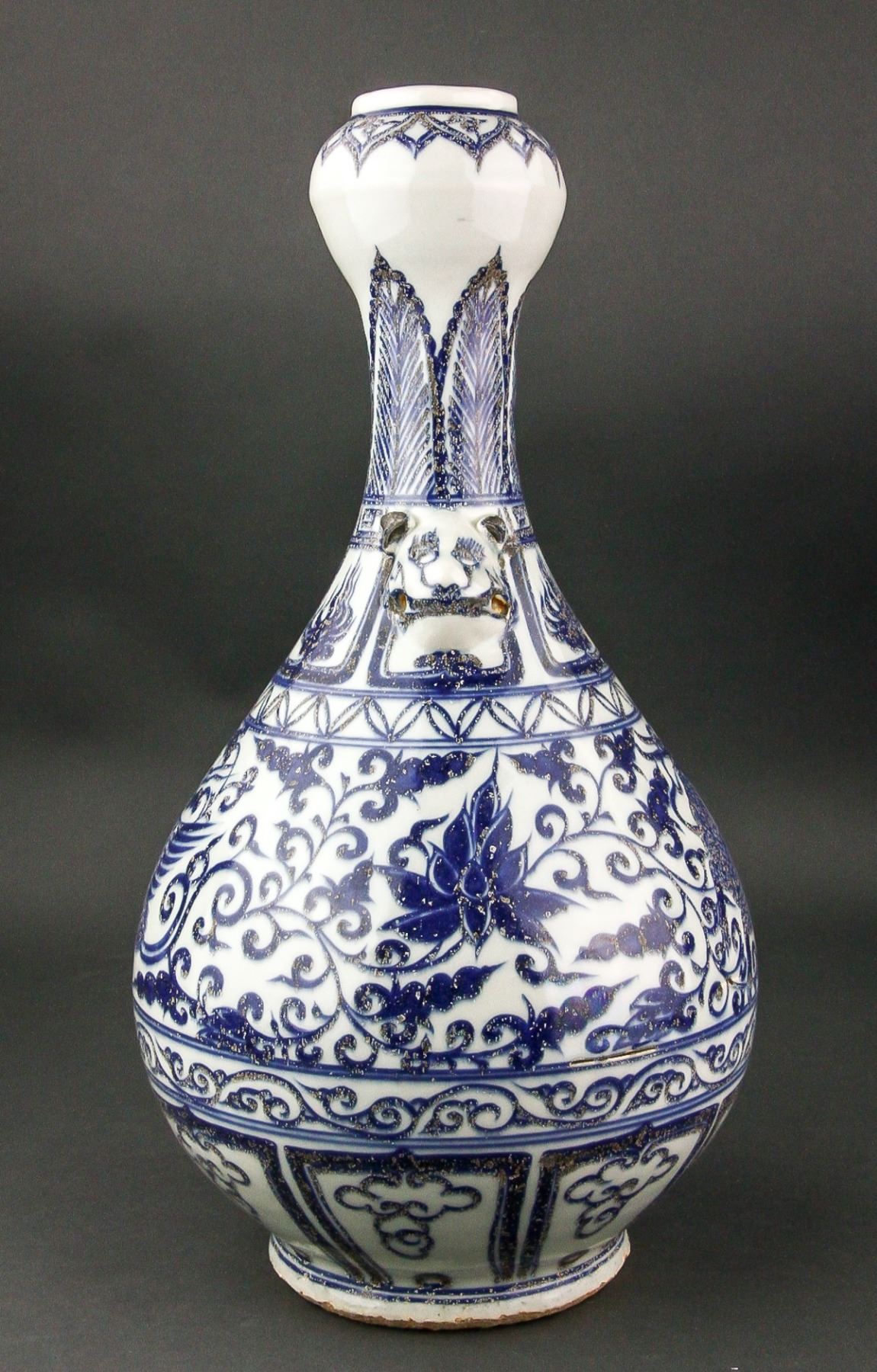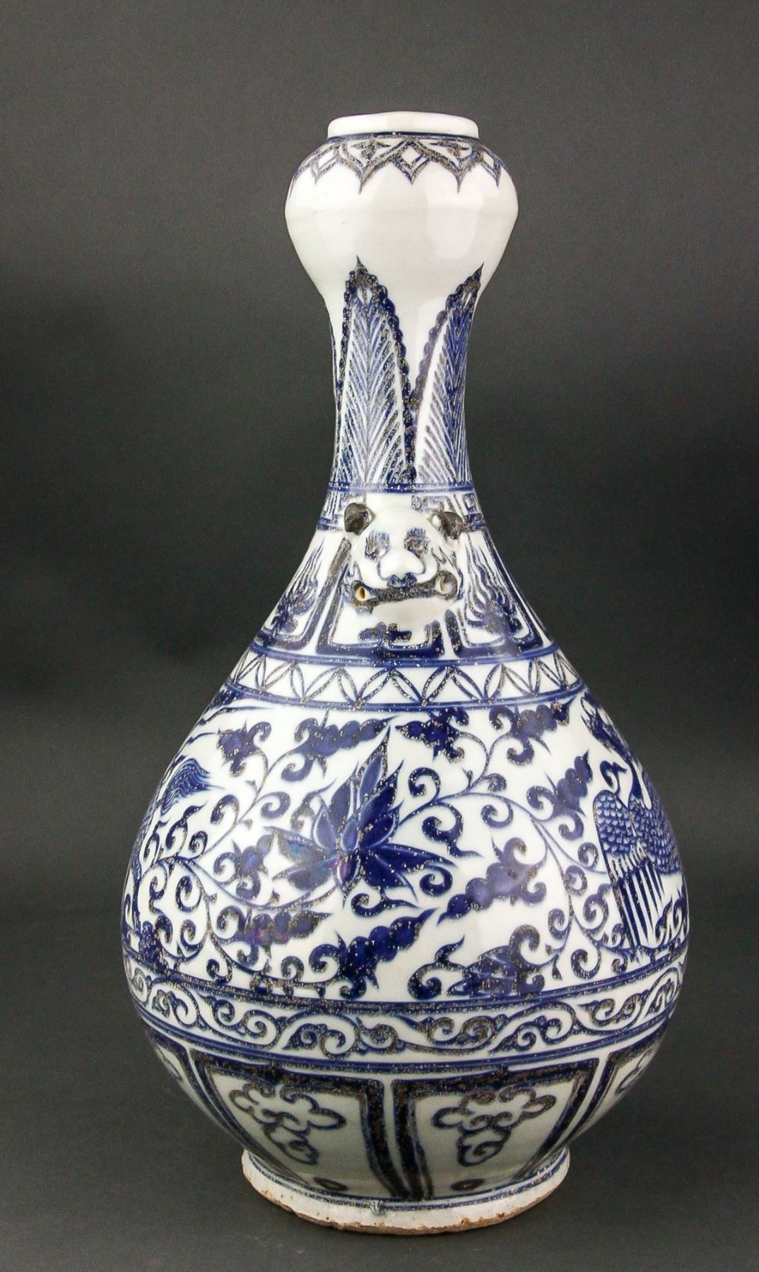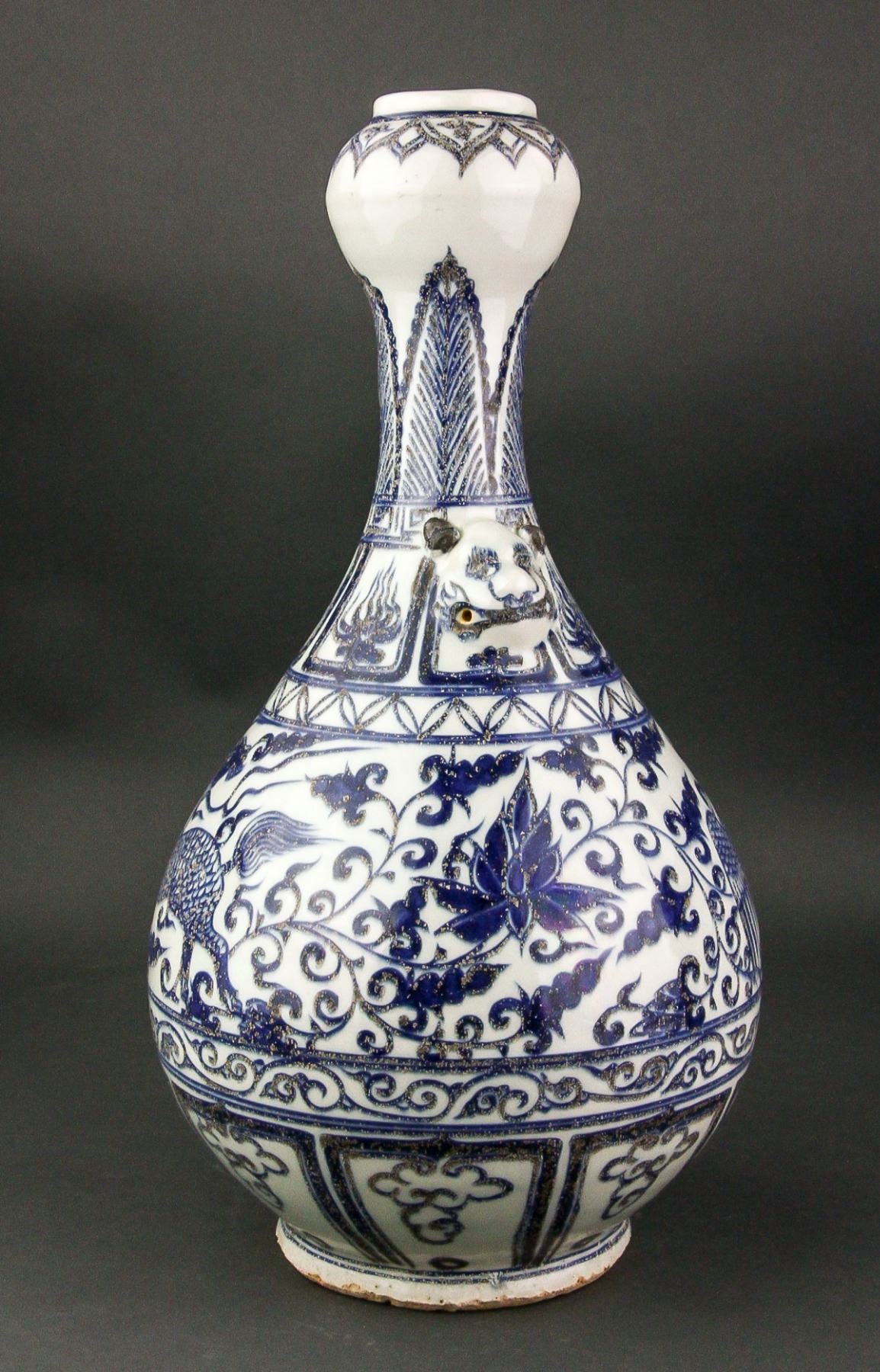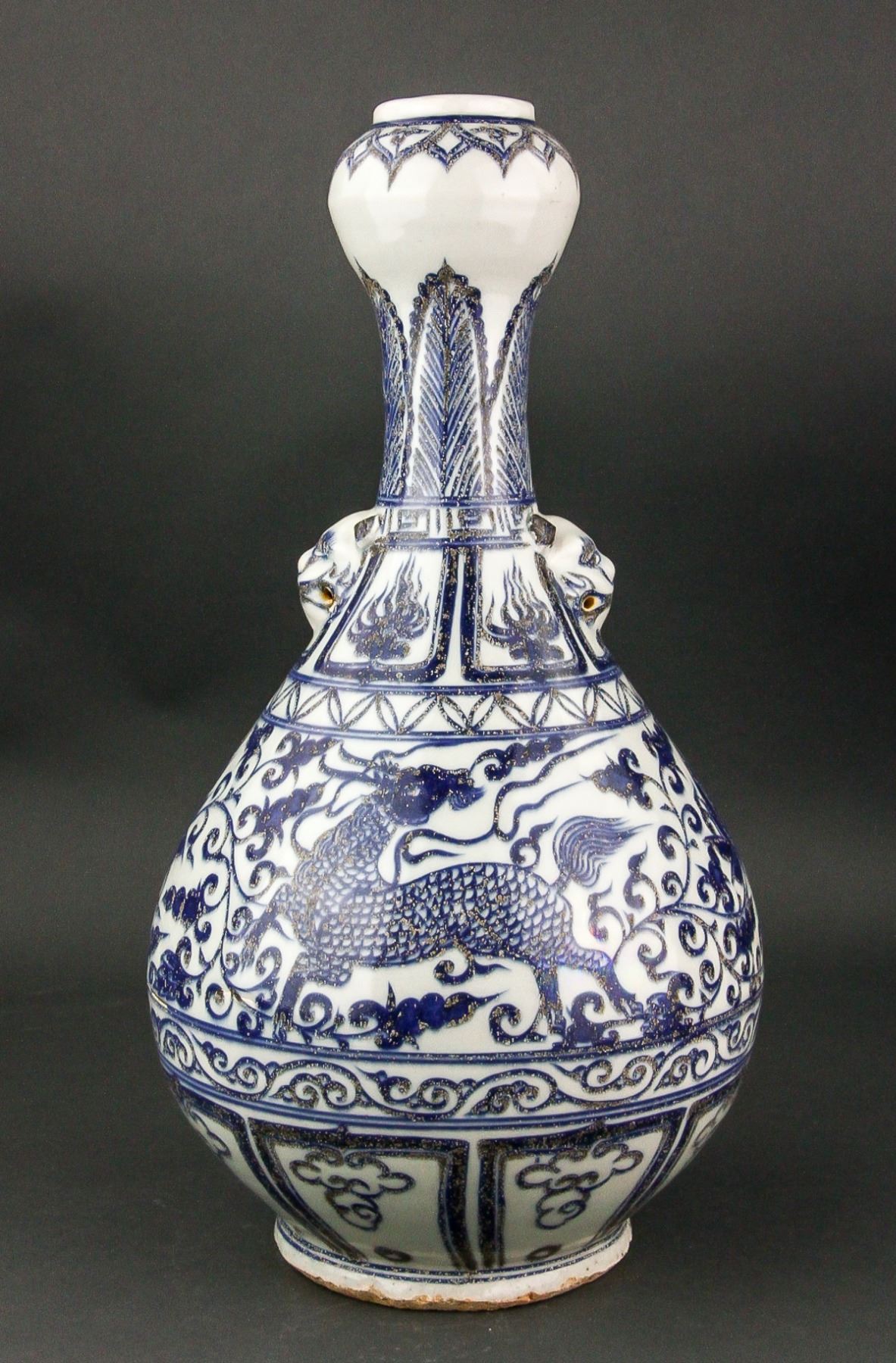 Chinese blue and white porcelain vase; of pear-shaped body with garlic-bulb-shaped mouth rim; the neck flanked by double beast handles; featuring louts and phoenix scrollwork; unglazed base; H: 40 cm, W: 20 cm, 2.5 kg
