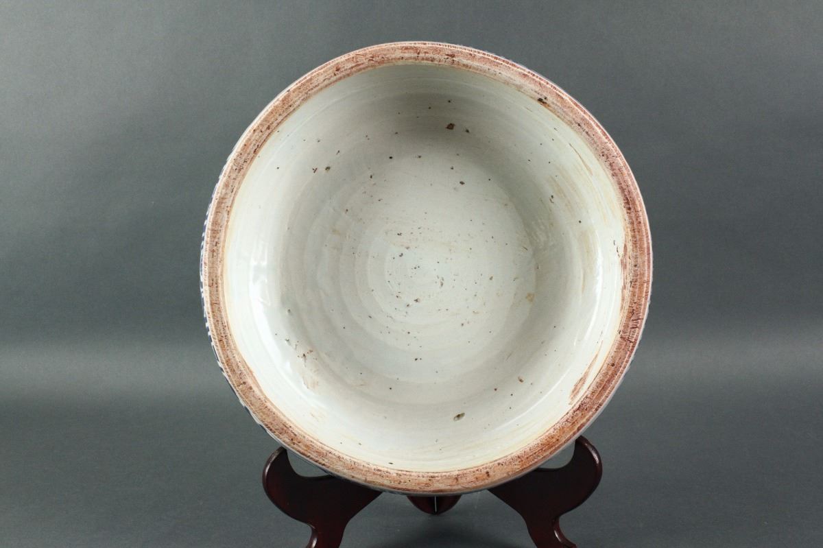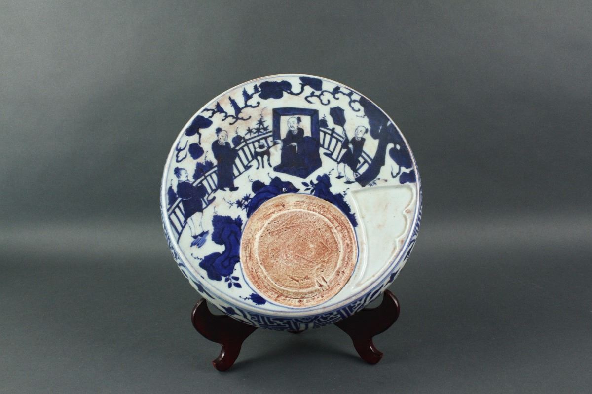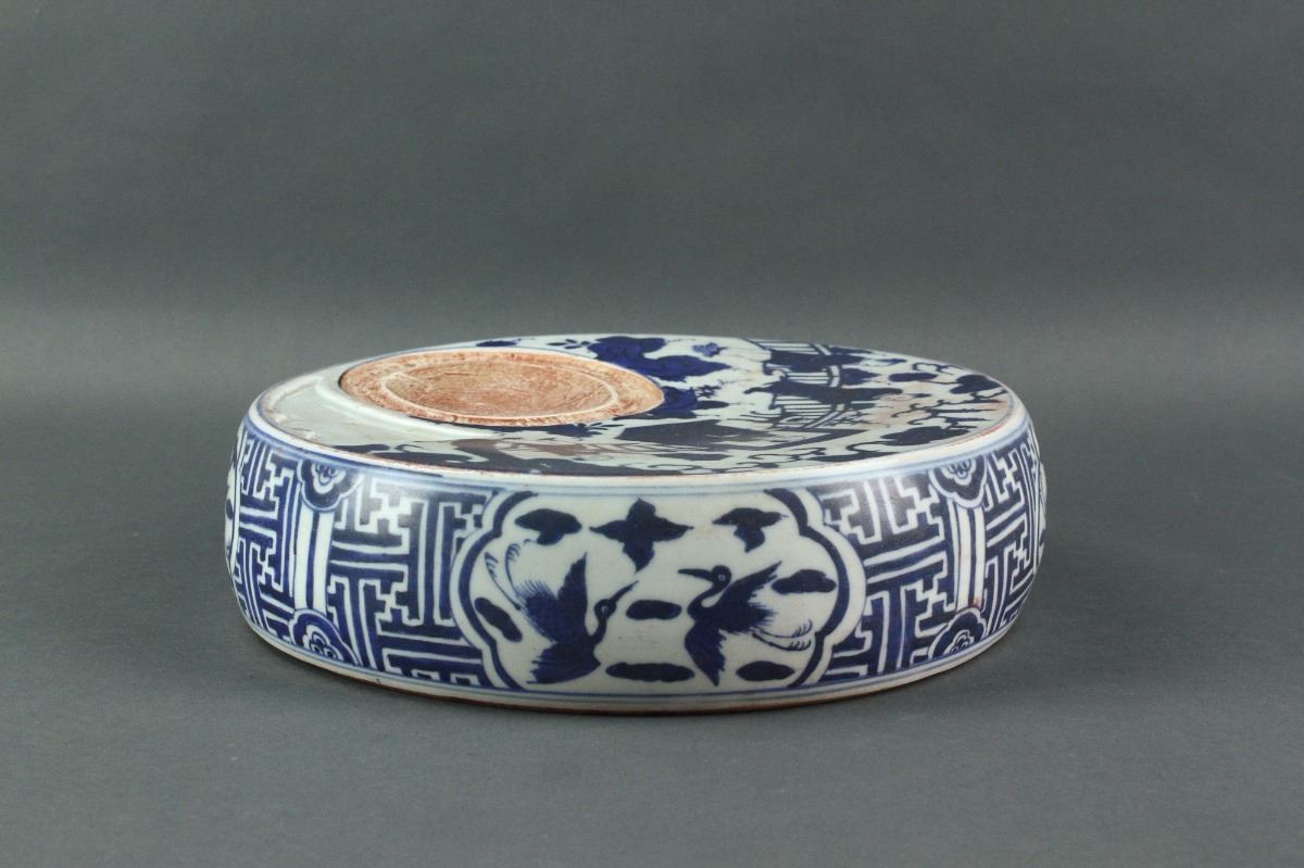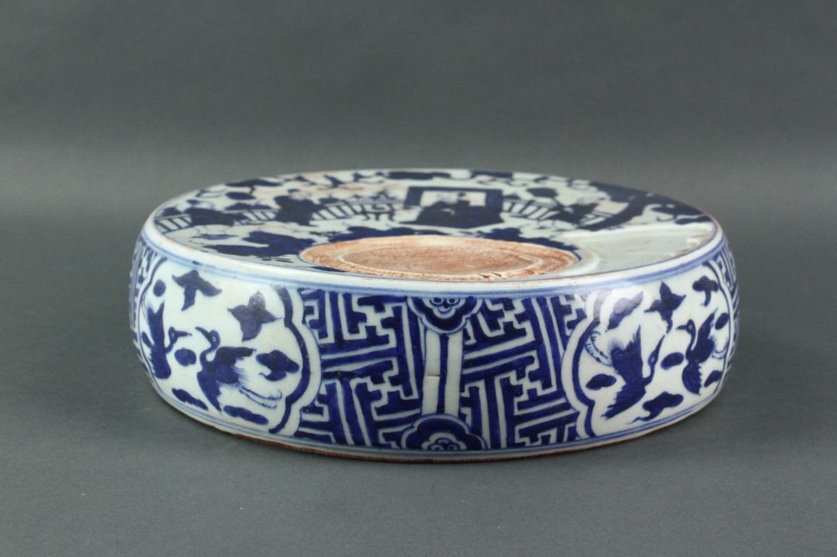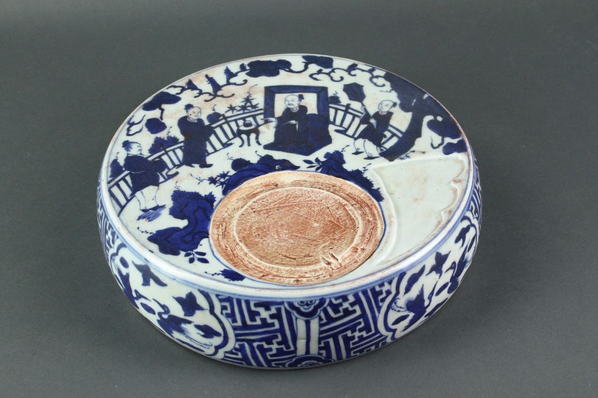 Chinese blue and white porcelain ink pad; of compressed drum form; featuring scholars at courtyard on body; H: 8 cm, D: 31 cm, 3450 grams