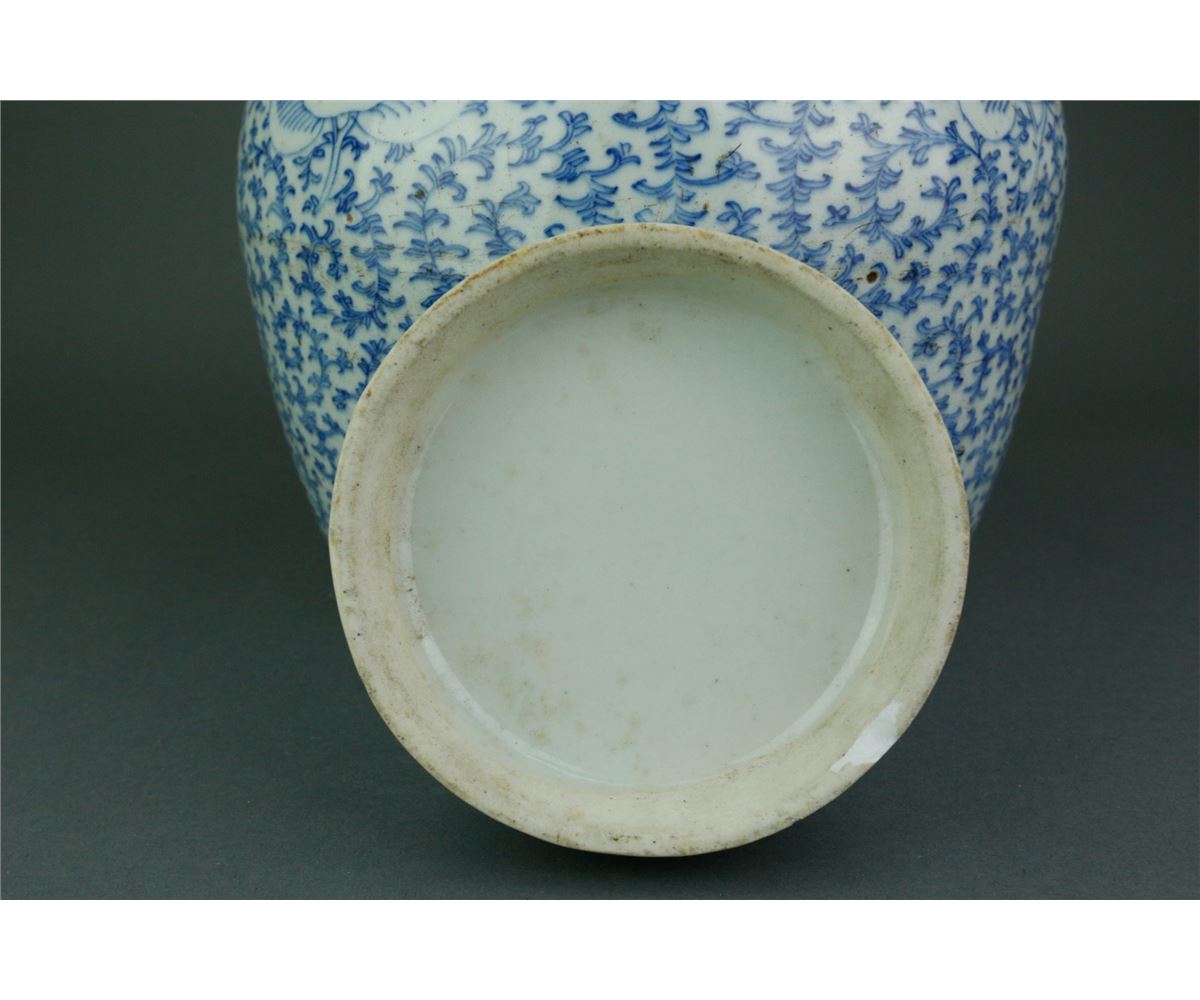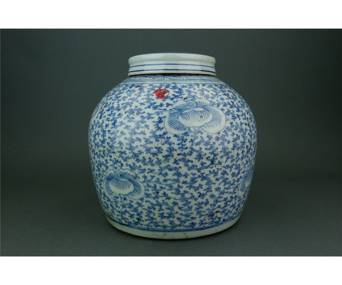 Chinese blue and white ginger jar with cover; featuring orchid and scrolling vine; with red seal on body; H:25 cm, D: 30 cm, 3110 grams