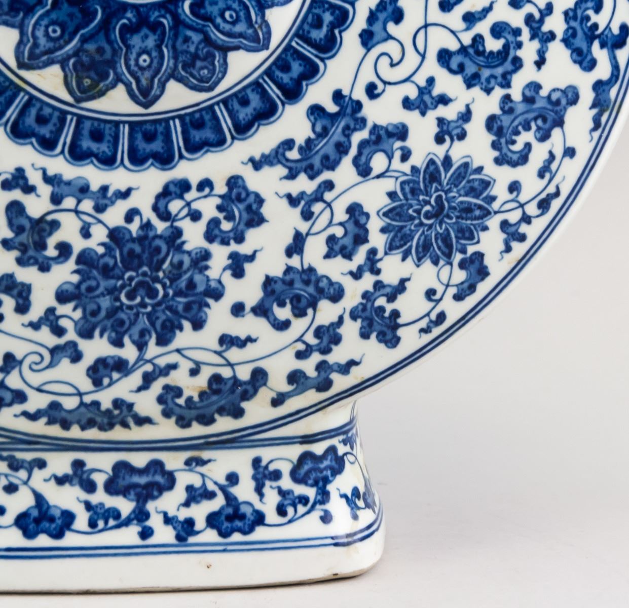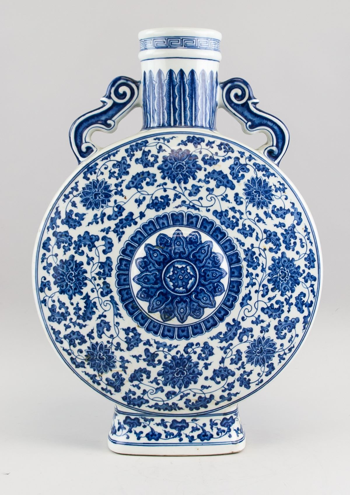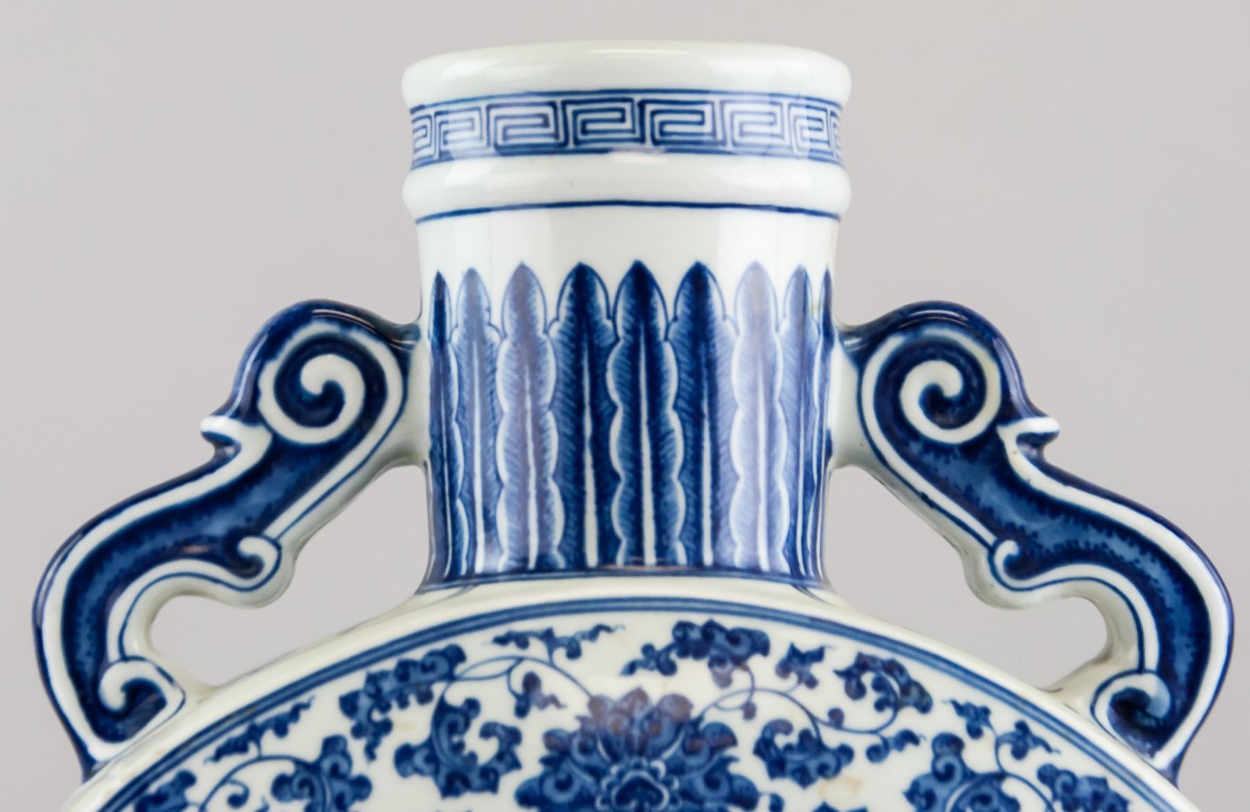 Chinese Qing dynasty blue and white porcelain moon flask. Of flatten round form body. Flanked with curved handles. Painted with floral and leafy pattern. Six-character Qing dynasty Qianlong mark on base. 49 x 39 cm, 6 kg