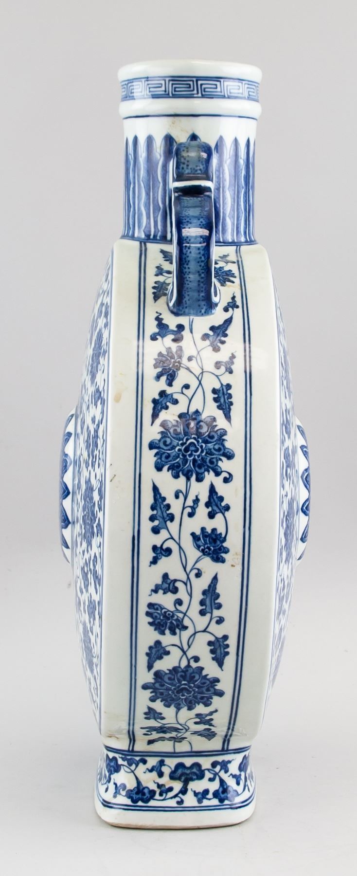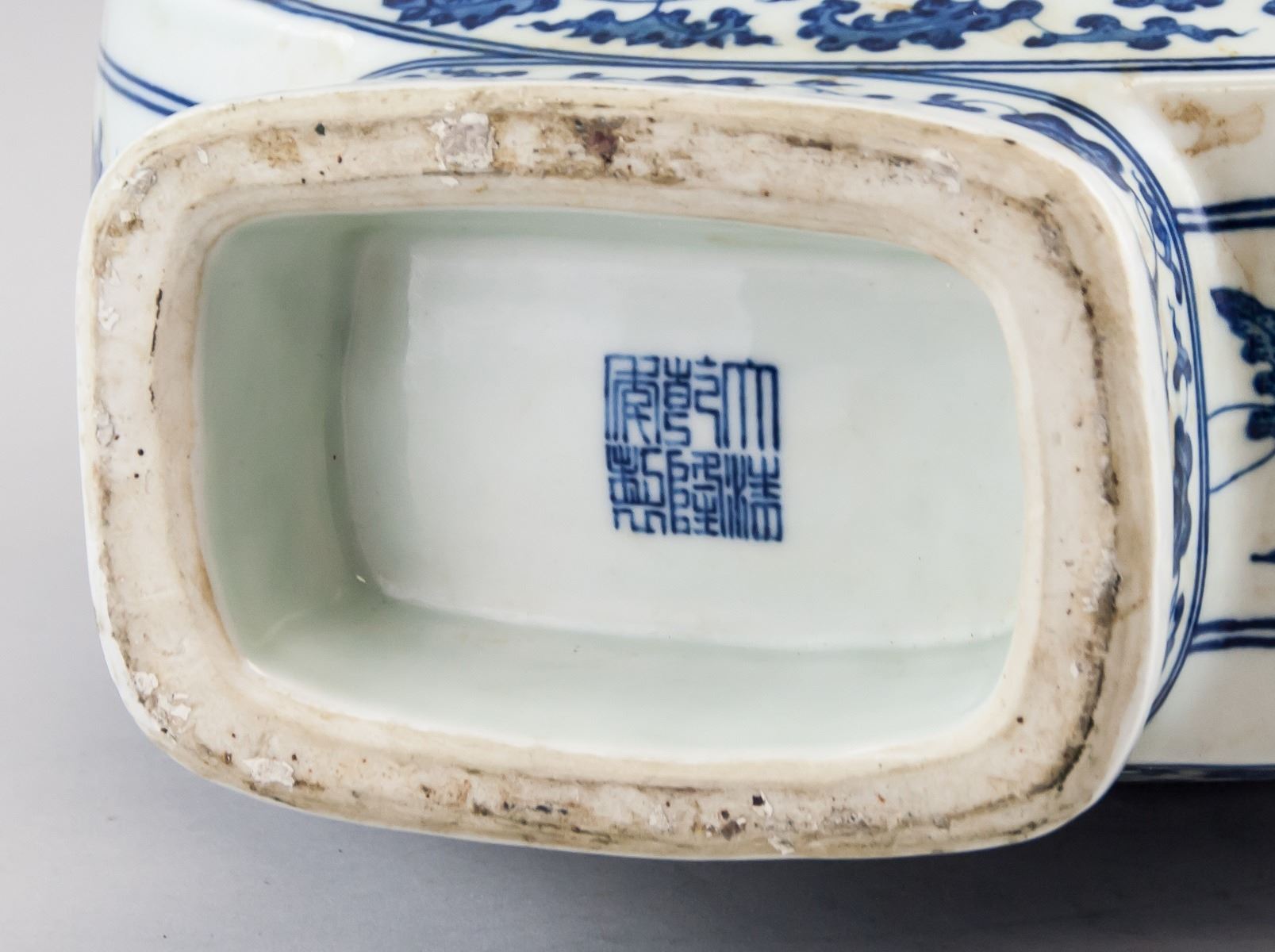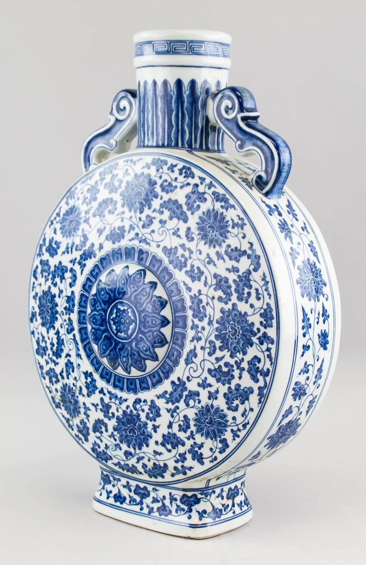 Chinese Qing dynasty blue and white porcelain moon flask. Of flatten round form body. Flanked with curved handles. Painted with floral and leafy pattern. Six-character Qing dynasty Qianlong mark on base. 49 x 39 cm, 6 kg