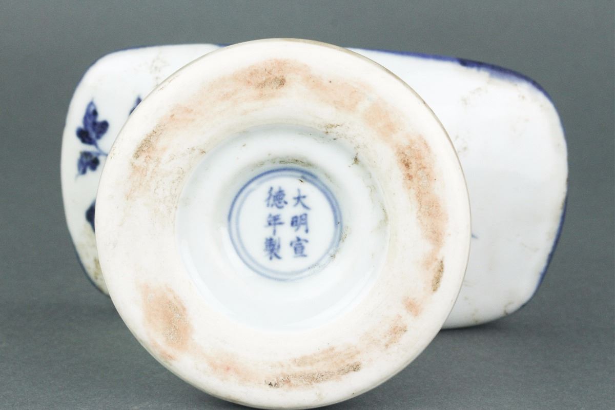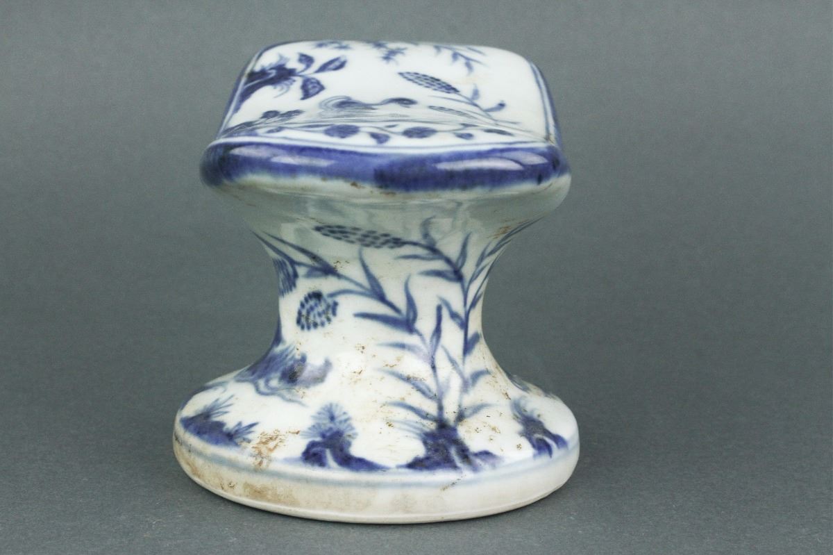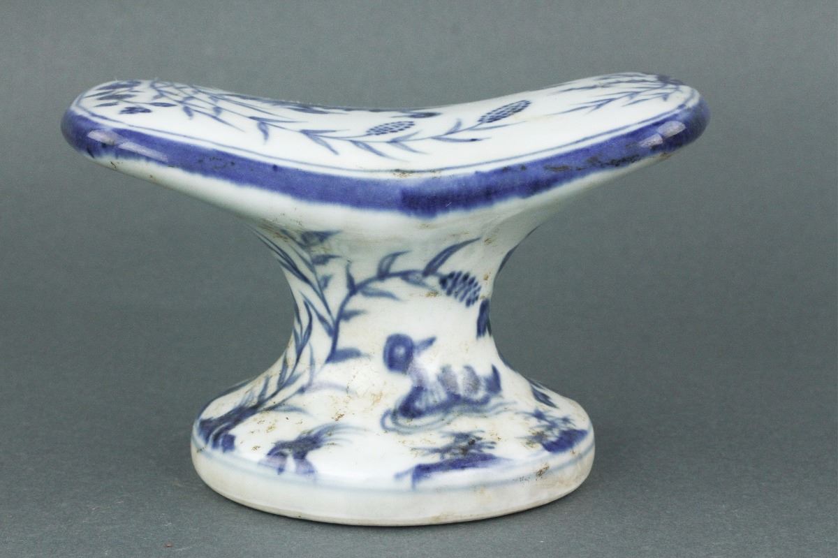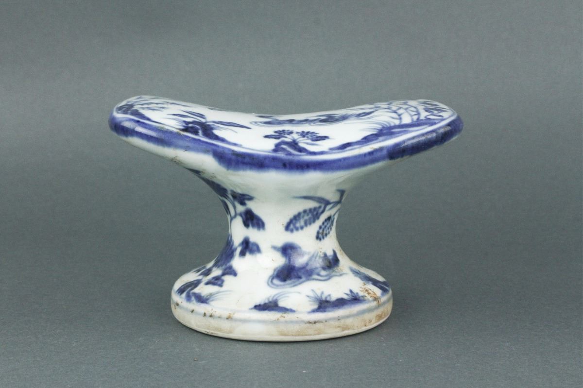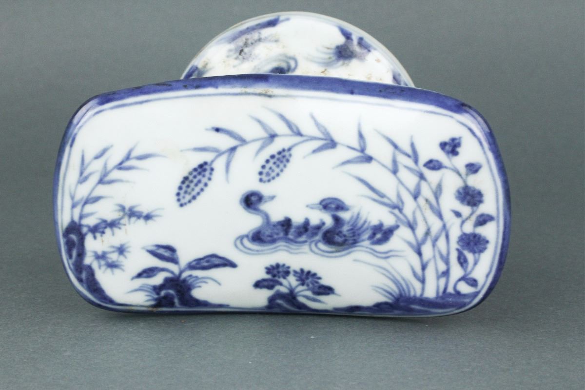 Chinese blue and white porcelain pillow; of curved top connecting to a pedestal base; featuring pair of mandarin ducks on the pond; six-character Xuande mark on base; H: 8 cm, W: 16 cm, 1213 grams
