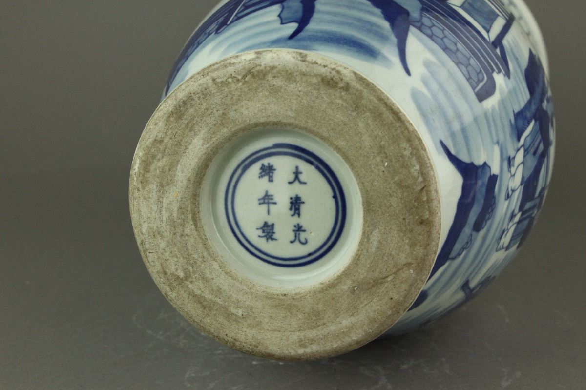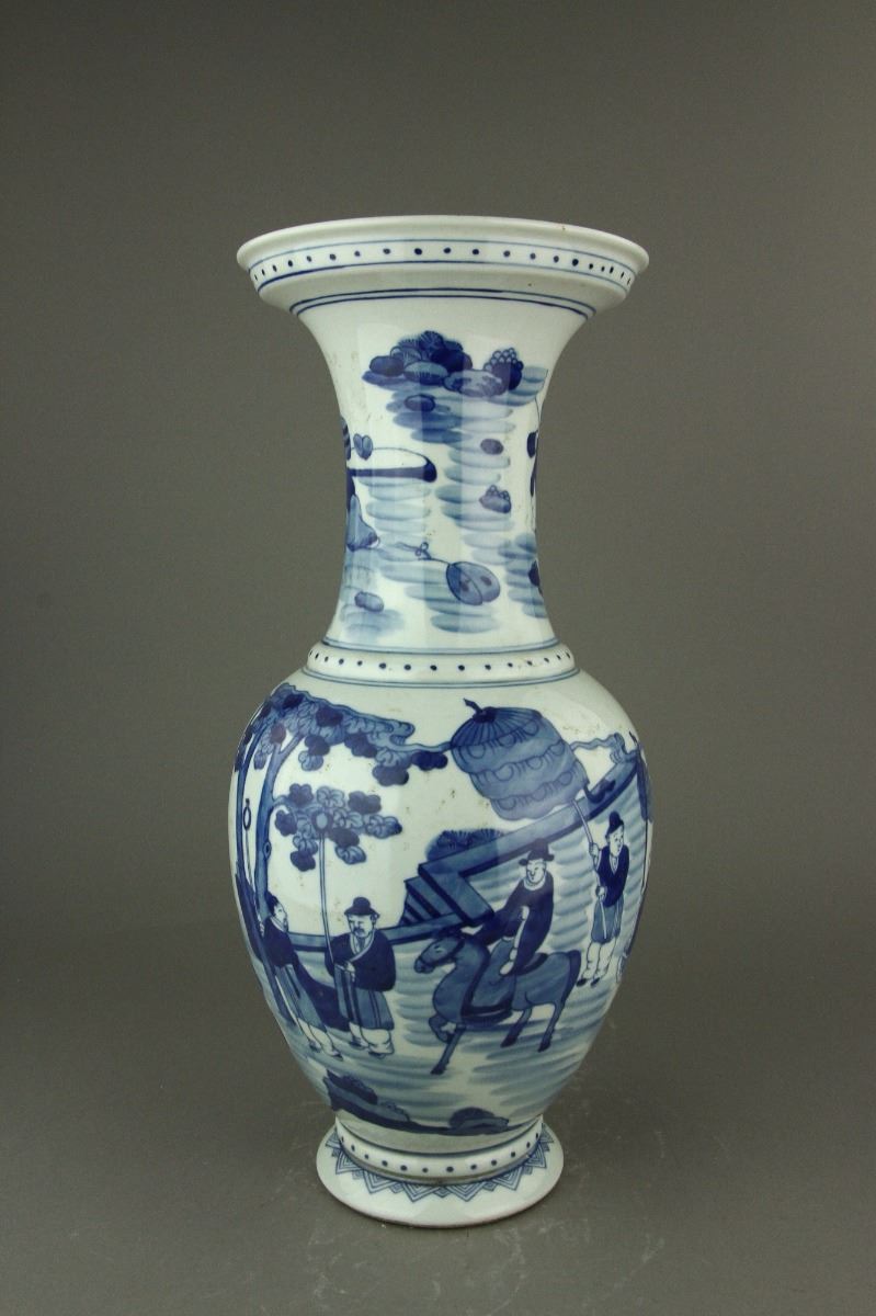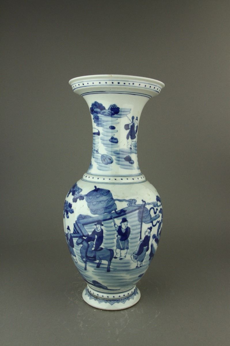 Chinese blue and white porcelain vase; of ovoid body with waisted neck and galleried rim; painted with the emperor in royal progress; six-character Guangxu mark on base; H: 41 cm, D: 17 cm, 2929 grams