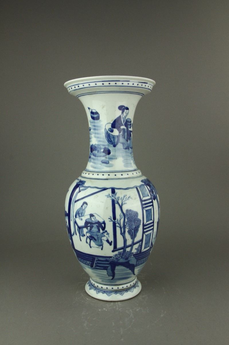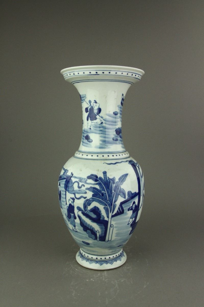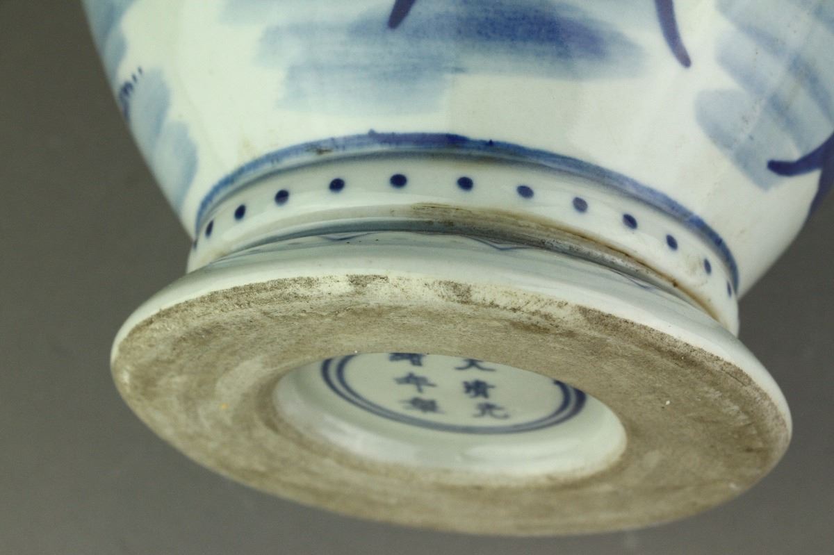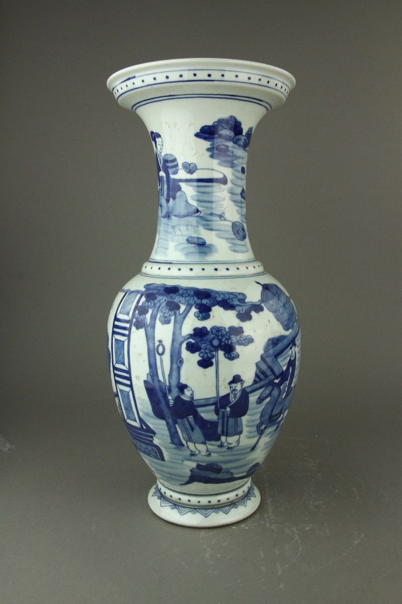 Chinese blue and white porcelain vase; of ovoid body with waisted neck and galleried rim; painted with the emperor in royal progress; six-character Guangxu mark on base; H: 41 cm, D: 17 cm, 2929 grams