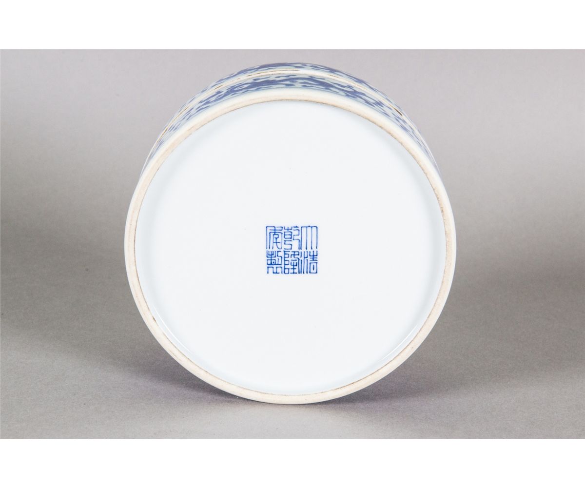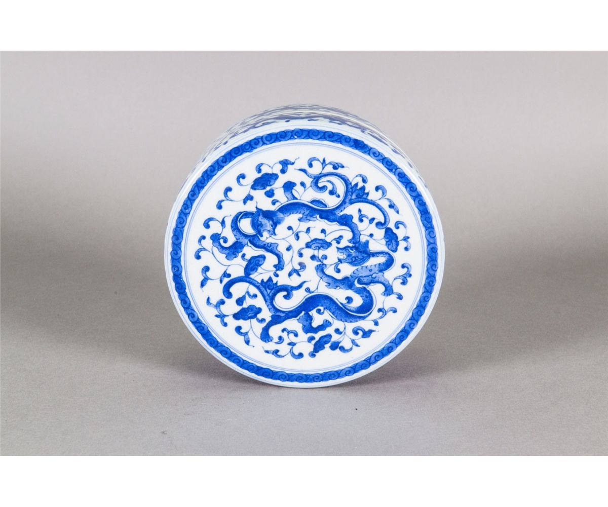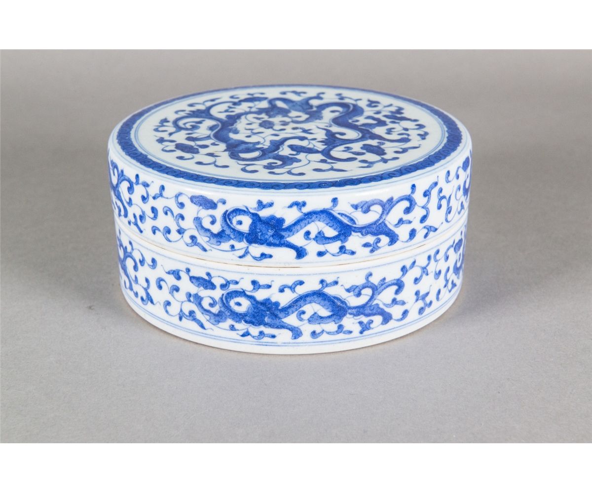 Chinese blue and white round porcelain box; comprised of two layers; featuring dragon and clouds patterns; six-character Qianlong mark on base; H: 7 cm, D: 15 cm, 749 grams