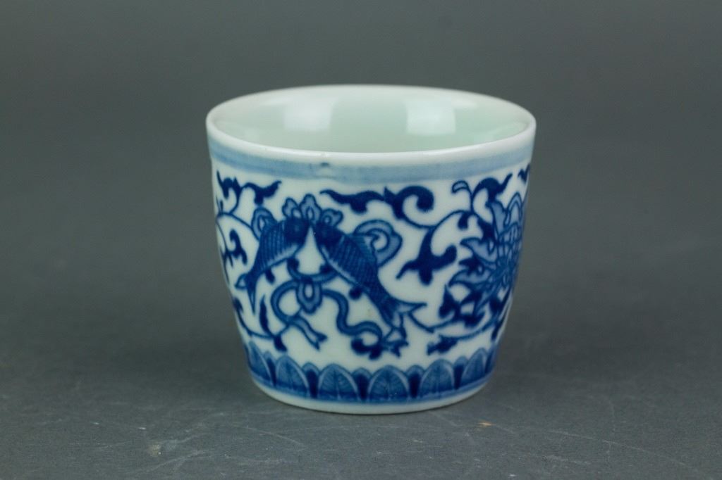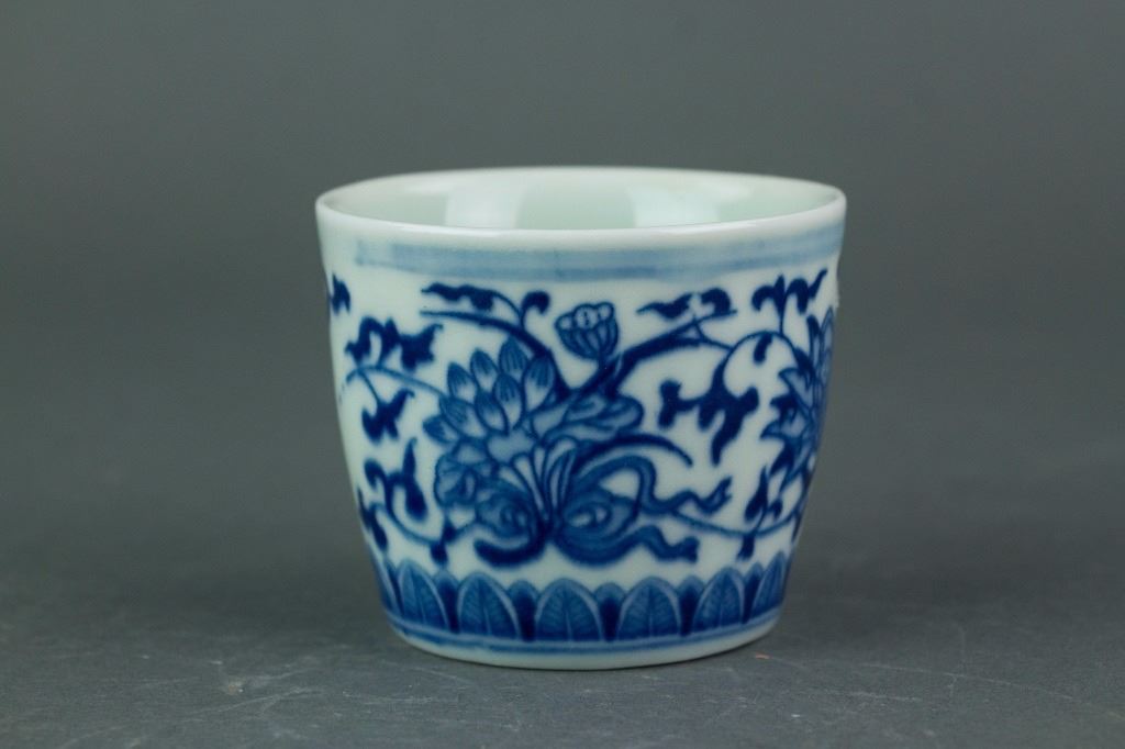 Chinese blue and white porcelain cup; of cylindrical body; the exterior painted with auspicious emblems amongst leafy scrolls; six-character Qianlong mark on base; H: 5 cm, W: 6 cm, 82 grams