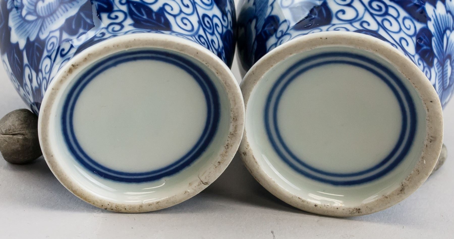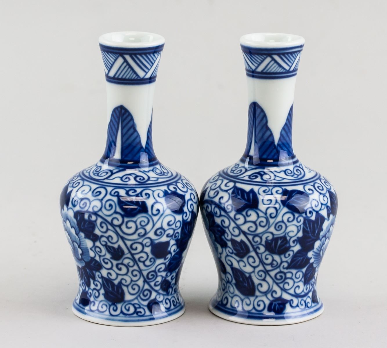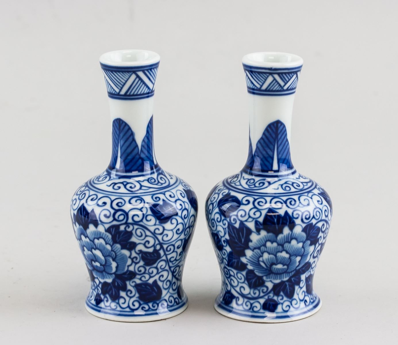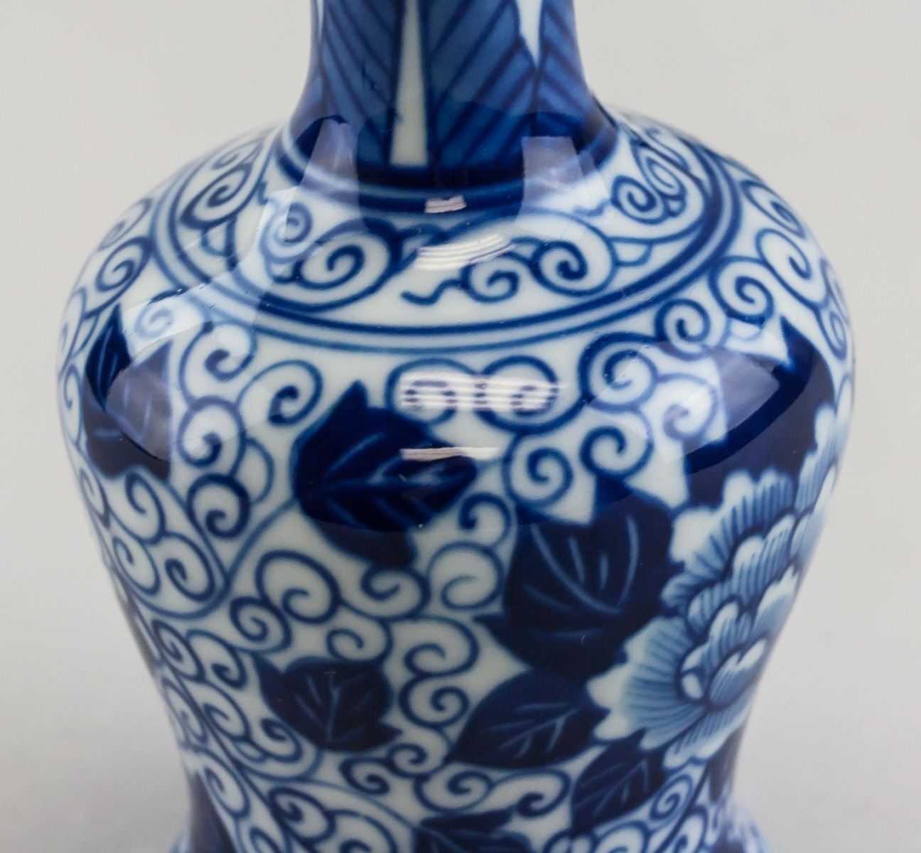 Pair of Chinese Blue and White vases. Of globular body tapering to bottom, with long and slender necks. Featuring flower and swirls. 12 x 6 cm (4.72 x 2.36 in)