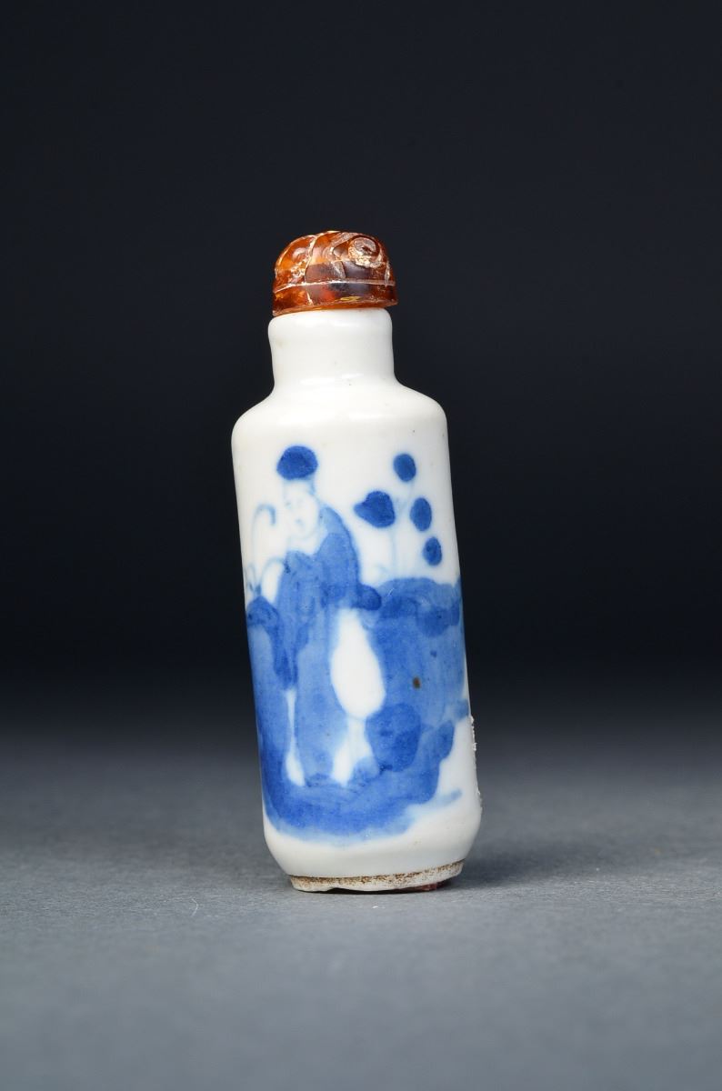Chinese blue and white porcelain snuff bottle; cylindrical body featuring Immortal in underglazed blue; Jian Ding Export Stamp seal; H: 7 cm, D: 2 cm