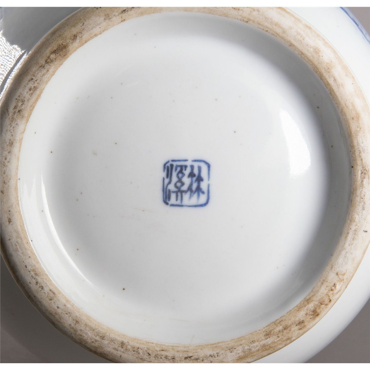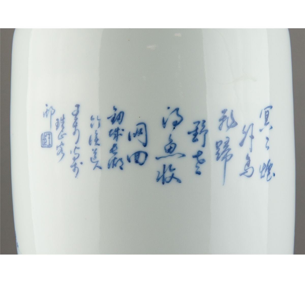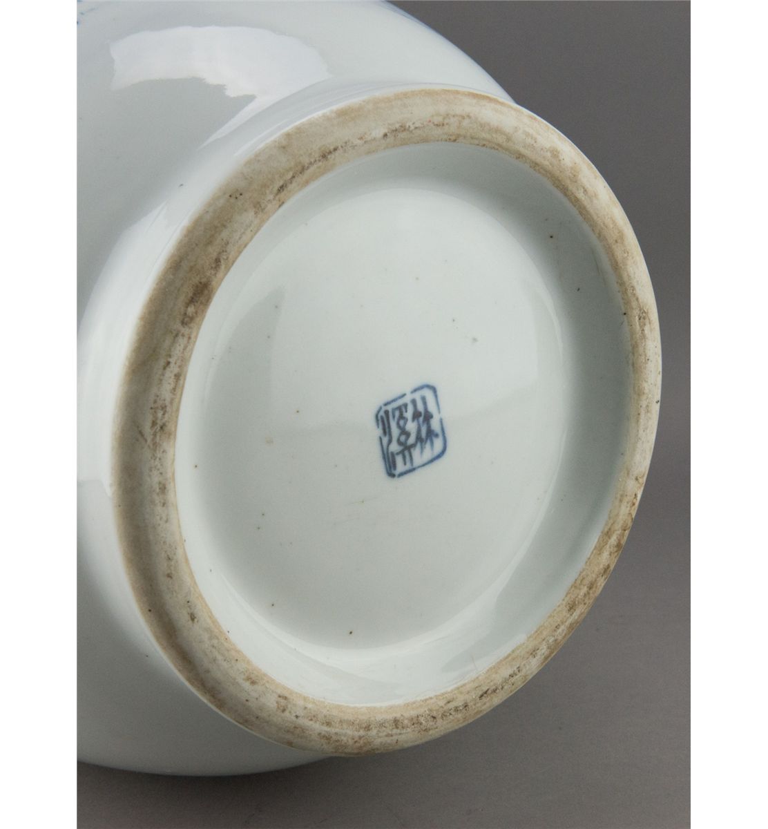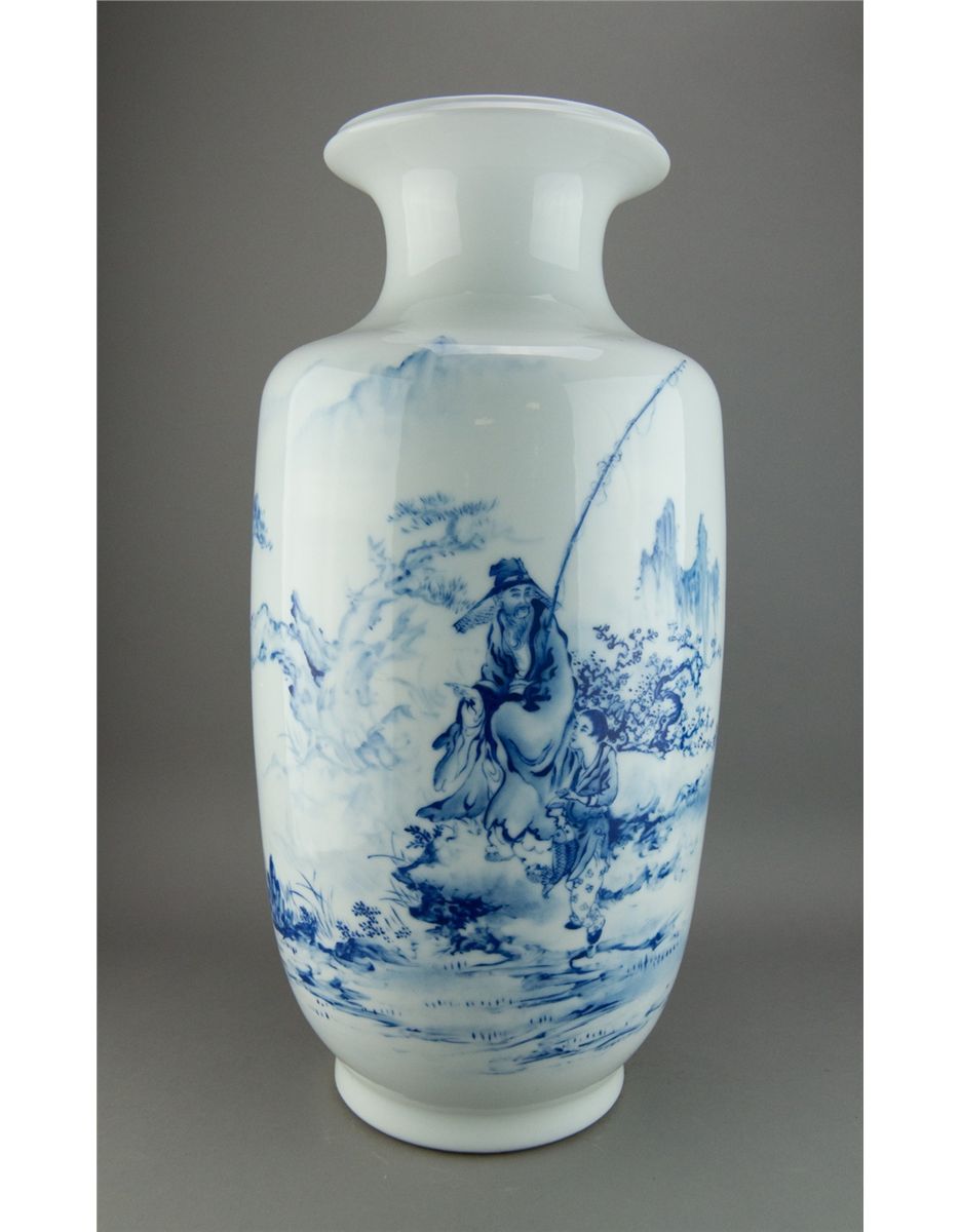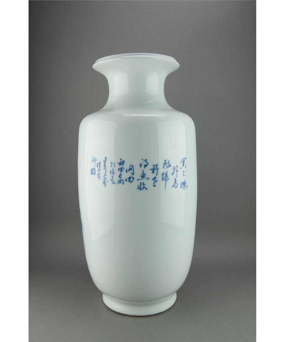 Chinese blue and white porcelain vase; ovoid body with flared mouth featuring figural scene and script, supported on short foot rim; H: 60 cm, D: 23 cm