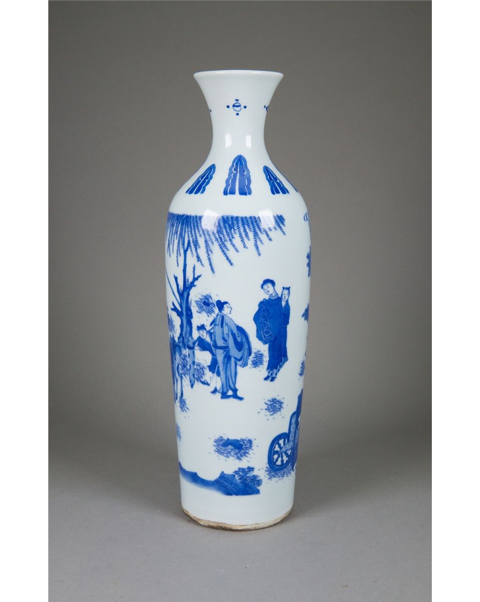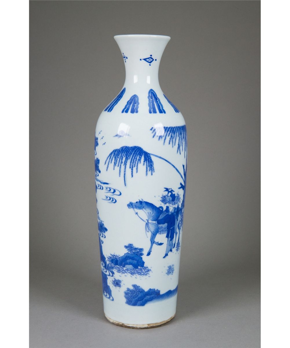 Chinese blue and white porcelain vase; of slim cylindrical body with neck and slightly everted rim; decorated on the body with a painting of figural landscape scene; H: 39.5 cm, W: 13 cm, 1972 grams