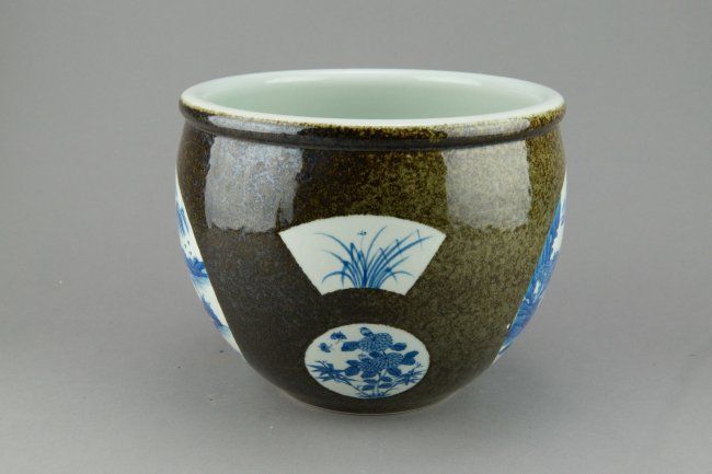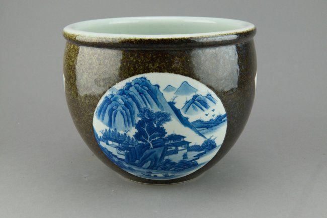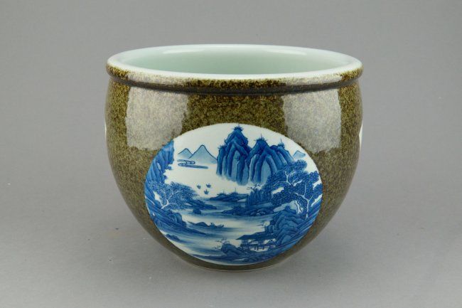 Chinese blue and white porcelain jar; featuring blue and white windows of landscape scenery; six-character mark on base; H: 18 cm, D: 23 cm, 1746 grams