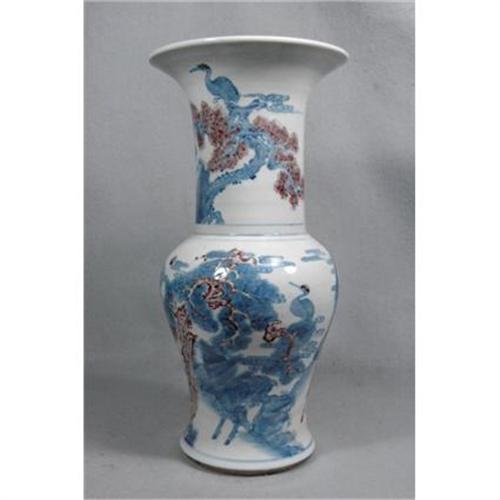 Chinese Blue,White and Red Porcelain Beaker Vase.Decorate with deers and mountain. Good condition. 15" high.