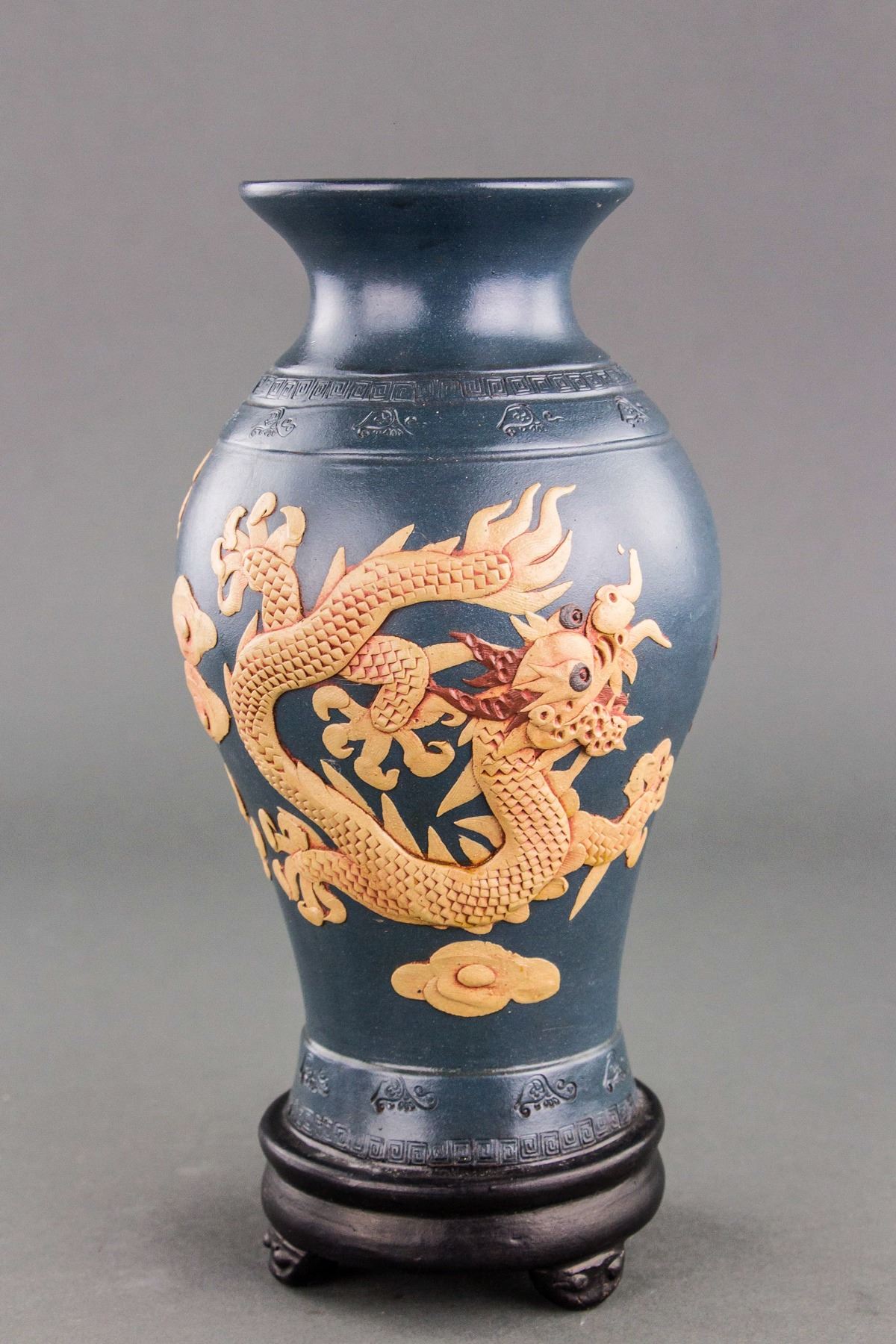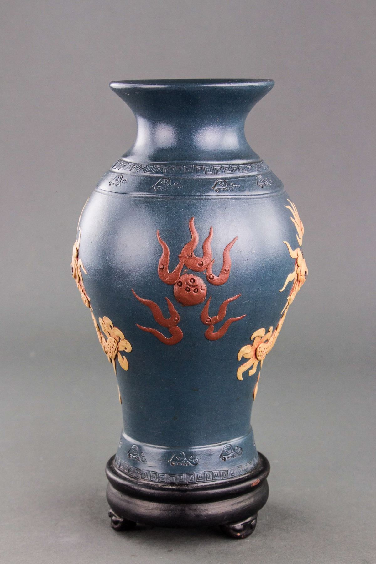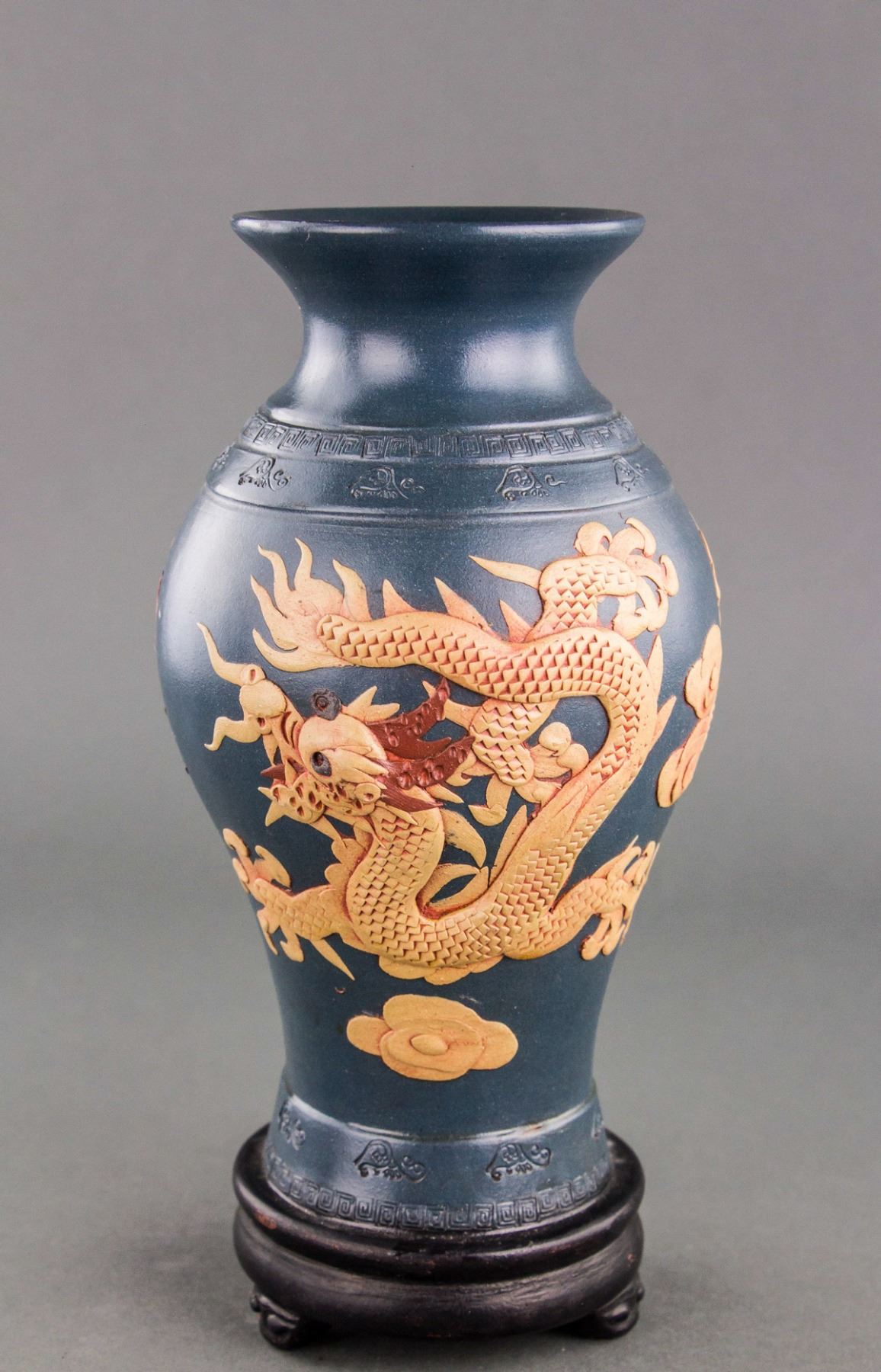 Chinese blue zisha vase; of baluster form body; carved with dragon and fire balls; accompanied with wood stand; 23.5 cm x 11.5 cm, 1261 grams