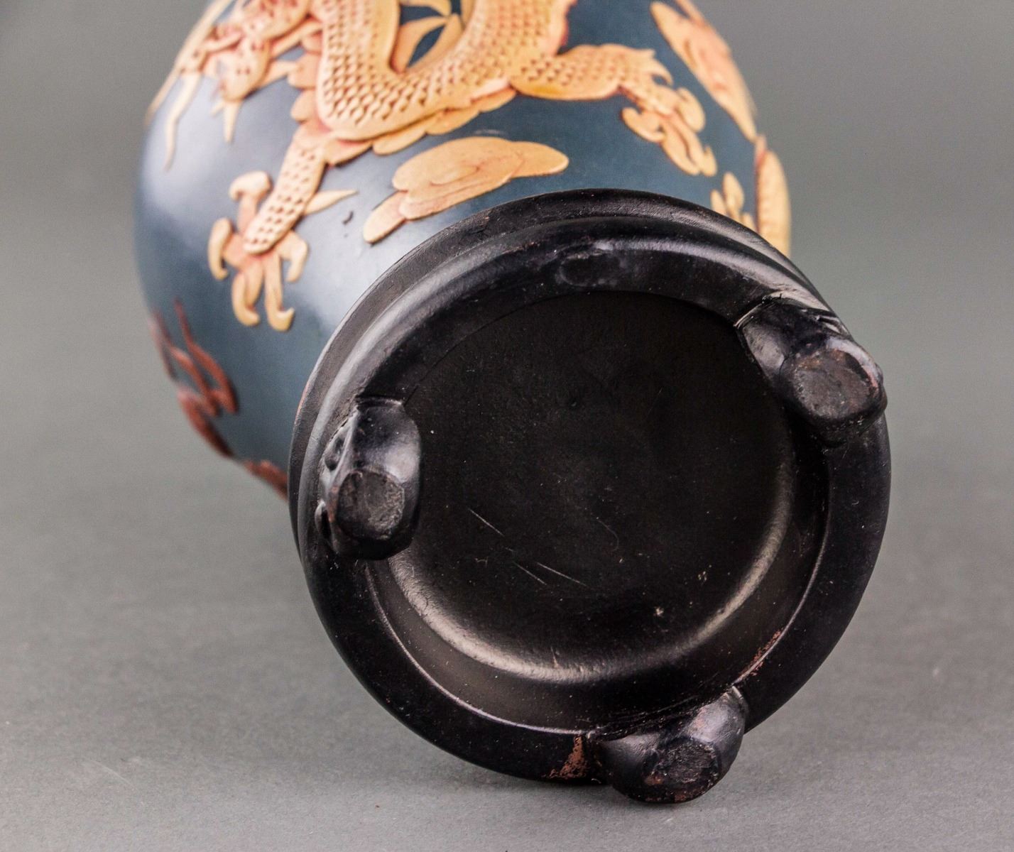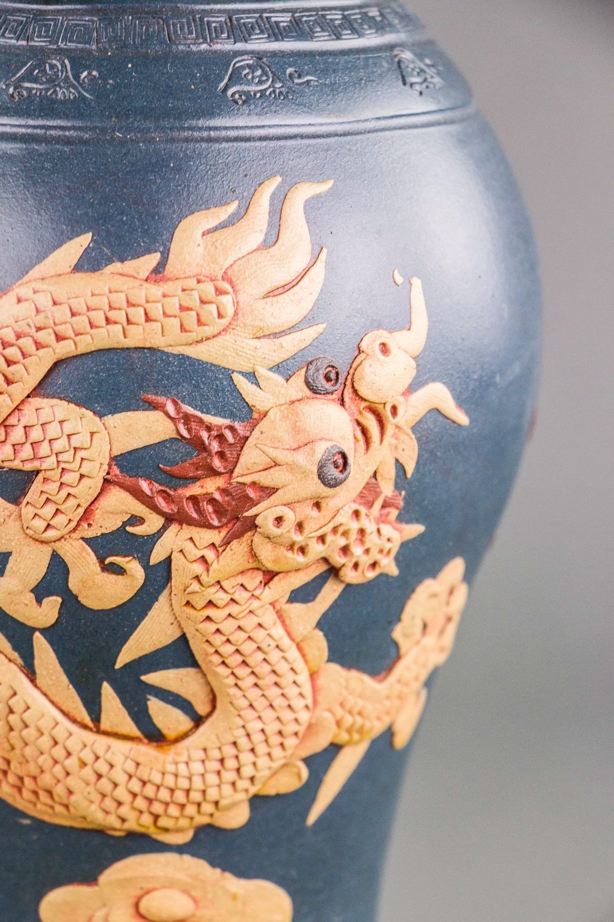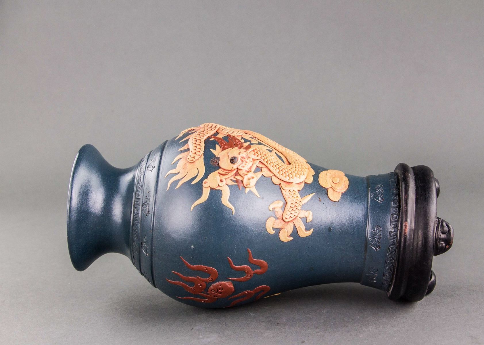 Chinese blue zisha vase; of baluster form body; carved with dragon and fire balls; accompanied with wood stand; 23.5 cm x 11.5 cm, 1261 grams