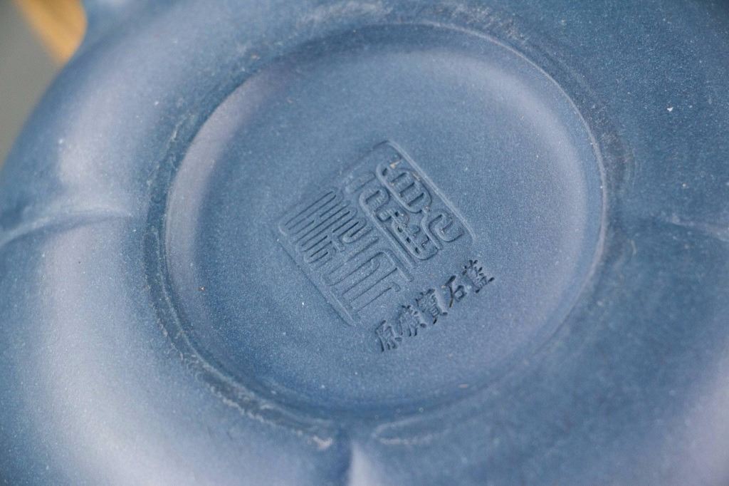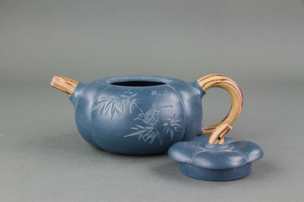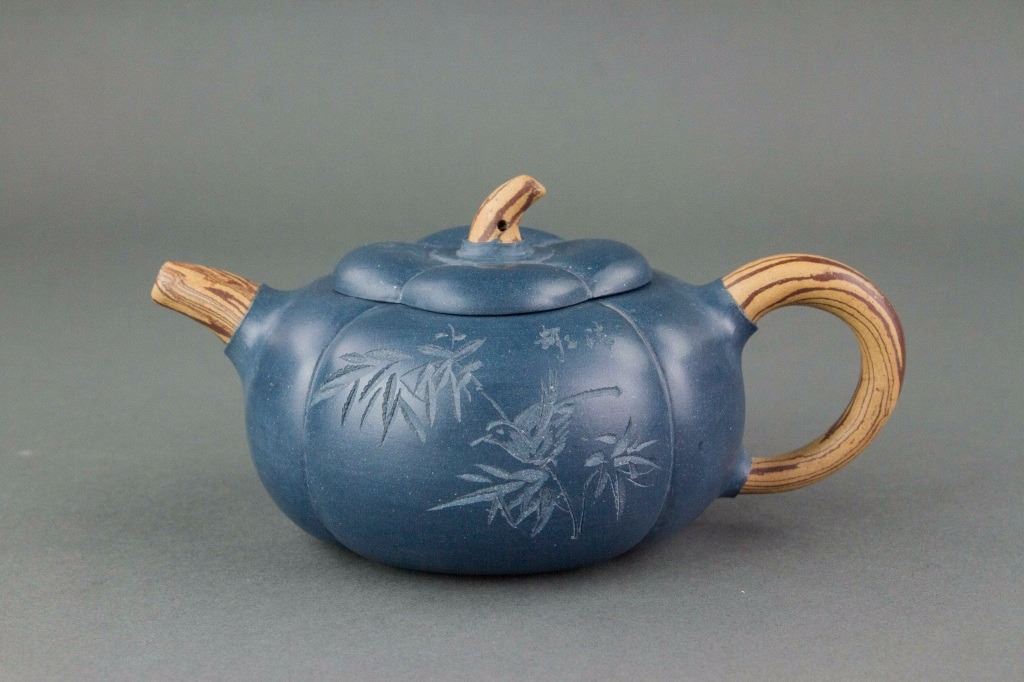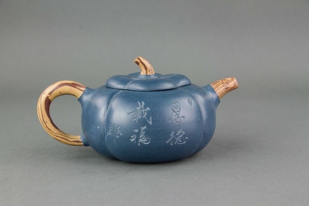 Chinese blue Zisha teapot; of pumpkin shape body with melon stem form knobbed cover; flanked with melon stem form spout and handle; body carved with bamboo and Chinese calligraphy "Hou De Zai Hu"; attribute to Gu Jinzhou (1915-1996); Gu Jingzou' mark and "Yuan Kuang Bao Shi Lan" mark on base; 8 cm x 16.5 cm, 300 grams