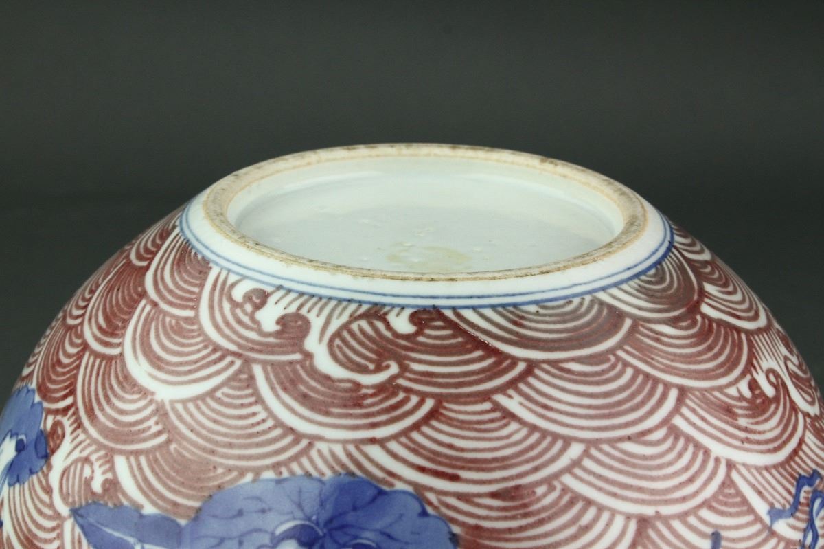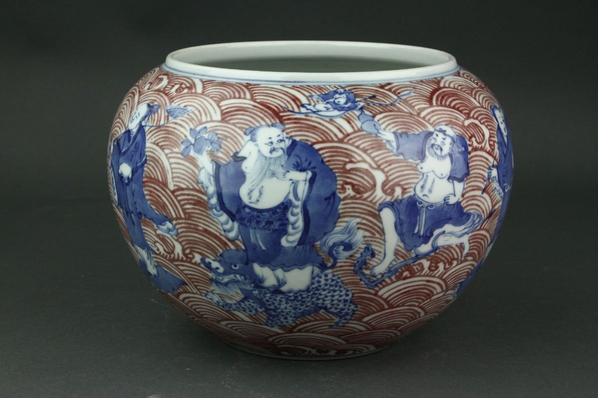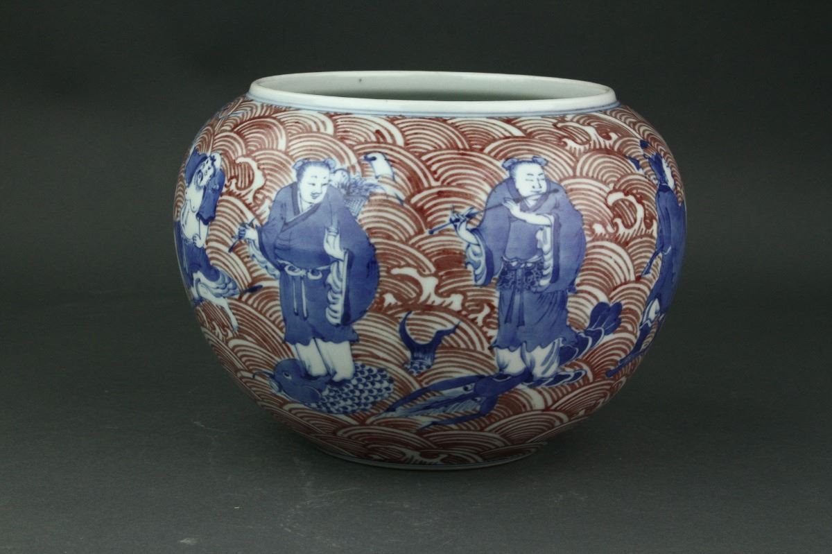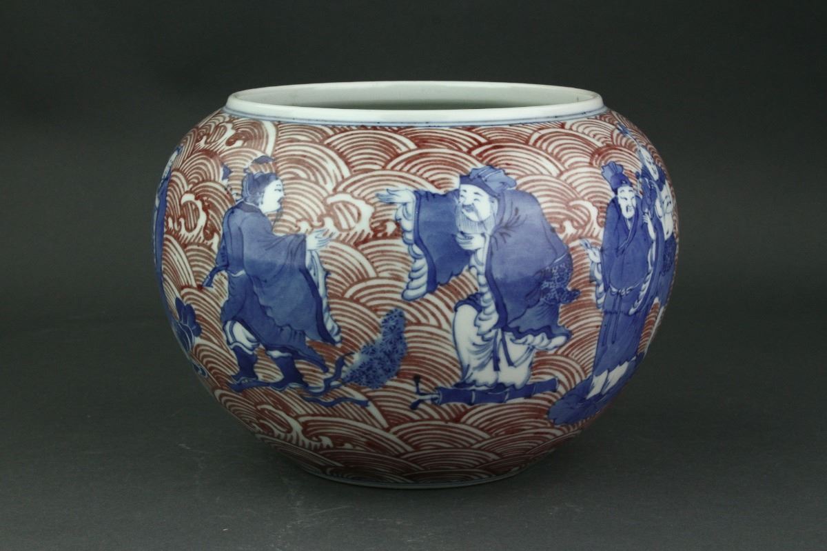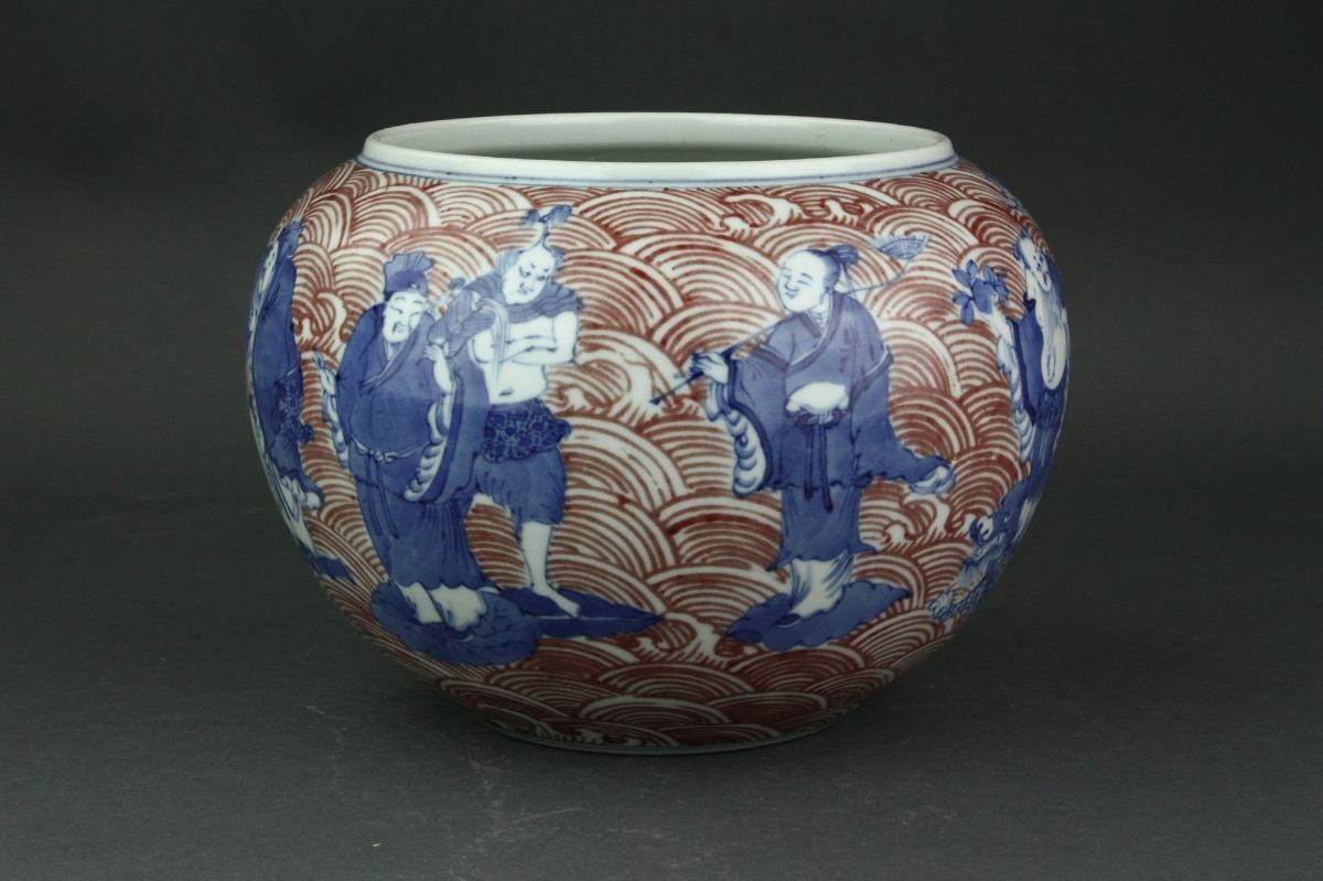 Chinese copper red porcelain jar; of compressed globular form; featuring eight immortals crossing the sea; with mixed underglazed use of cobalt blue and copper red paint; H: 14 cm, D: 24 cm, 1671 grams