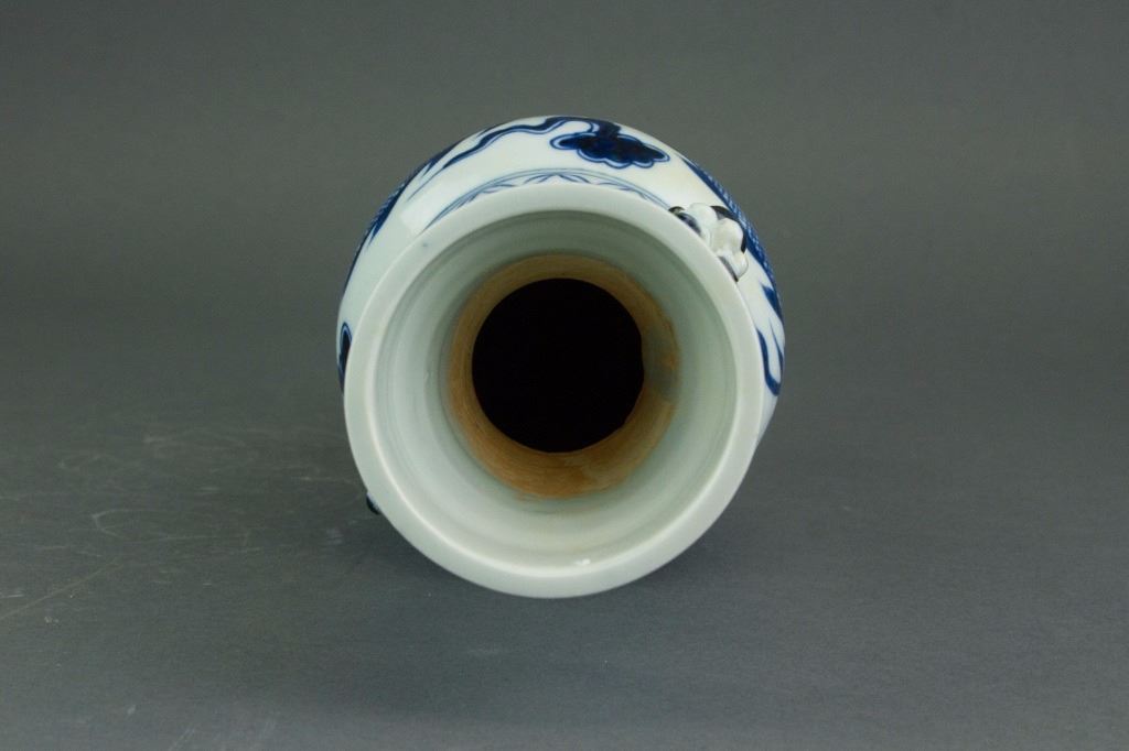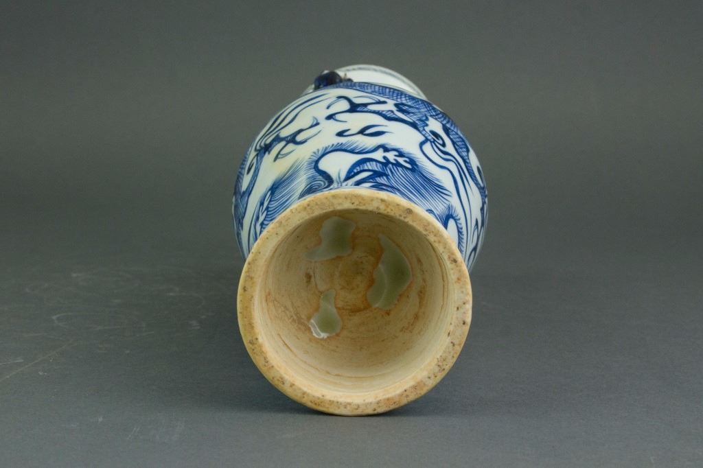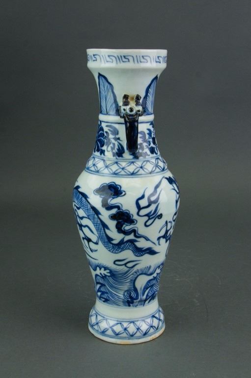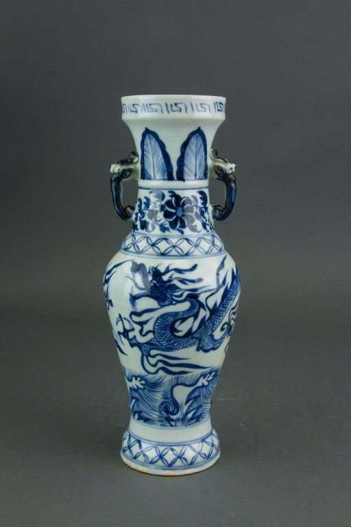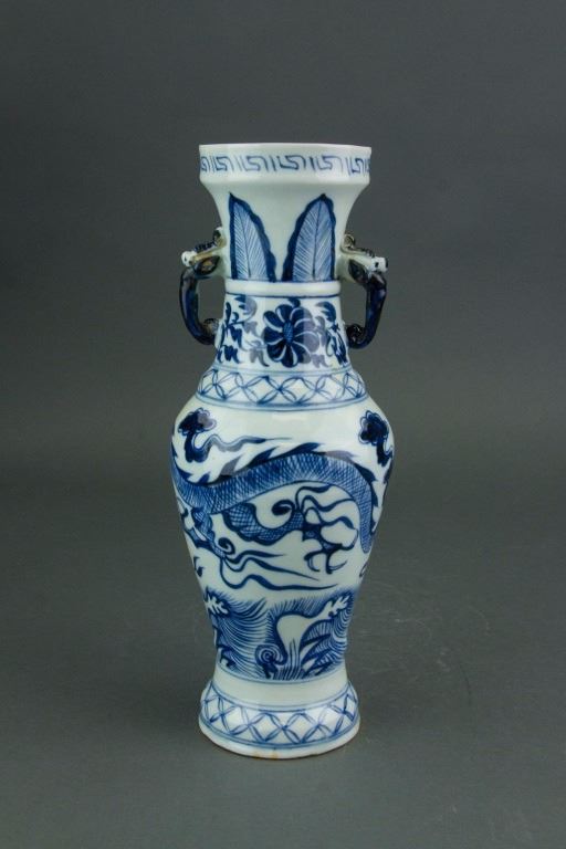 Chinese blue and white porcelain vase; Yuan style; of baluster form flanked by a pair of elephant handles; painted with striding dragon above aquatic weeds; unglazed base; H: 26 cm, D: 10 cm, 754 grams