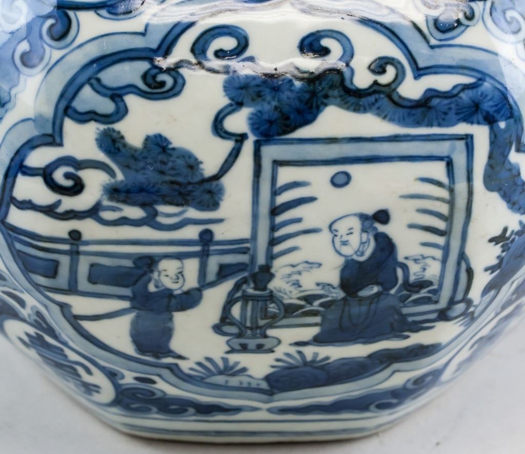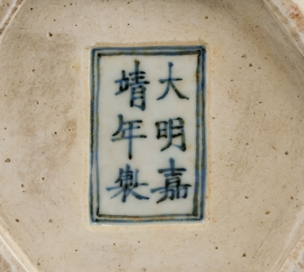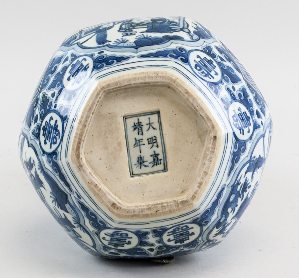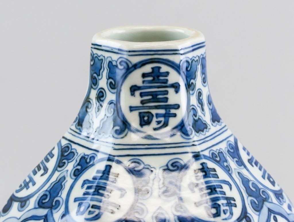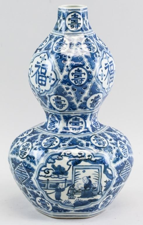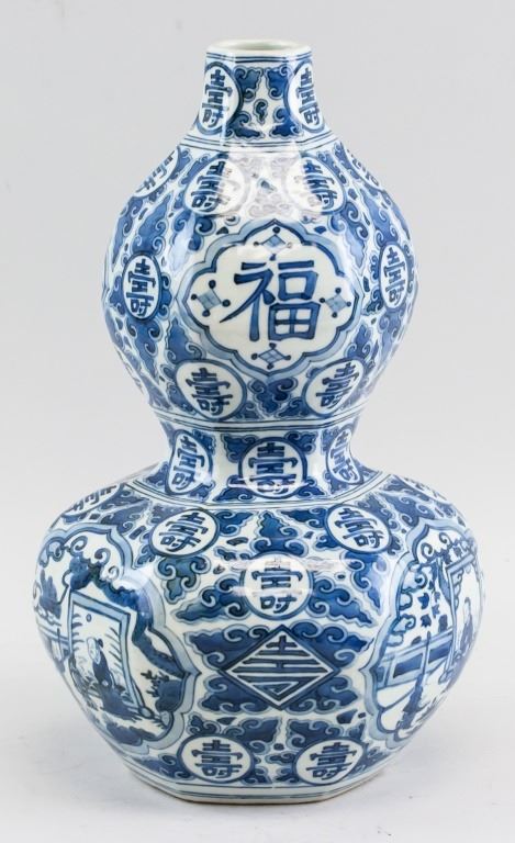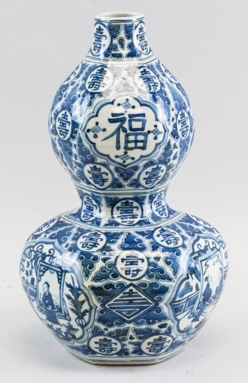 Chinese porcelain vase. Of blue and white tone. Of double gourd shape. Featuring characters for fortune and longevity. Six character Ming dynasty Jiaqing mark on base. 33 x 18 cm, 2 kg.