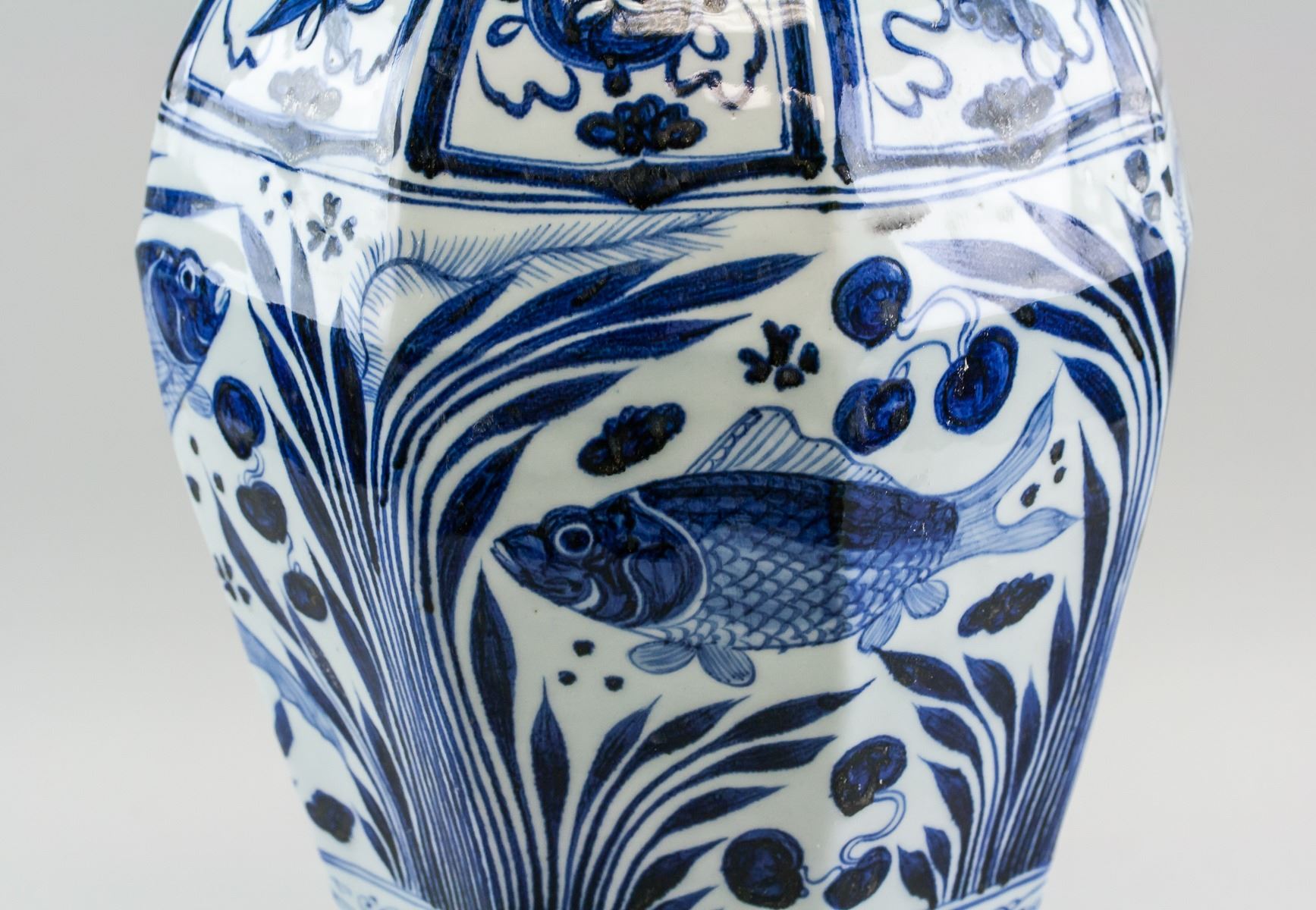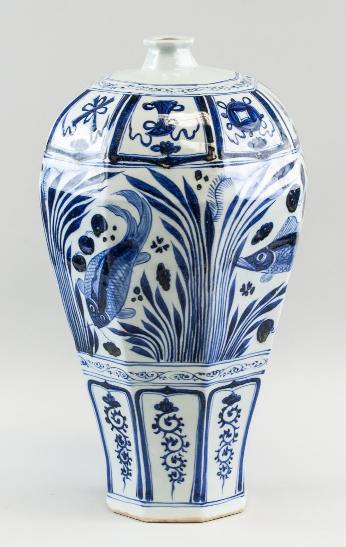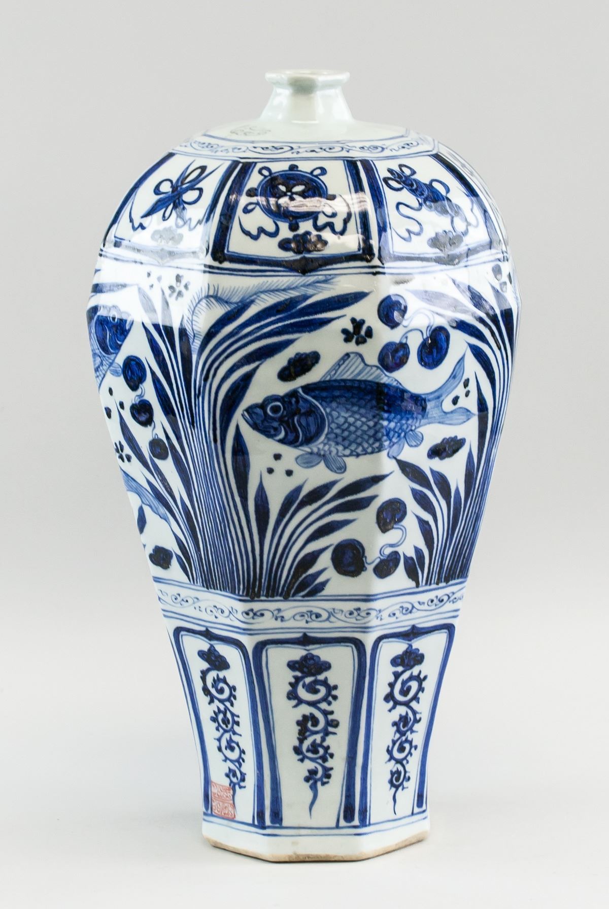 Chinese blue and white porcelain vase. Of octagonal shape in the Yuan dynasty style. Decorated with images of fish. Seal of Mongolian script near base. Base stamped with mark in Mongolian script. 18th century or later. 47 x 26 cm, 5 kg