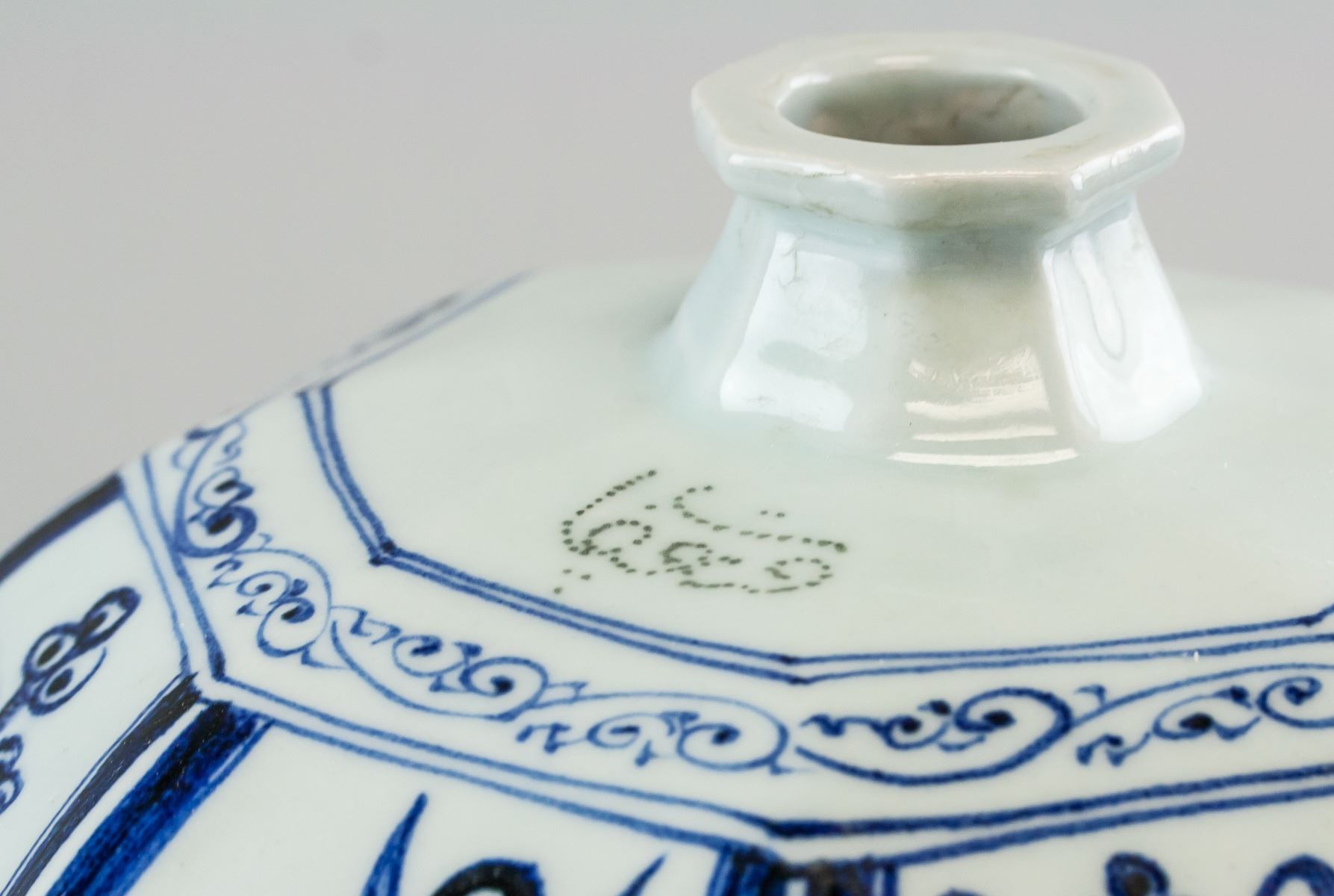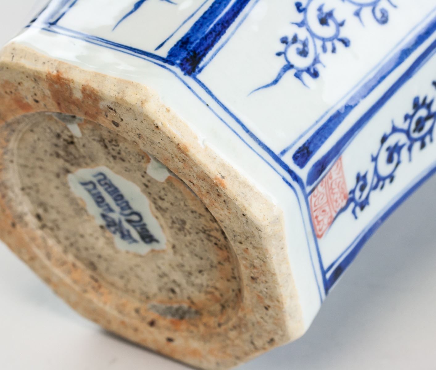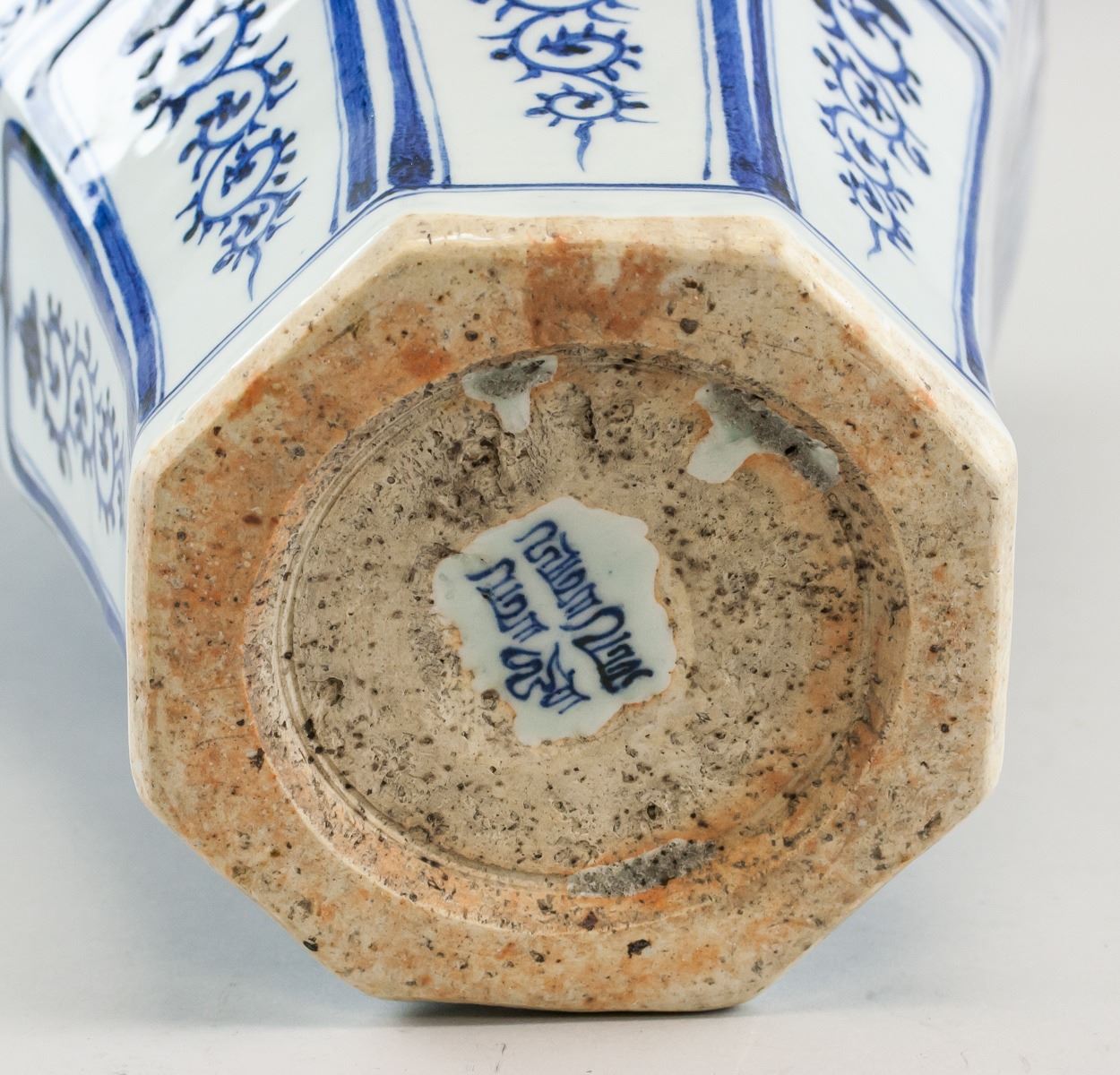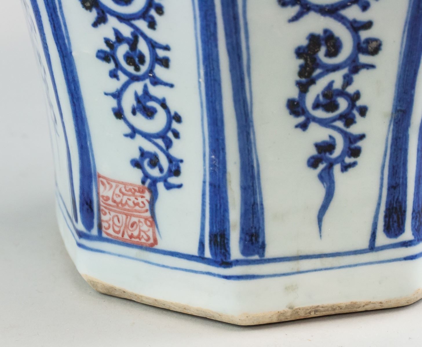 Chinese blue and white porcelain vase. Of octagonal shape in the Yuan dynasty style. Decorated with images of fish. Seal of Mongolian script near base. Base stamped with mark in Mongolian script. 18th century or later. 47 x 26 cm, 5 kg