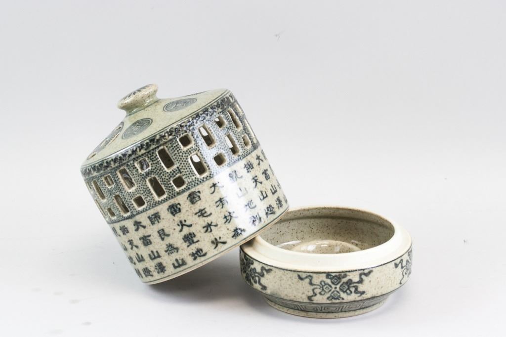 Chinese porcelain censer. Of blue and white tone. With openwork. Painted with calligraphy. Four character mark on base. 20 x 15 cm, 1182 g.