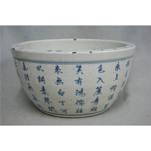 Chinese blue and white porcelain basin. Decorate with Chinese calligraphy. Minor chips and age wear.