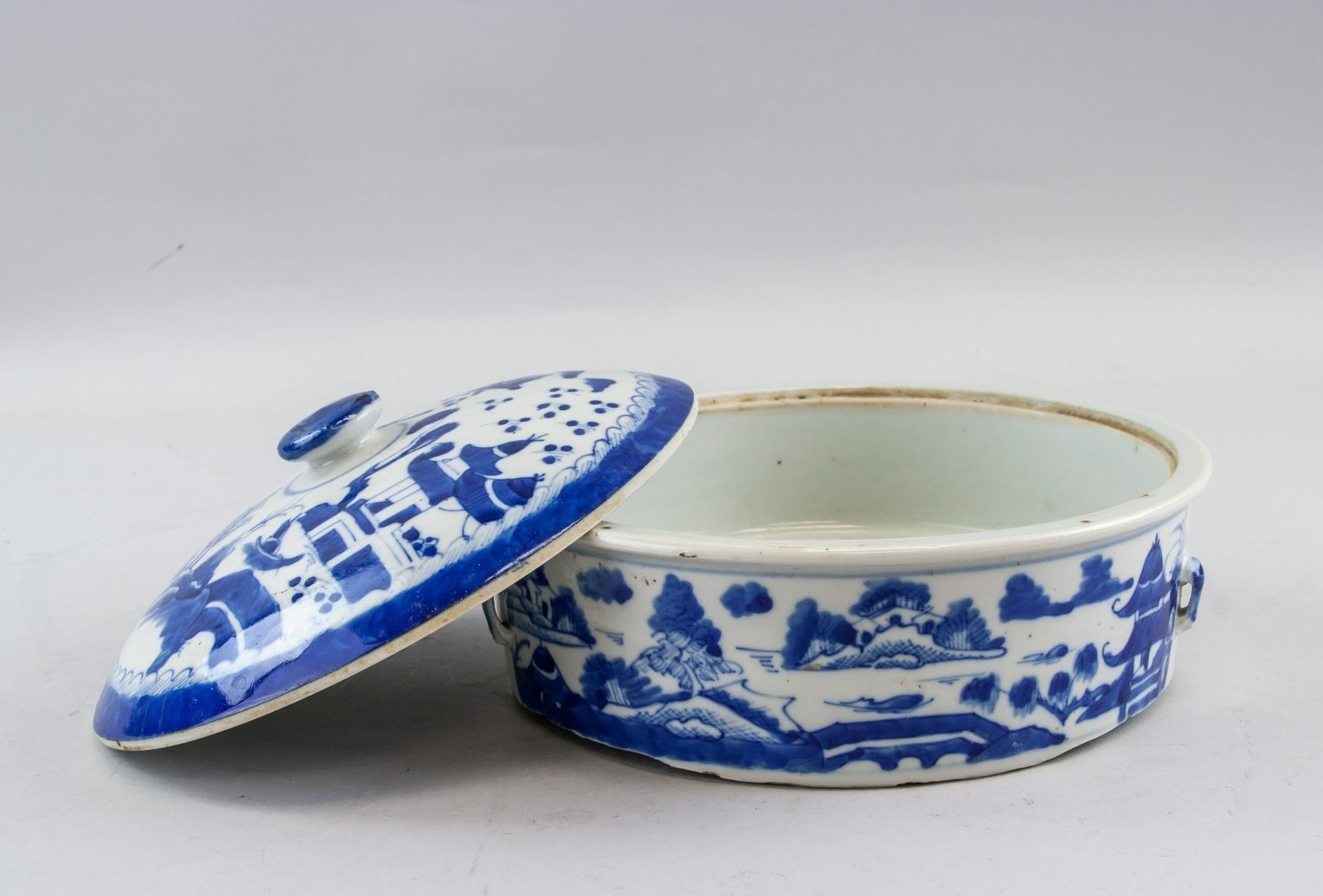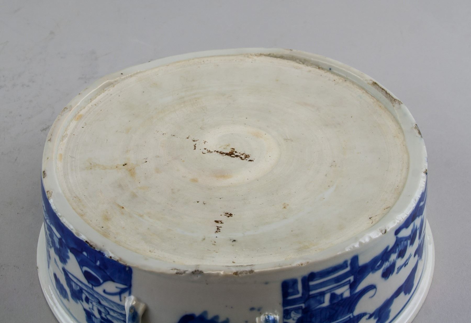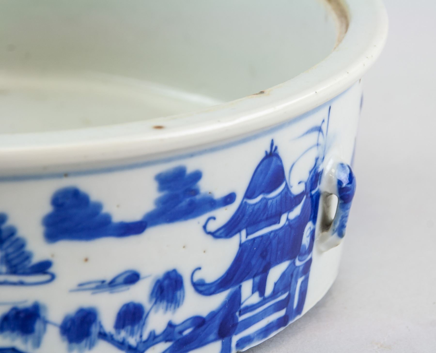Chinese blue and white porcelain bowl with basin of compressed cylinder form body, flanked with two ears, painted with mountainous landscape, 22 x 15 cm, 1717 grams