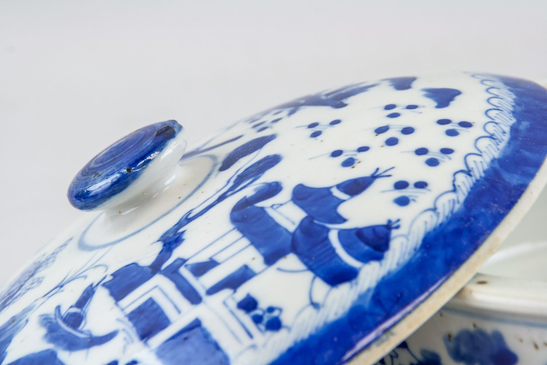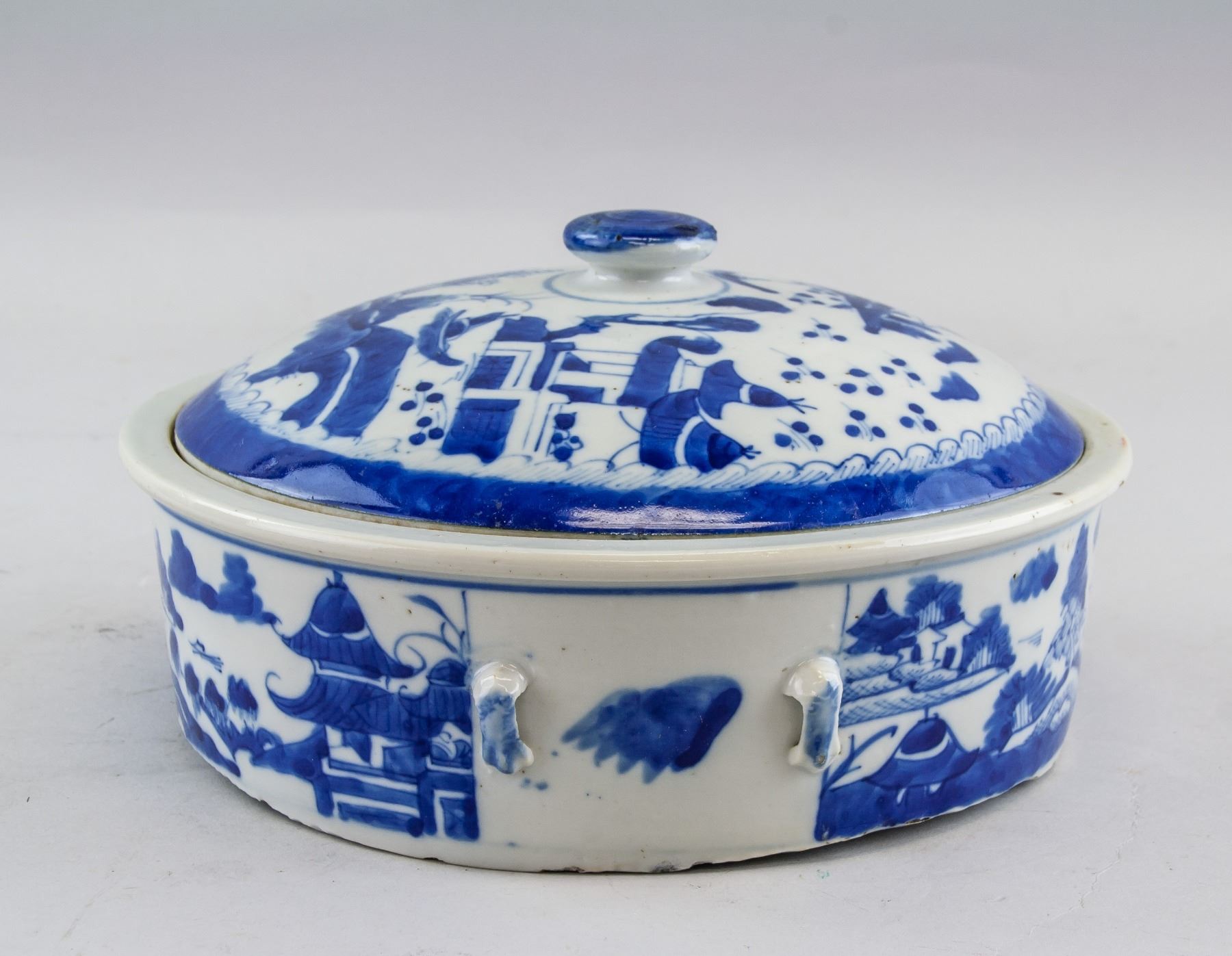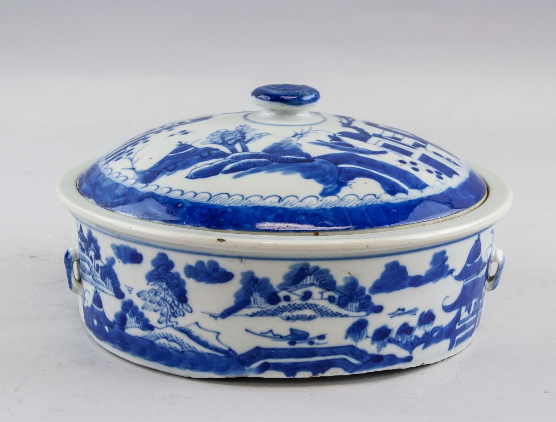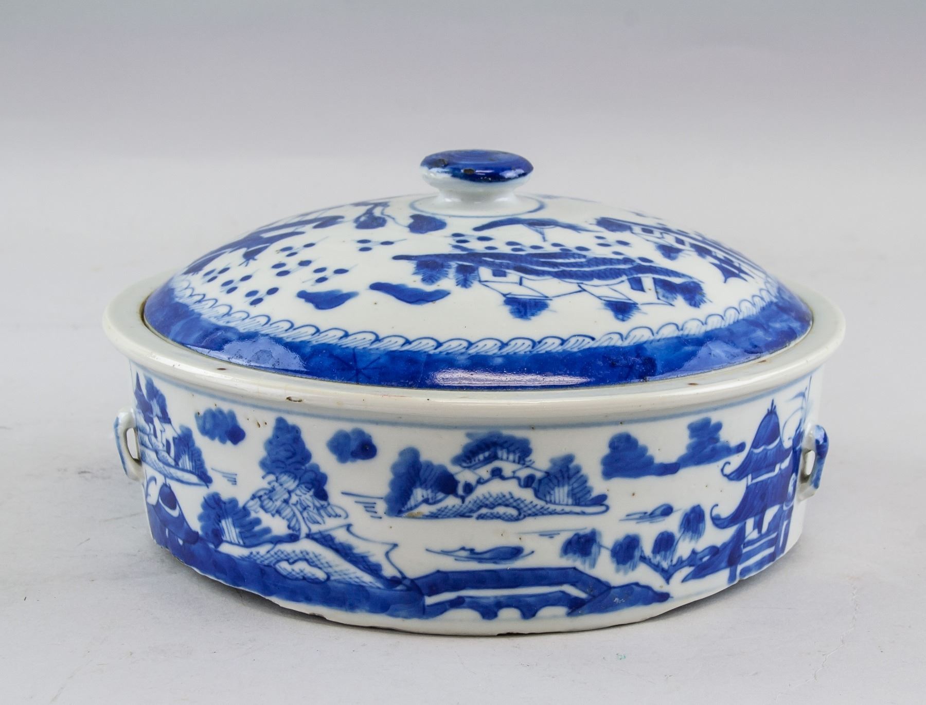 Chinese blue and white porcelain bowl with basin of compressed cylinder form body, flanked with two ears, painted with mountainous landscape, 22 x 15 cm, 1717 grams
