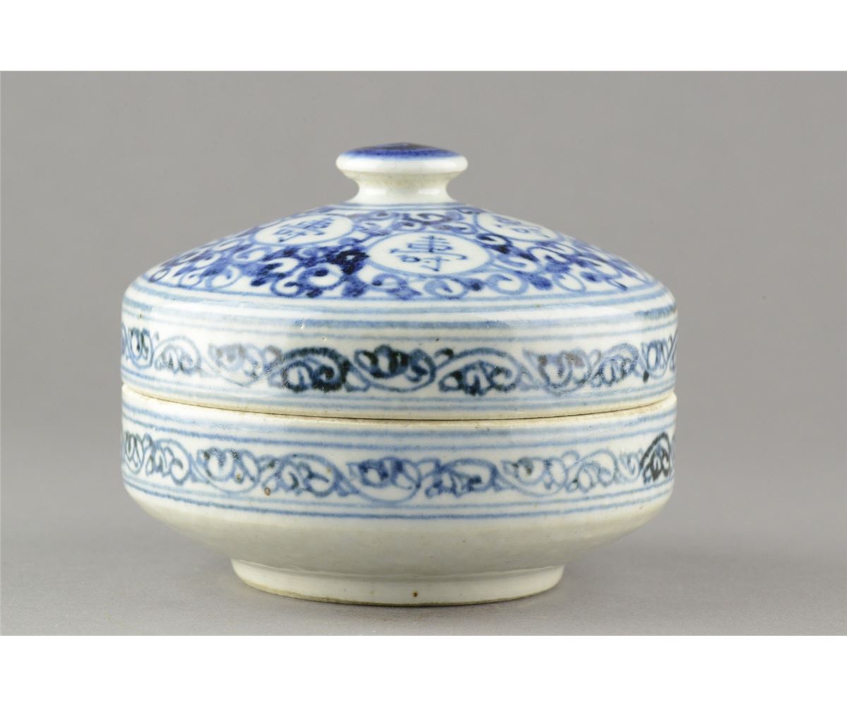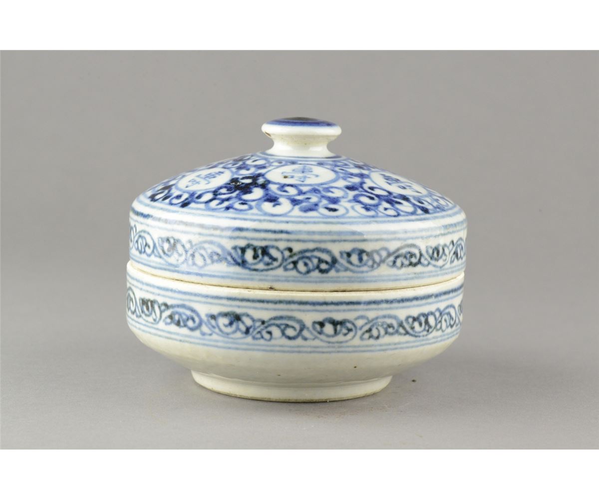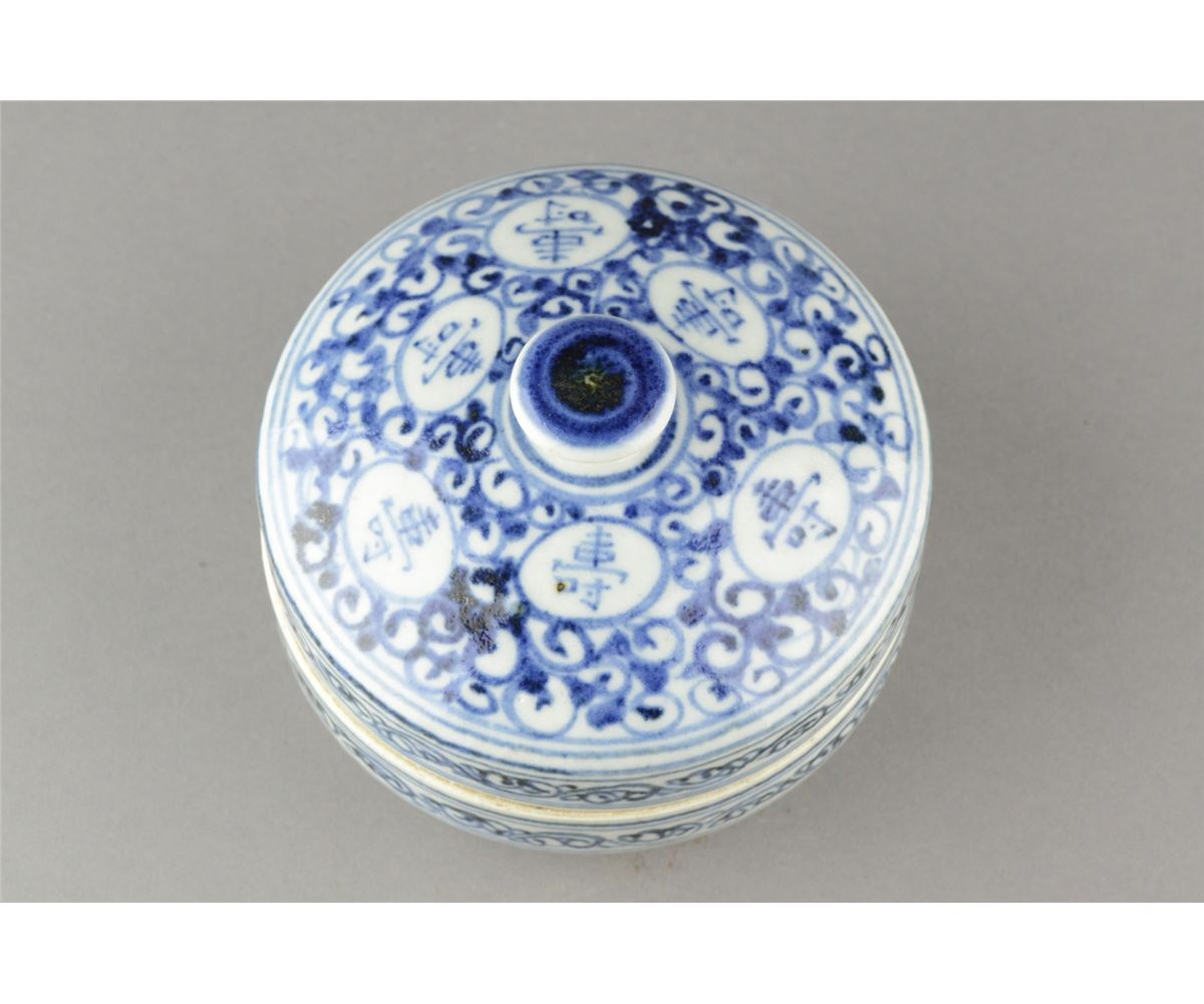 Of cylindrical form with tapered foot and dome lid, the porcelain box is painted with Shou characters with floral sprays, Qing Period; H: 10 cm, D: 13 cm