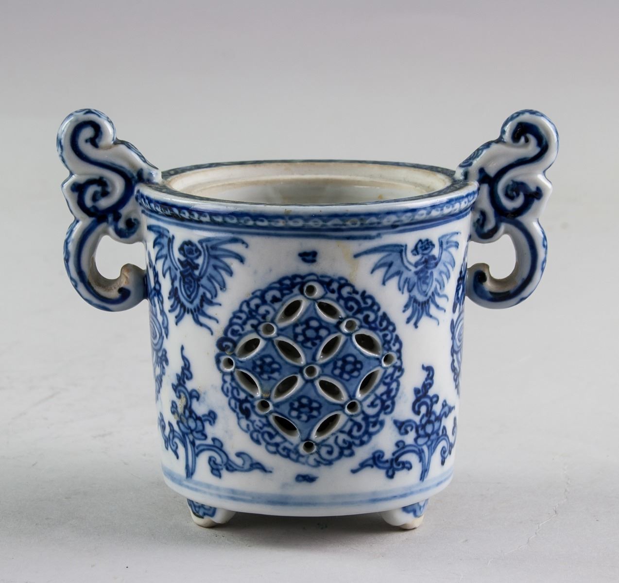 Chinese blue and white porcelain censer, of cylinder form body, with open work carving, flanked with two leafy handle, painted with floral and leafy pattern, with one mark on base, 9 x 11 cm, 339 grams