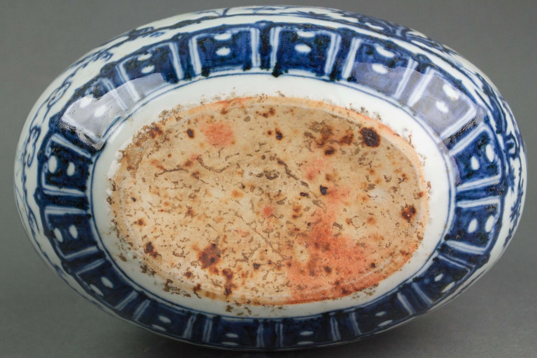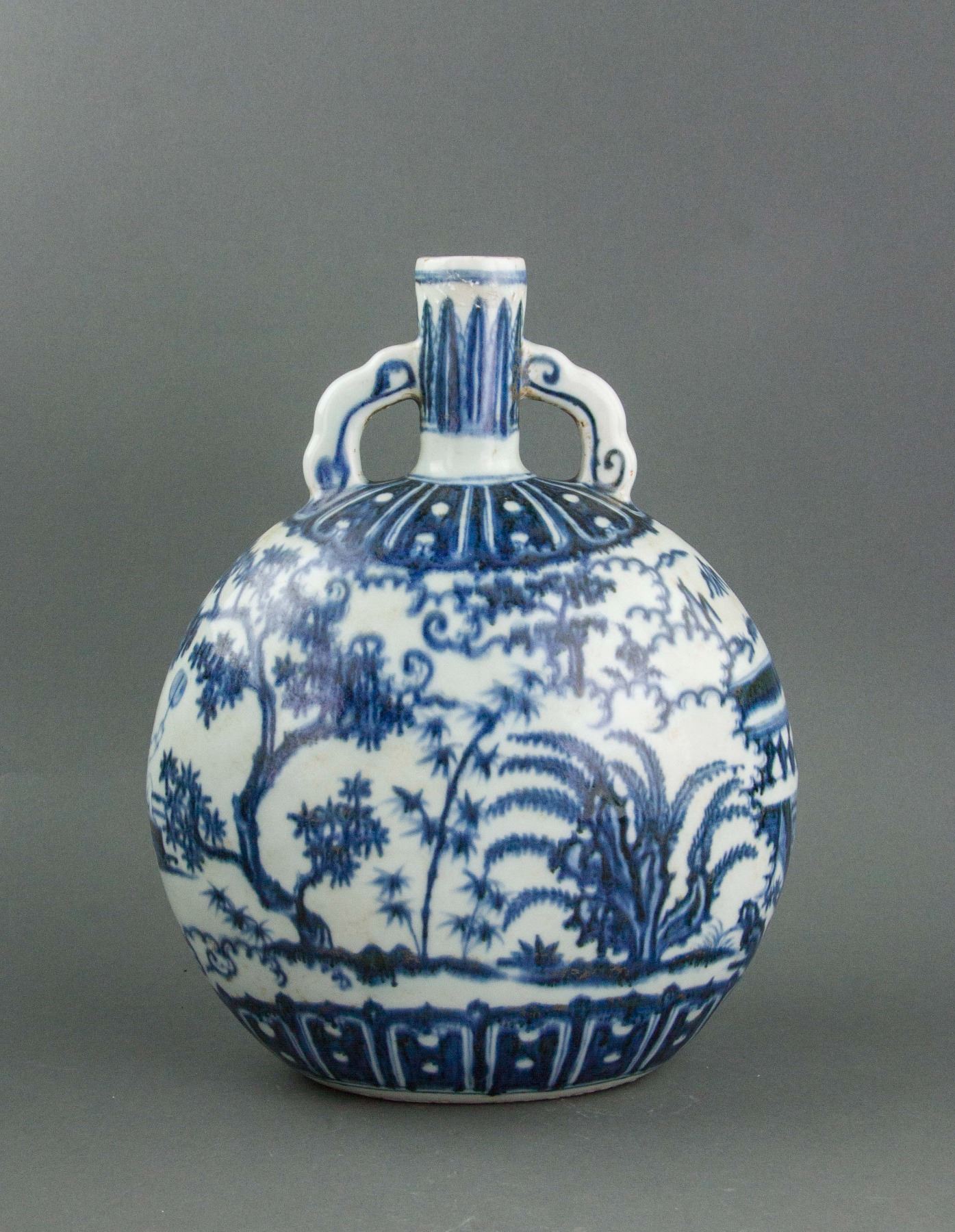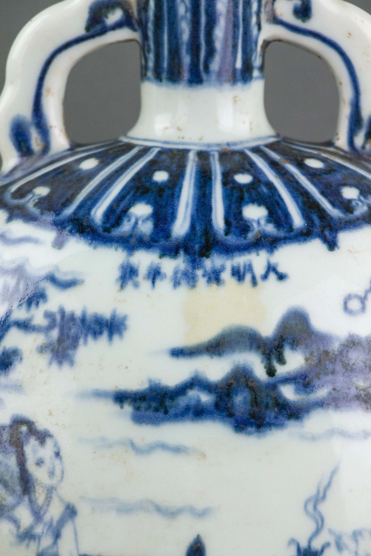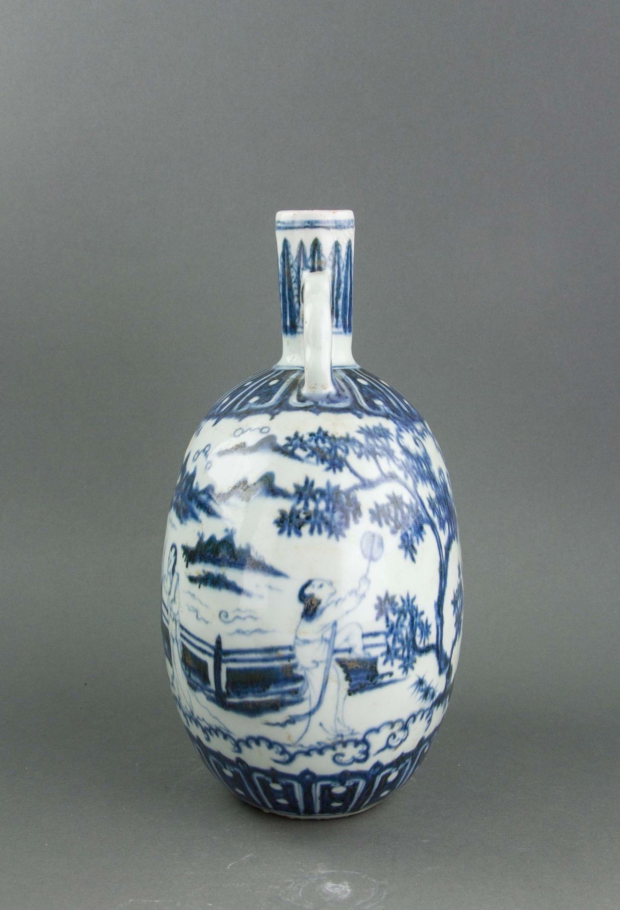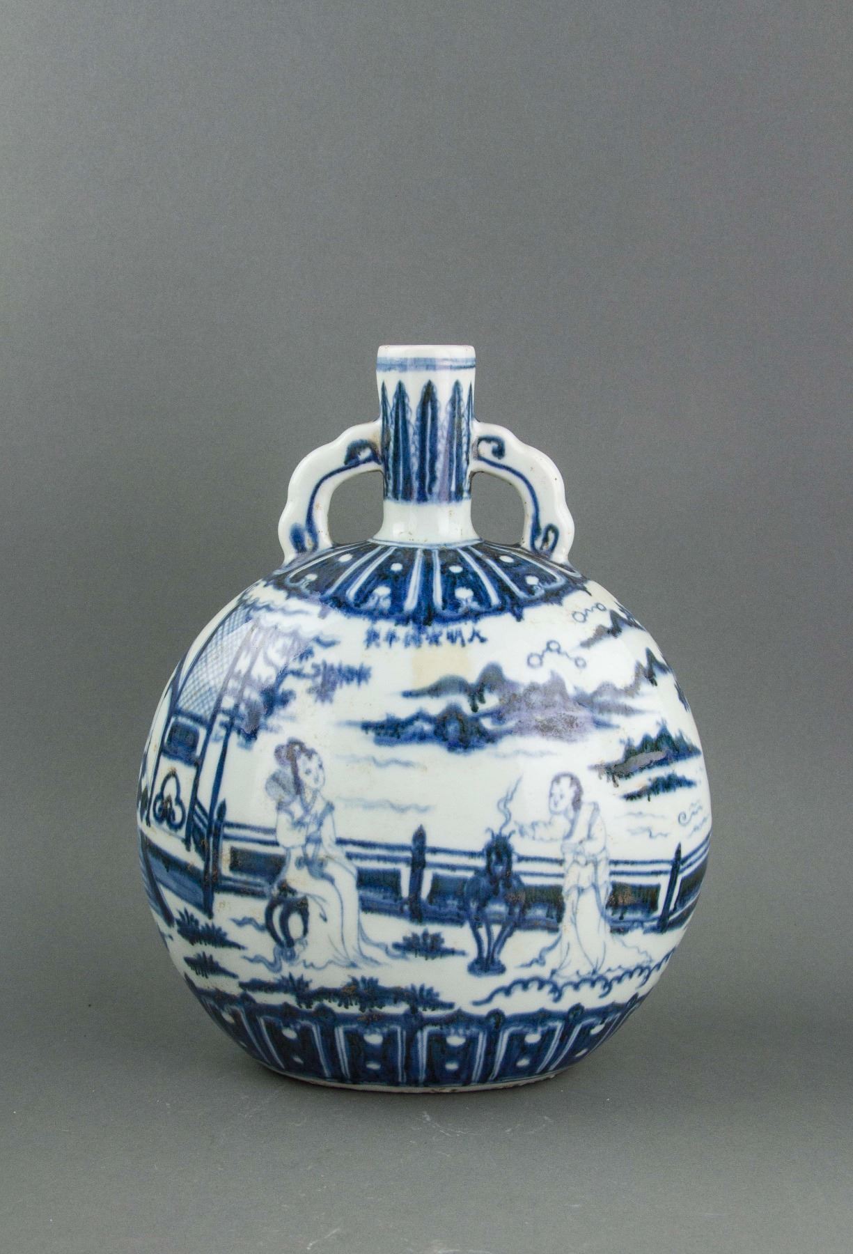 Chinese blue and white porcelain flask vase; of compressed round form body with thin neck; flanked with two curved handle; painted with beauties and mountainous landscape; six-character Xuande mark on shoulder; 29 cm x 22 cm, 1915 grams