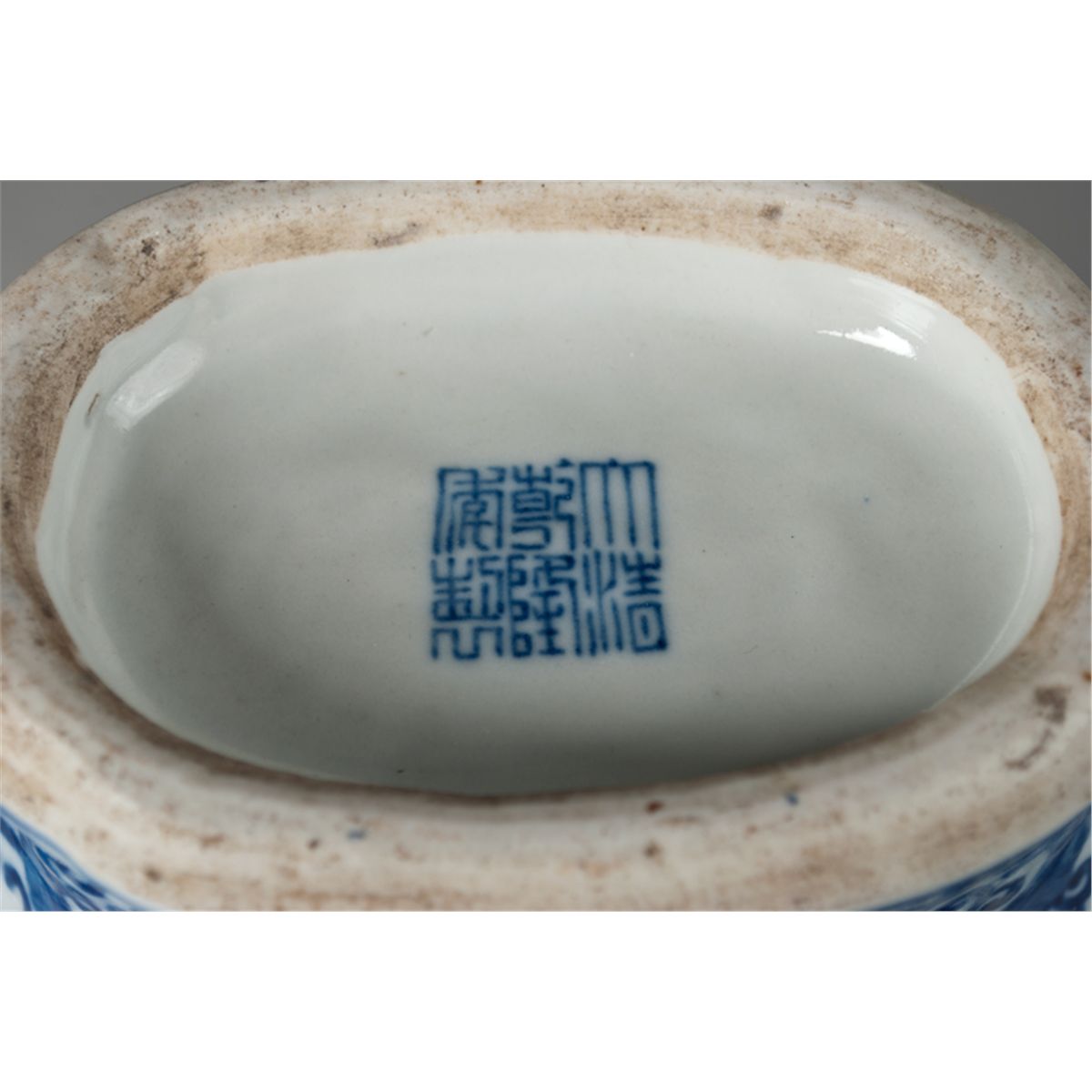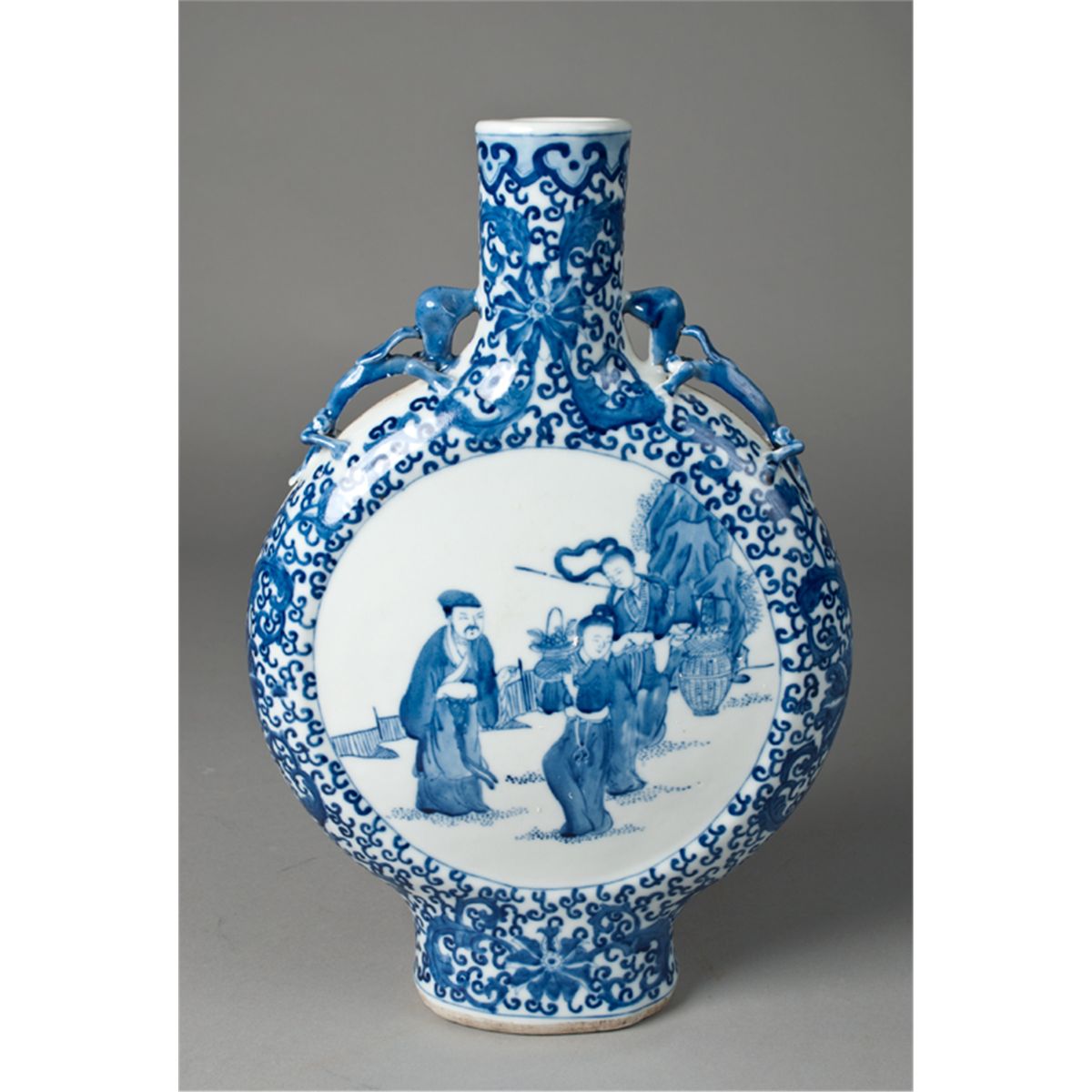 With chi long handles, depicting a scene of figures in a landscape with floral and scrolling designs on remainder. Six character mark in underglaze blue for Great Qing Qianlong Production on underside. 14.75" H x 9.75" W, circa 20th century. Private collection Rochester Hills, MI.