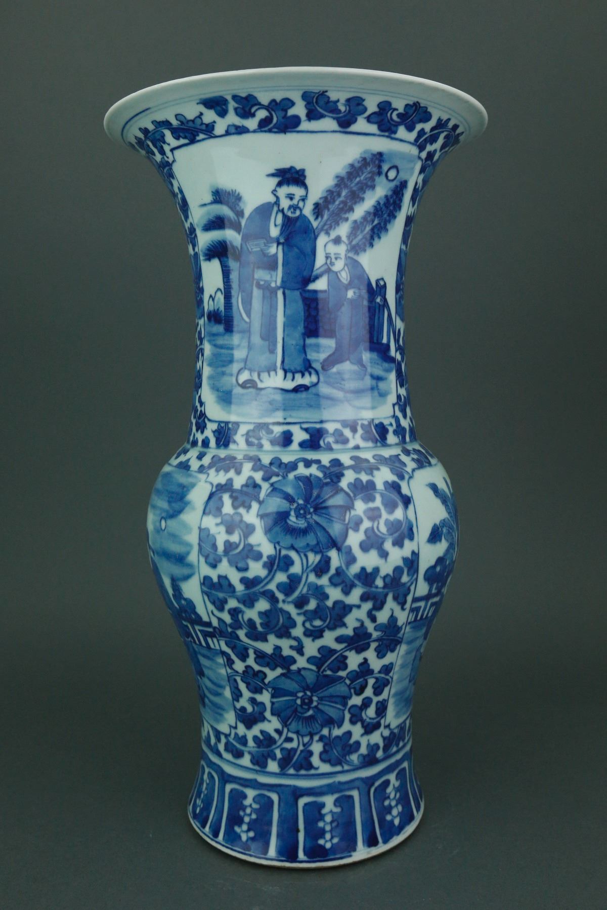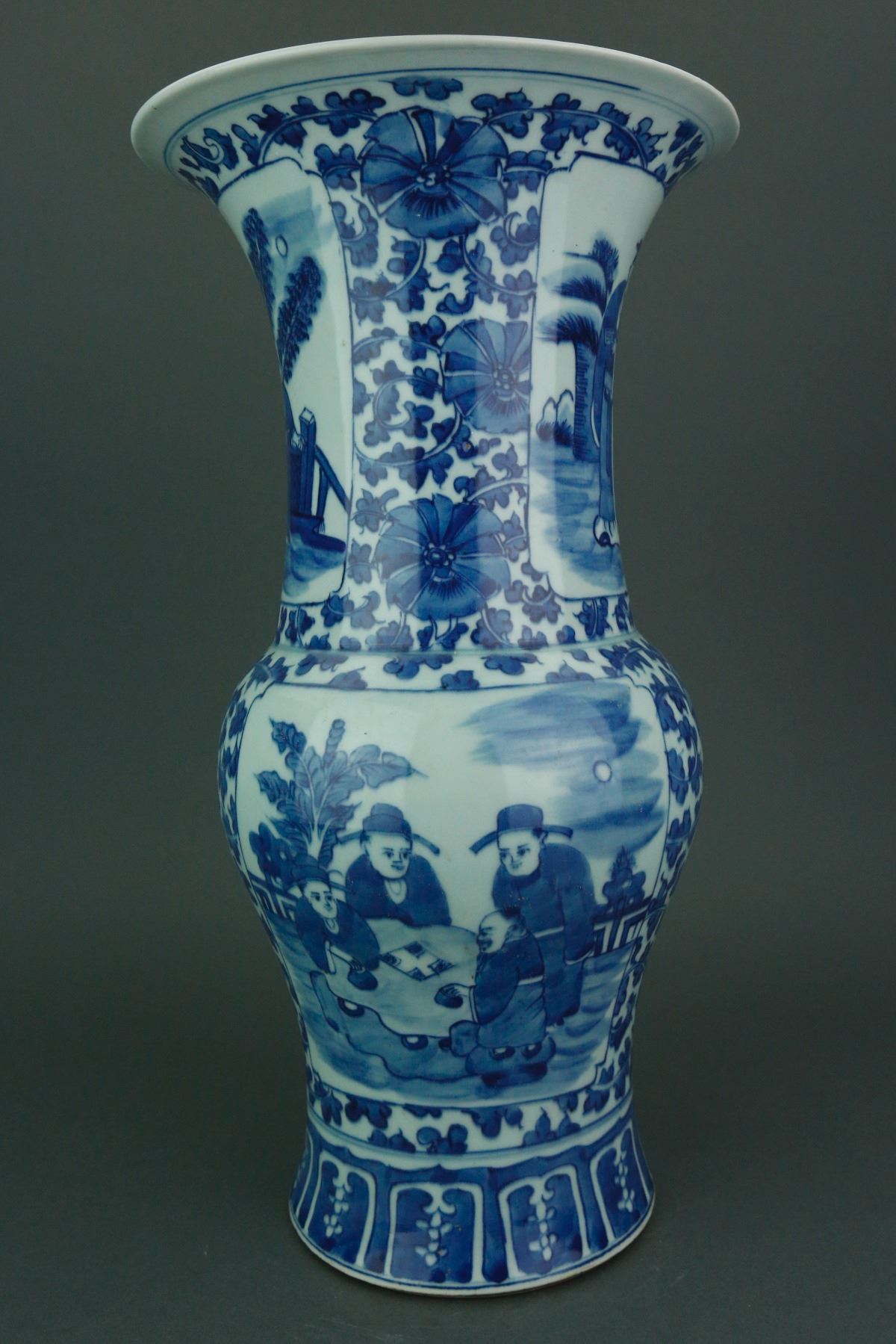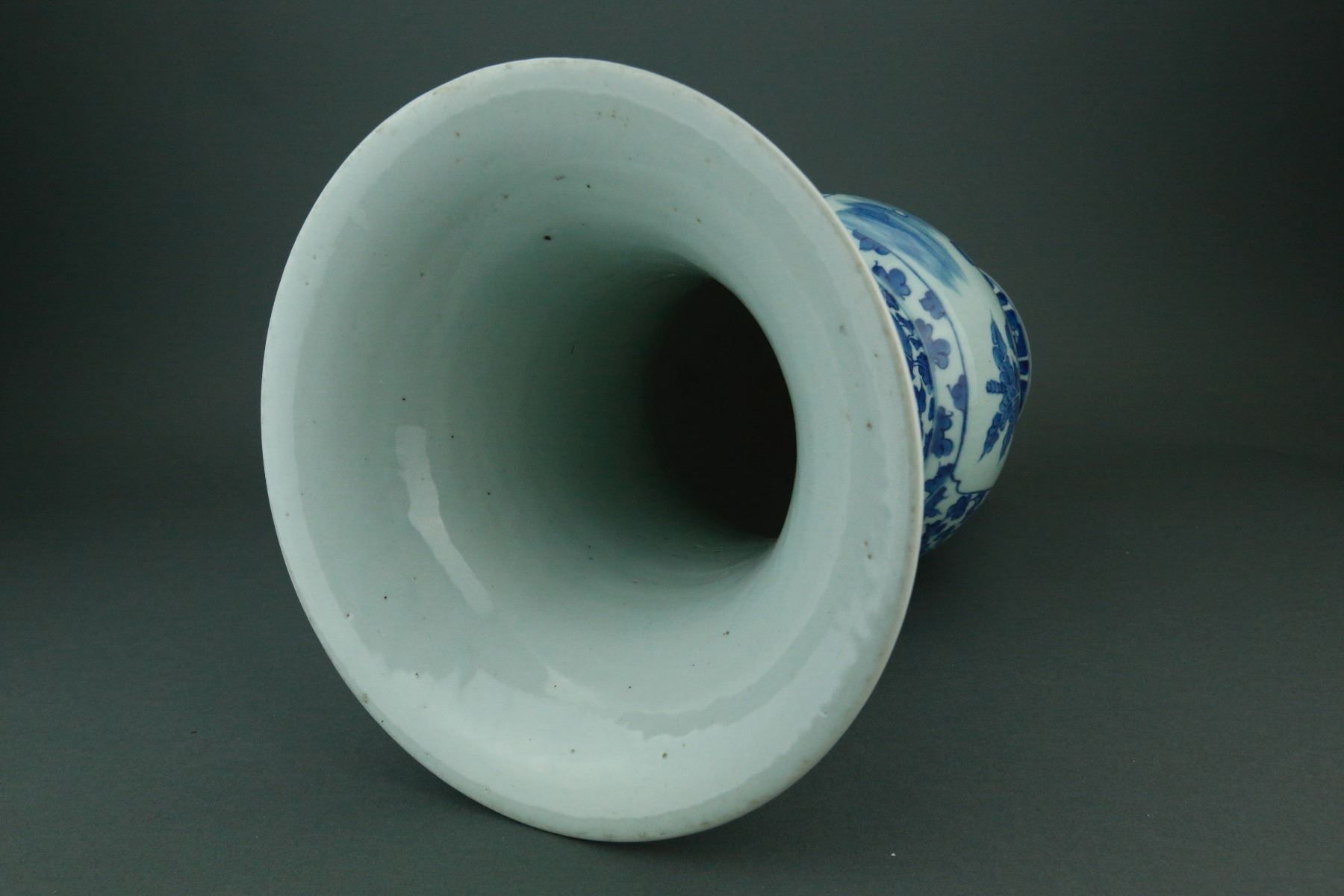 Chinese blue and white porcelain vase; of Gu vessel form with everted rim; featuring figures on floral scrollwork ground; D: 28 cm, H: 42 cm, 3701 grams