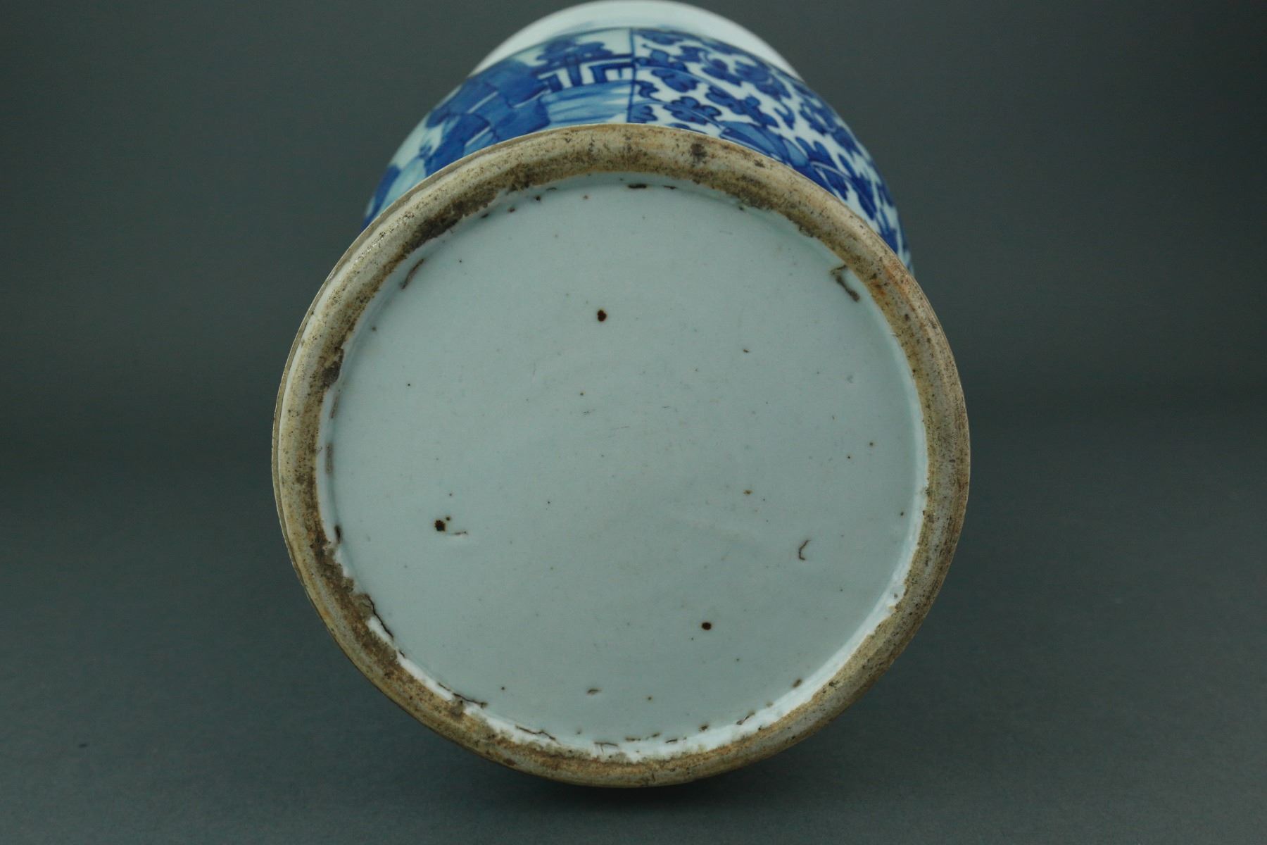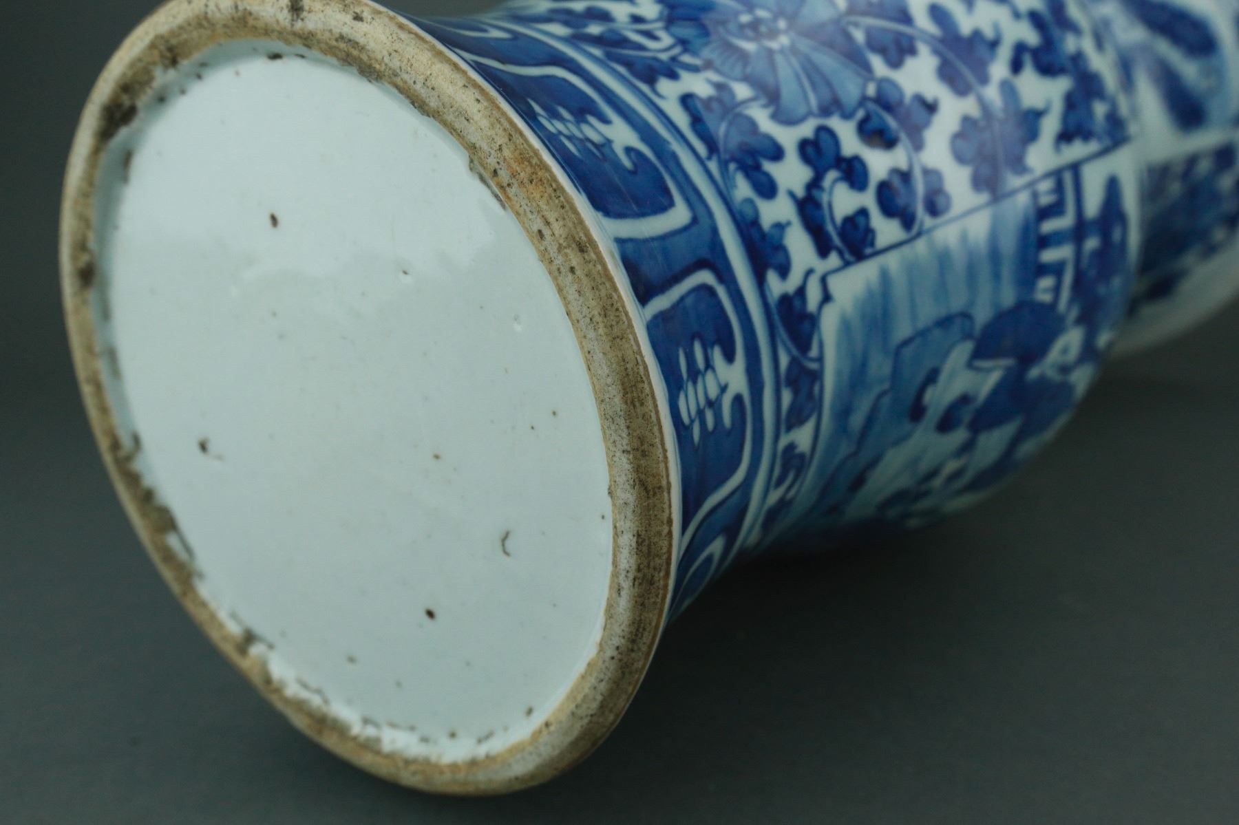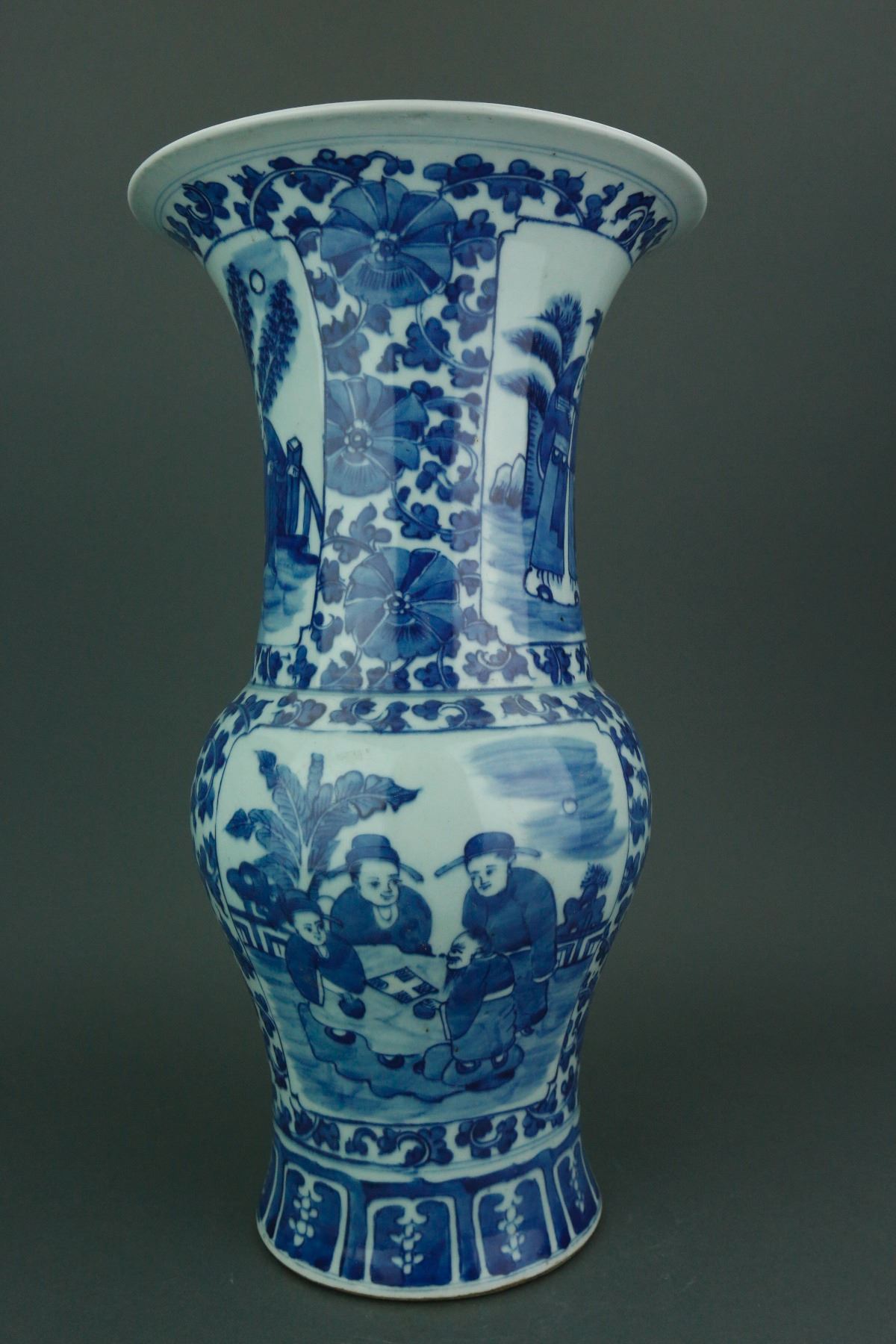 Chinese blue and white porcelain vase; of Gu vessel form with everted rim; featuring figures on floral scrollwork ground; D: 28 cm, H: 42 cm, 3701 grams