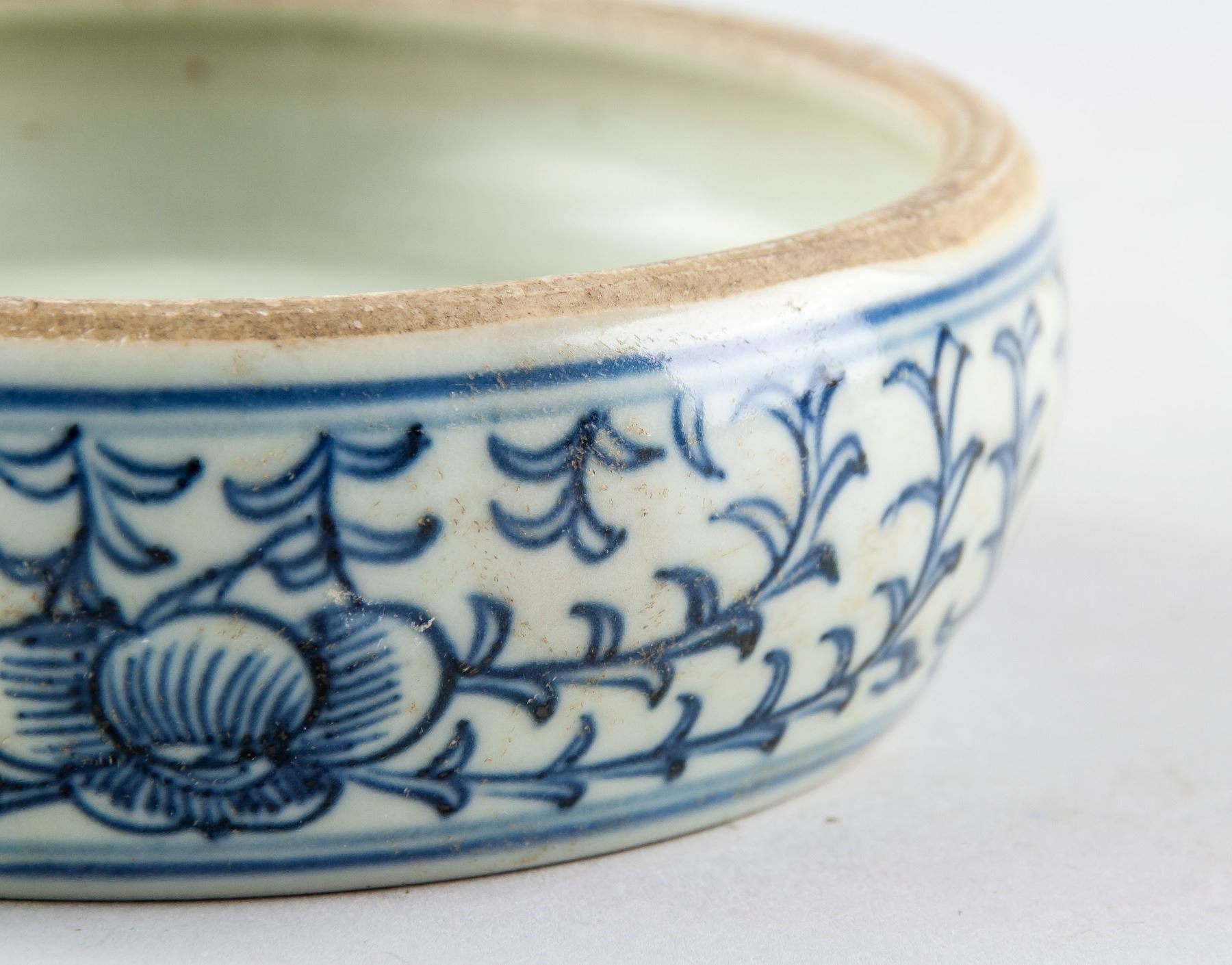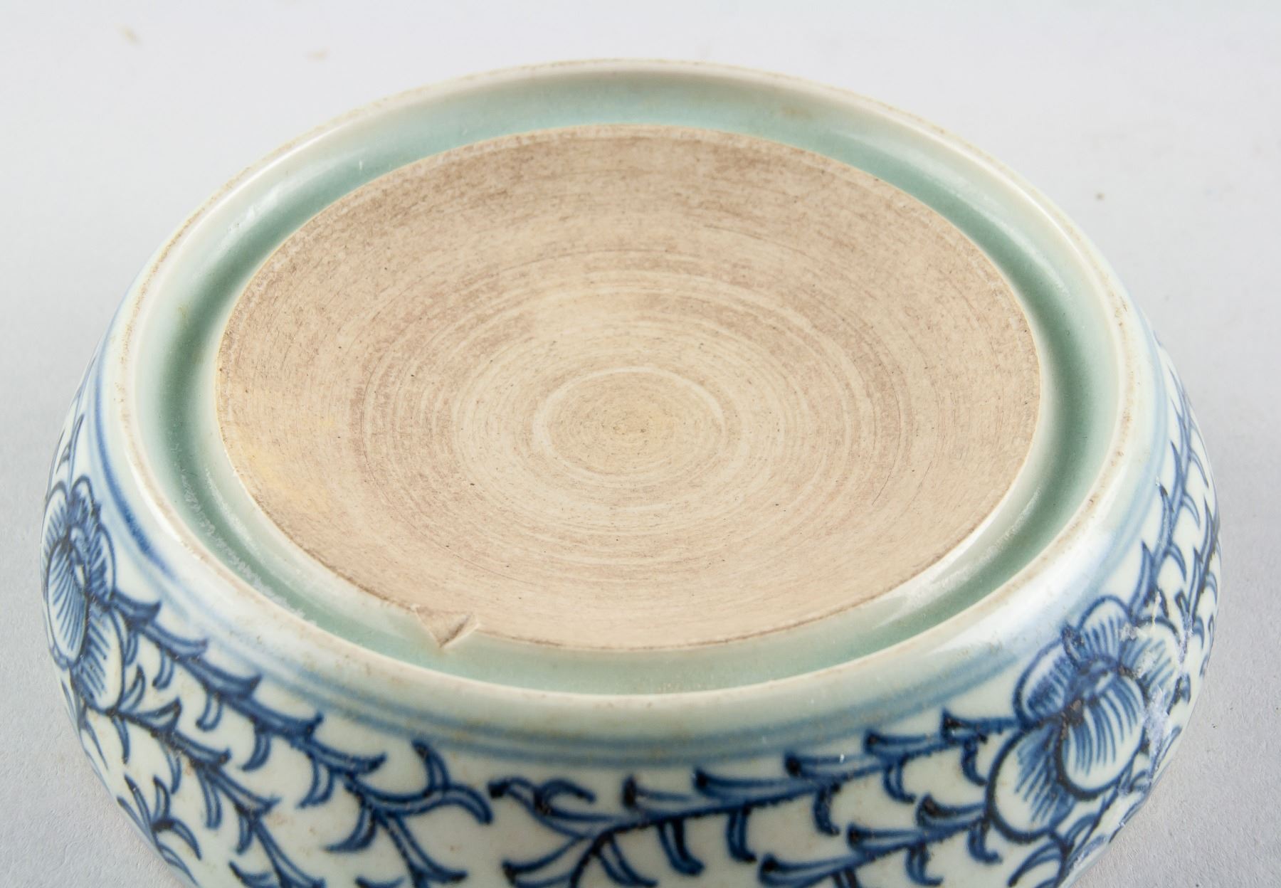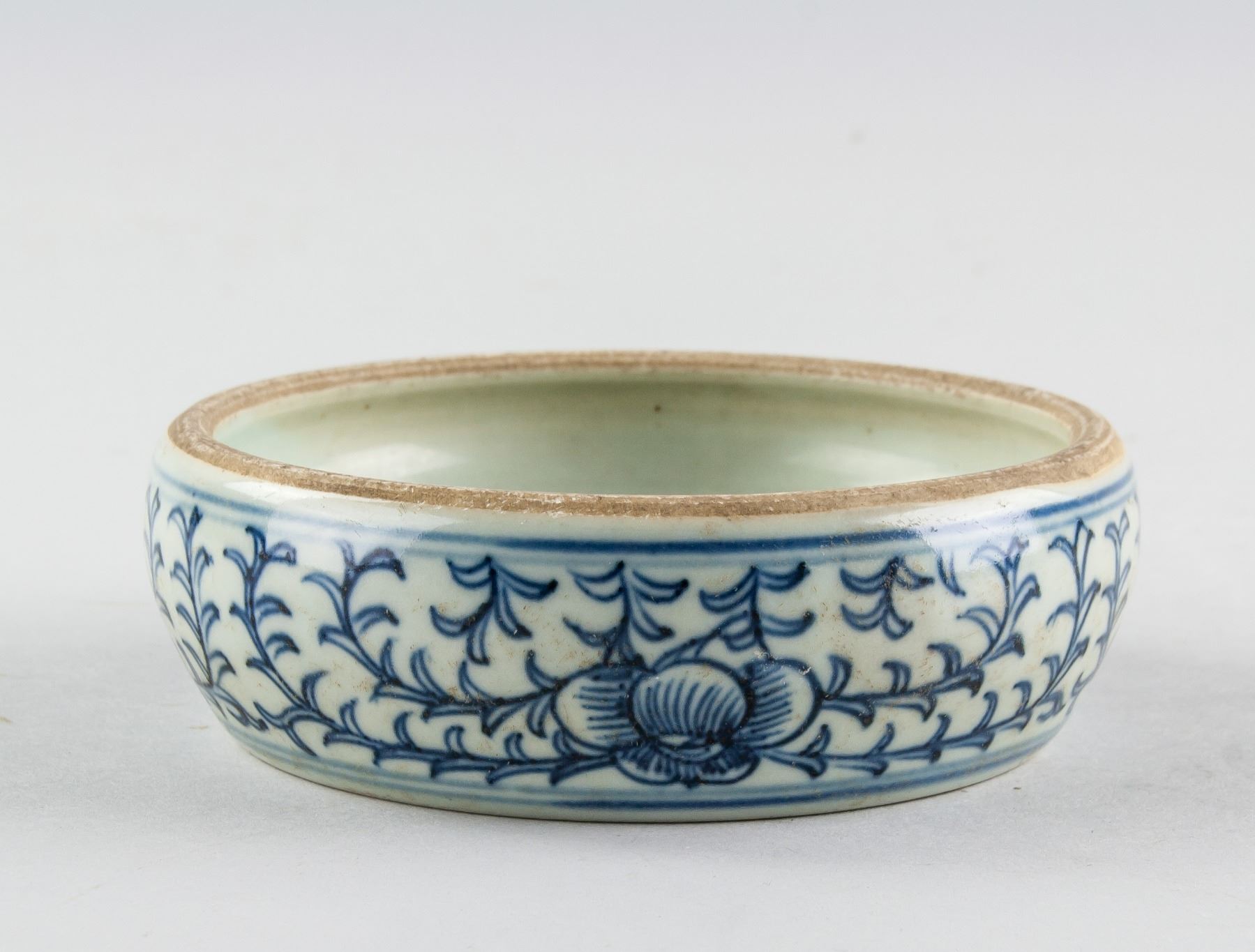 Chinese blue and white porcelain ink pot; of compressed cylinder body, tapering to top and bottom; painted with floral and leafy pattern; H: 4 cm, D: 13.5 cm, 619 grams