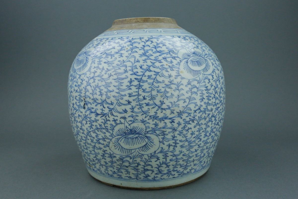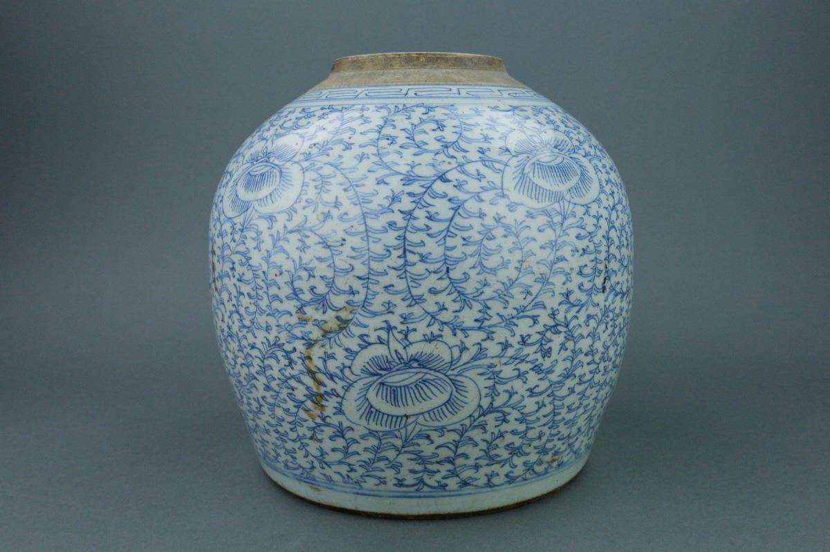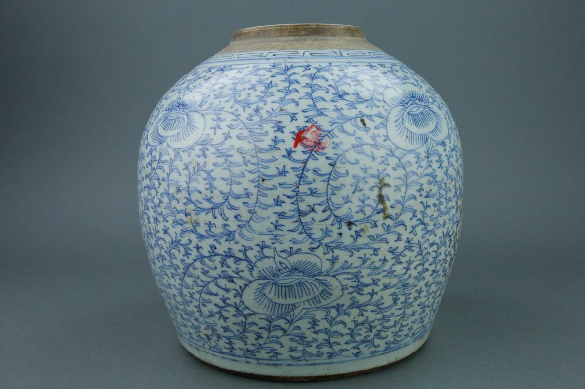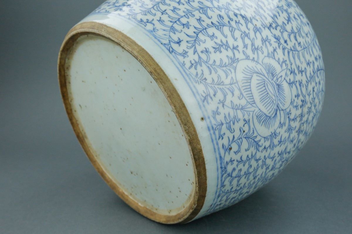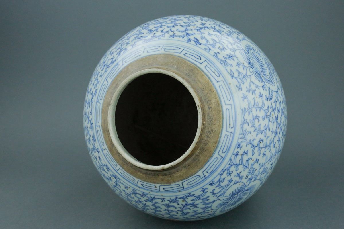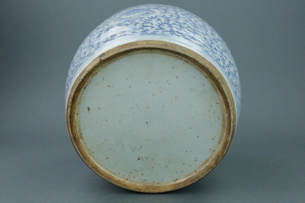 Chinese blue and white porcelain jar; of globular body with slightly raised shoulders; featuring scrolling orchid vines on body; with a red seal on body; H: 24 cm, W: 24.5 cm, 2329 grams