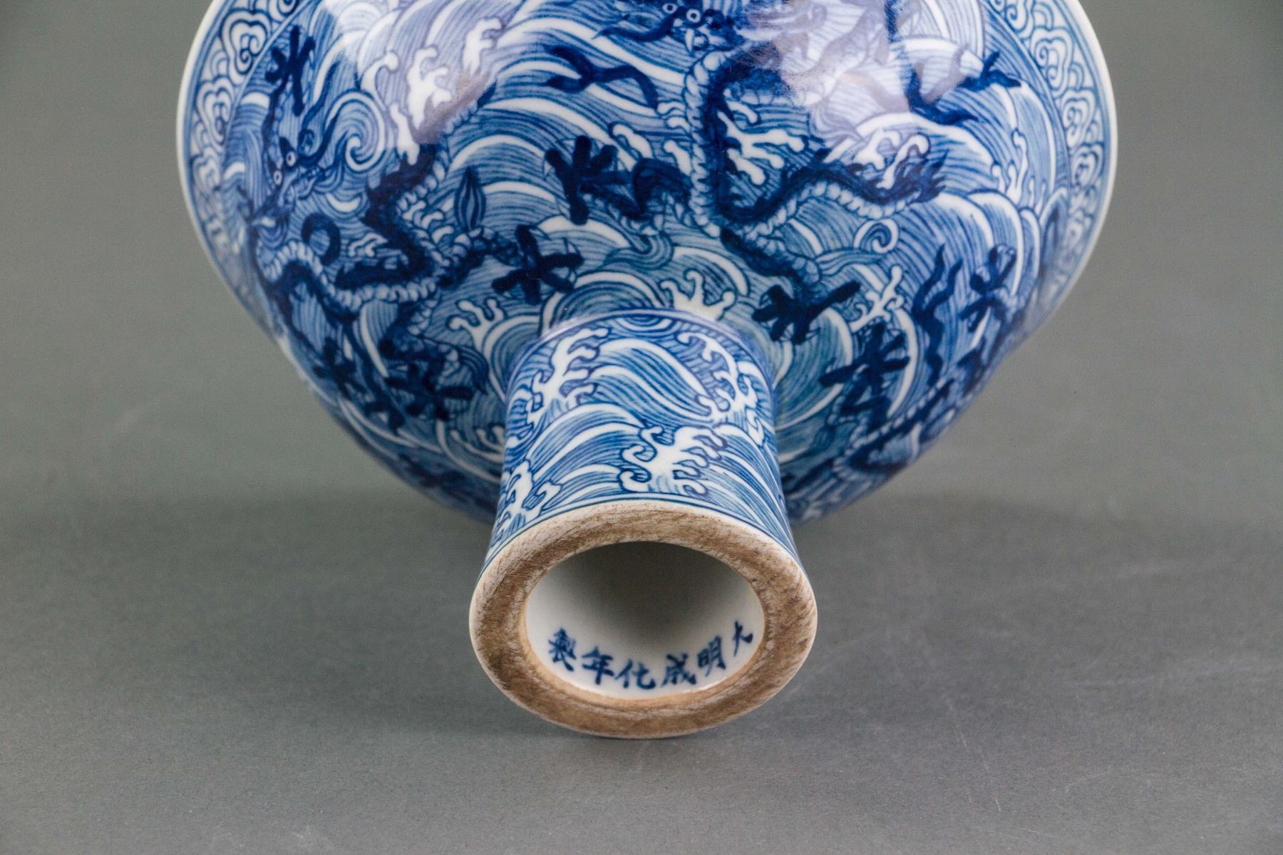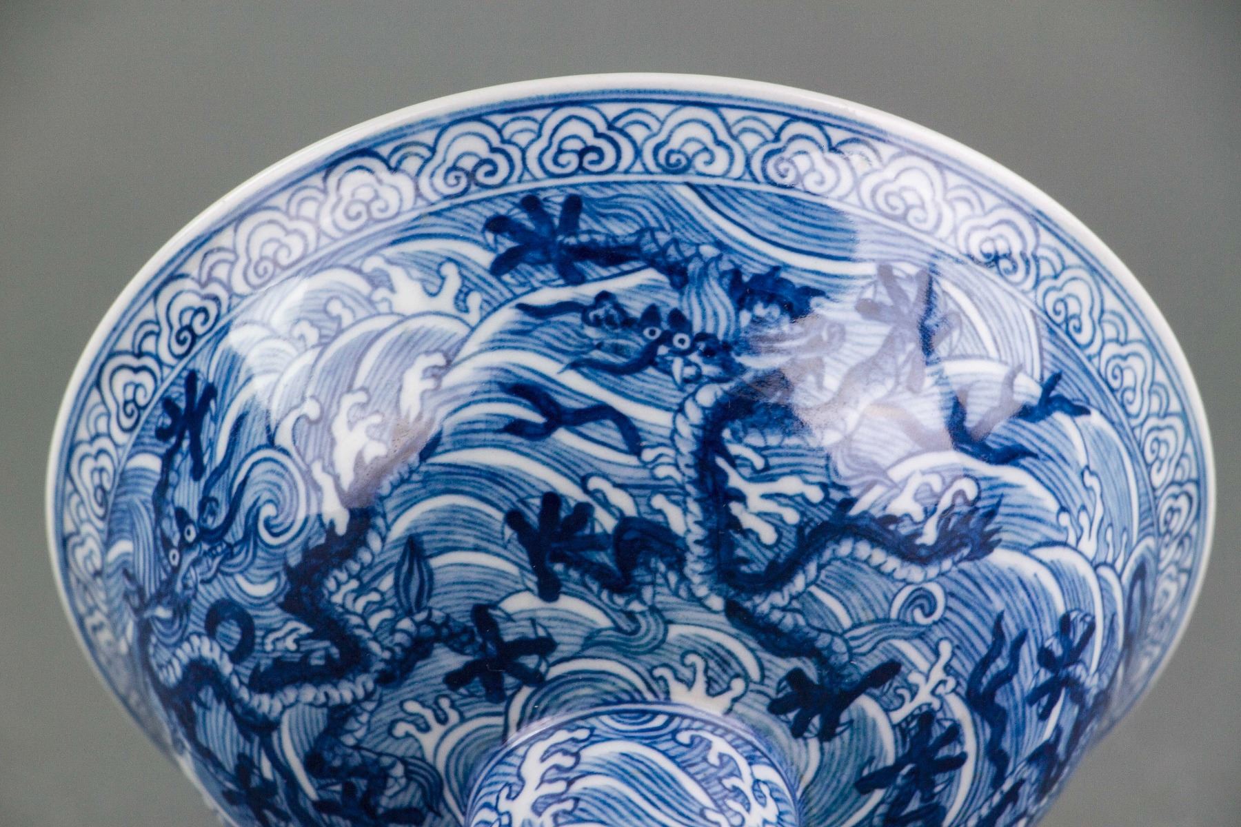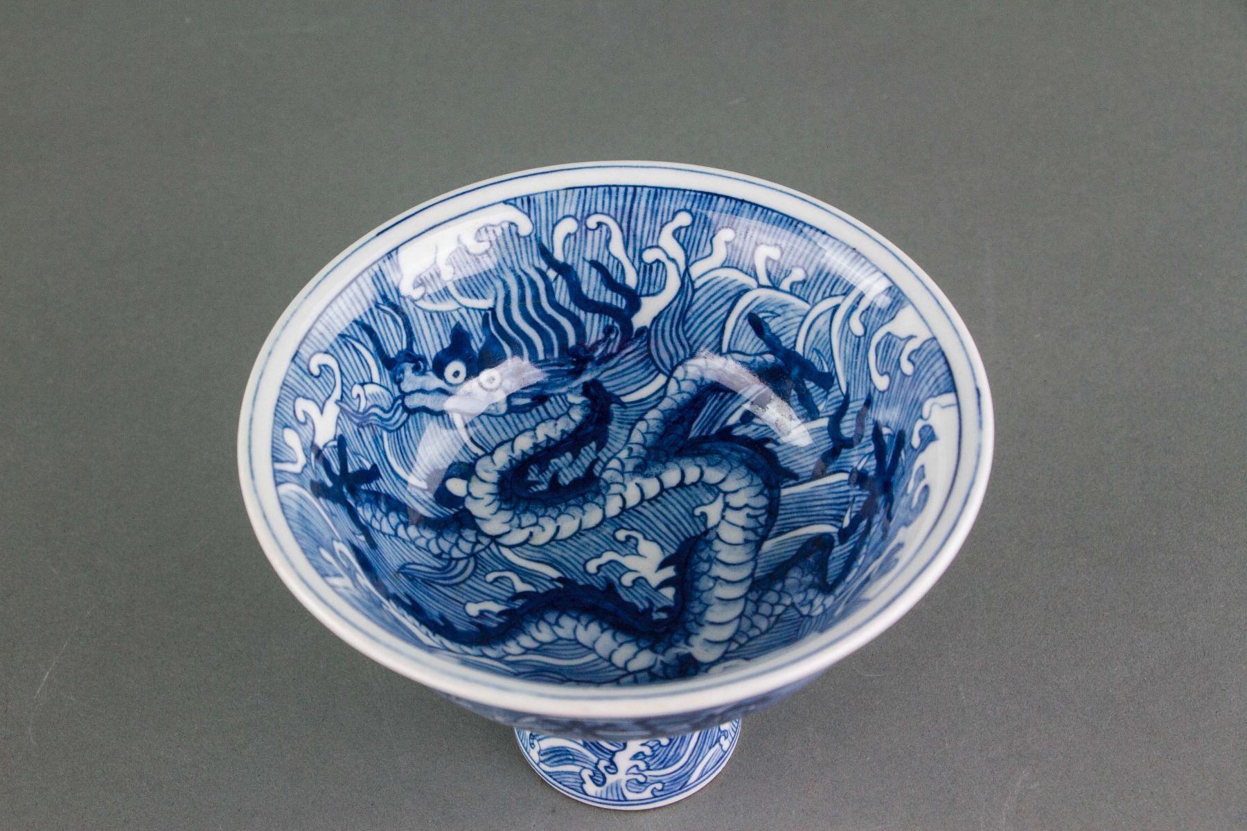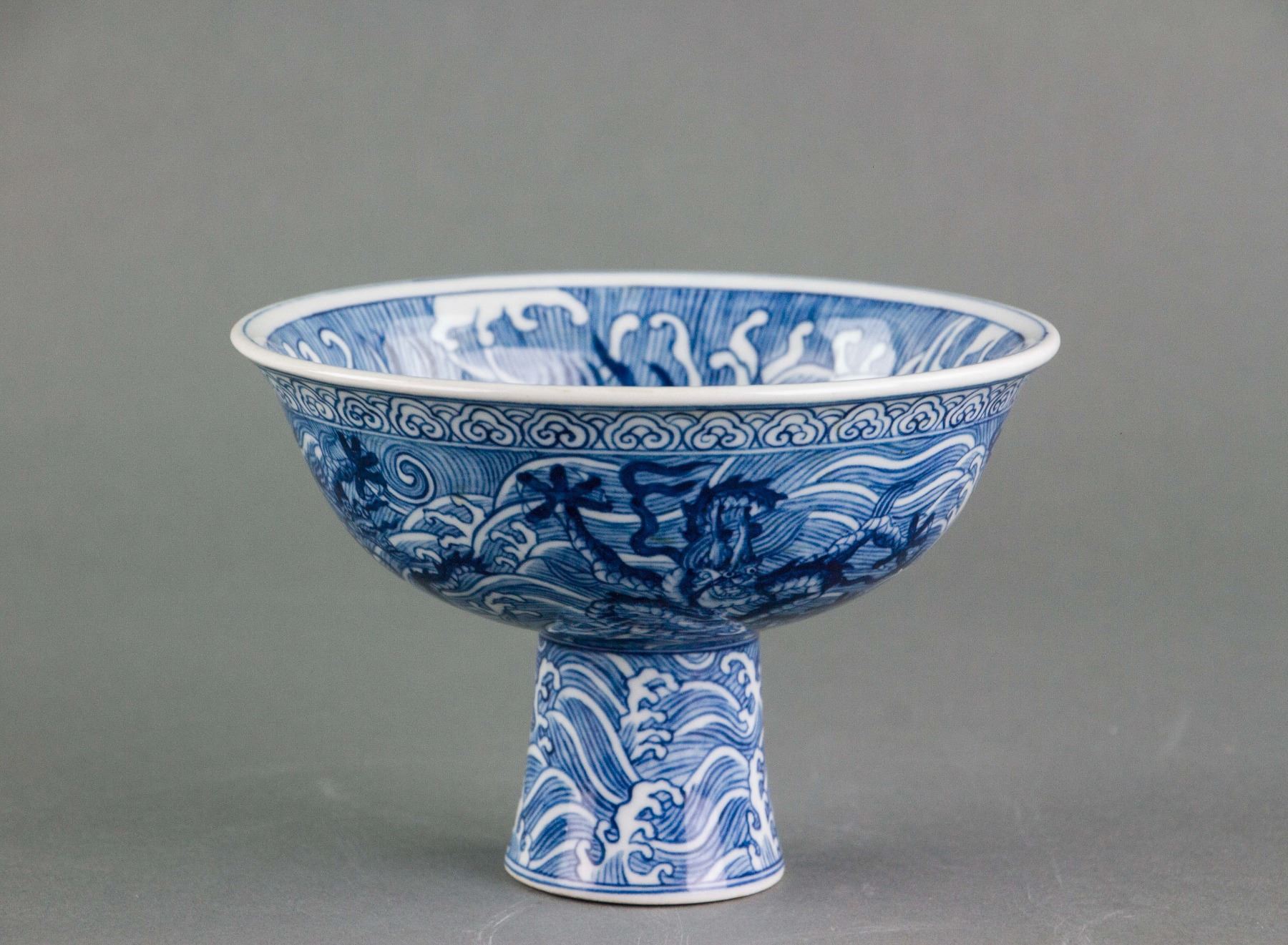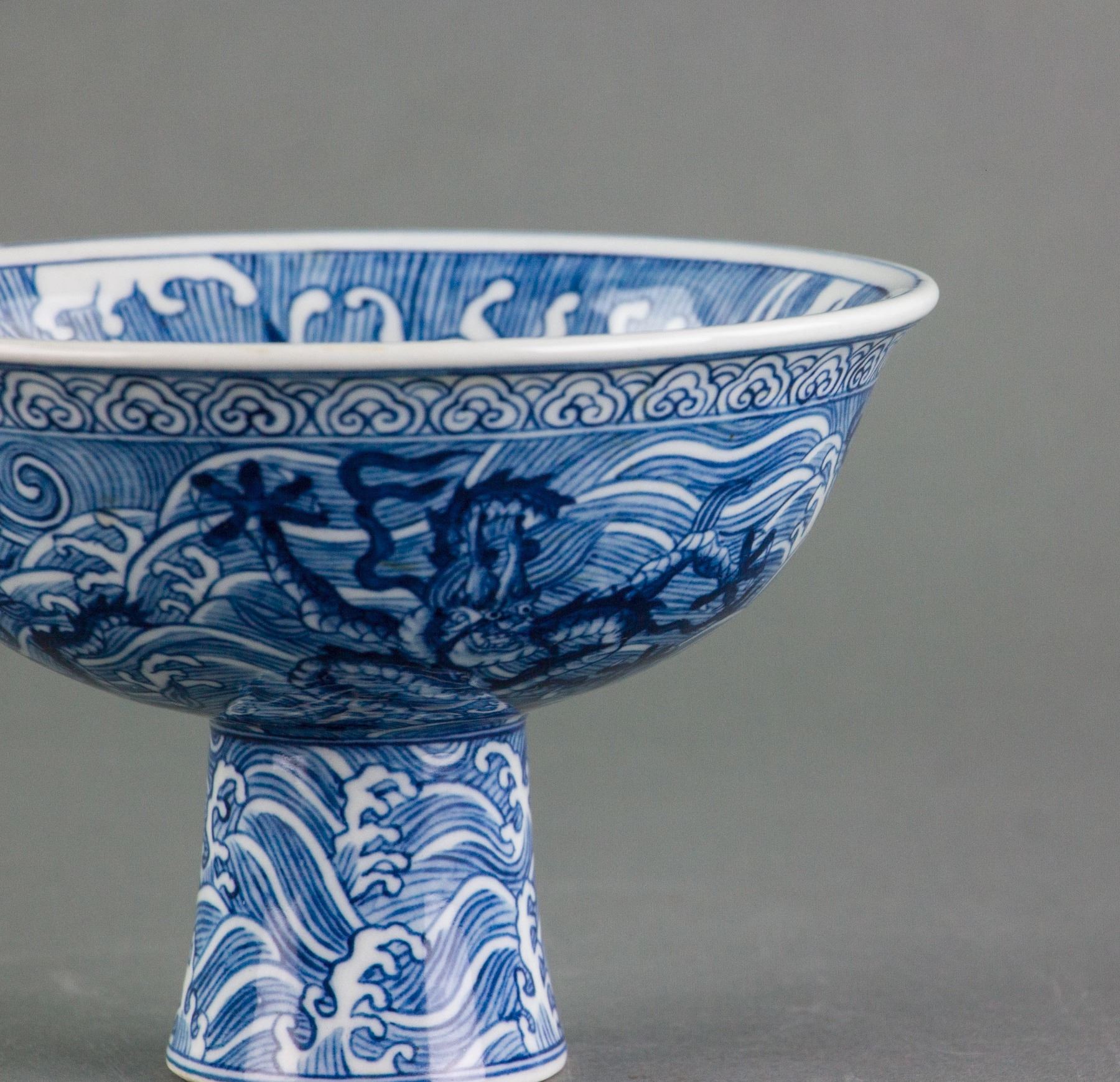 Chinese fine blue and white porcelain stem cup; of rounded edge, tapering to bottom; supported on long foot stem; painted with dragon and wave; six-character Chenghua mark inside of stem; 10 cm x 15.5 cm, 484 grams