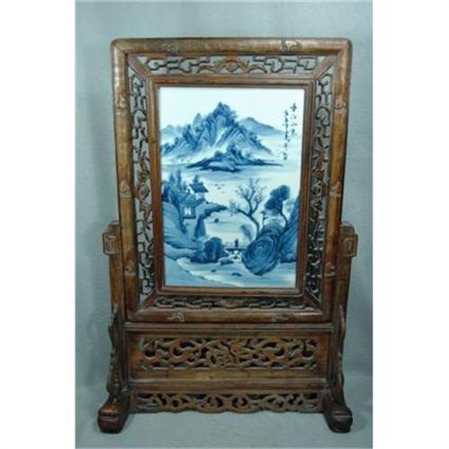 Chinese Blue and White Porcelain Table Screen. Decorate with landscape and mountain. Good condition. 15" x 11" porcelain itself.