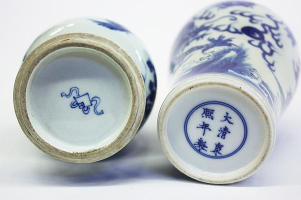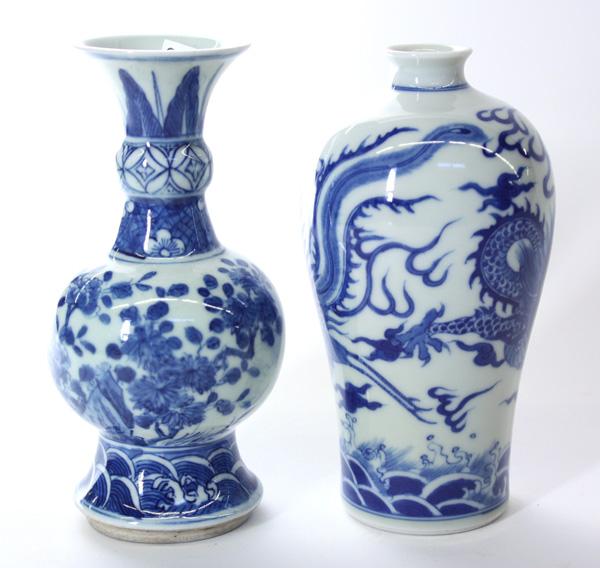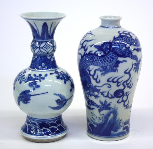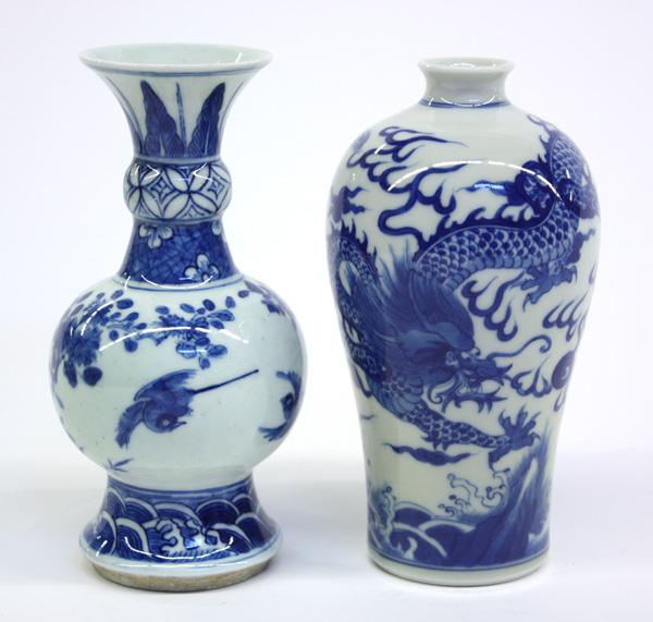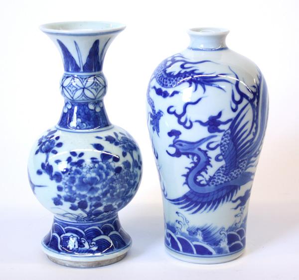 (lot of 2) Chinese underglaze blue decorated porcelain vases, the first a small meiping decorated with a phoenix and dragon in pursuit of a flaming jewel above cresting waves, the recessed base with an apocryphal Kangxi mark, 6''h; the second, with a bird-and-flower design on the globular body and below a trumpet mouth bracketing a cash coin-patterned bulb to the neck, underside with a studio mark, 6.1''h