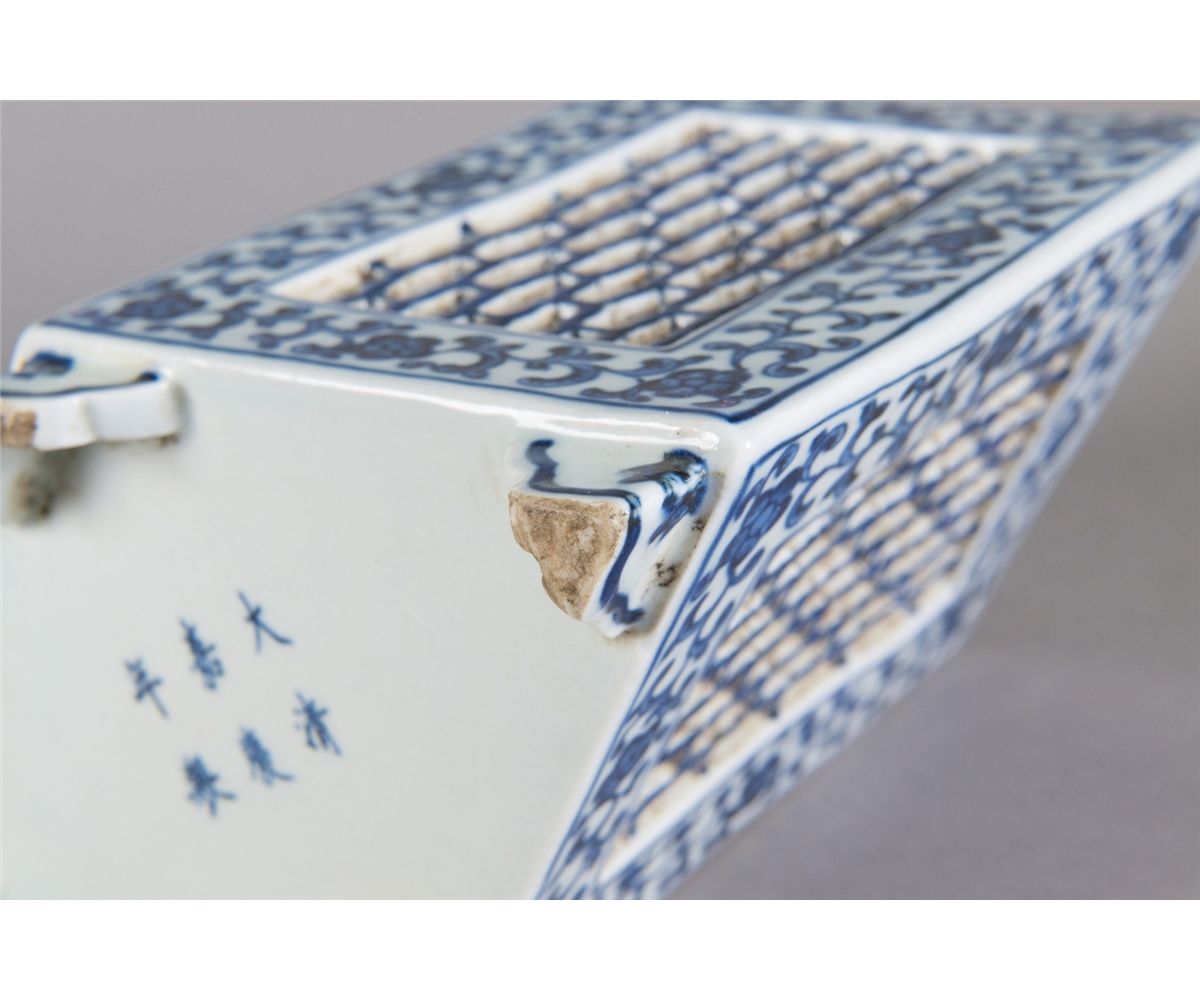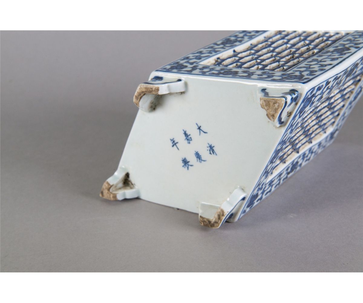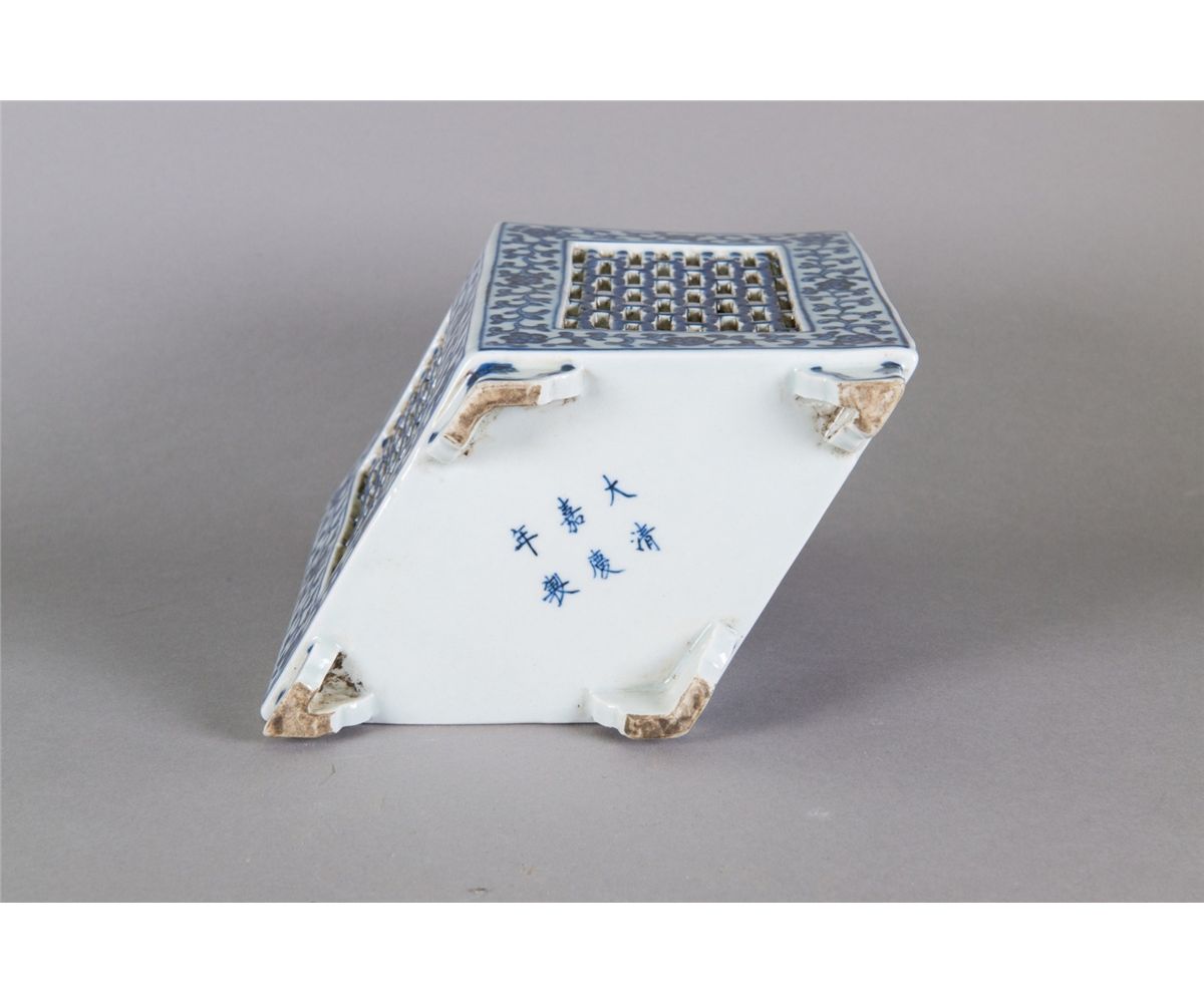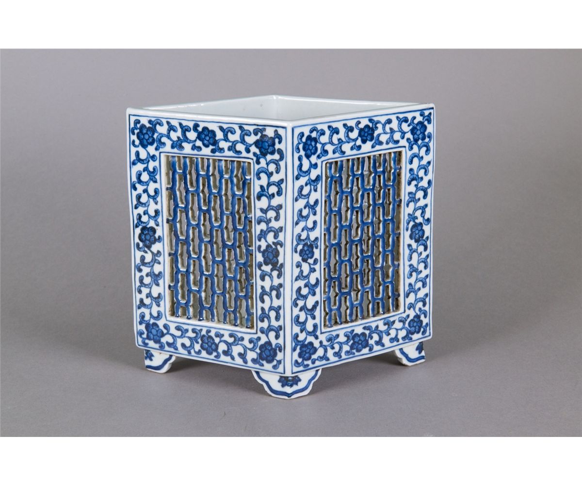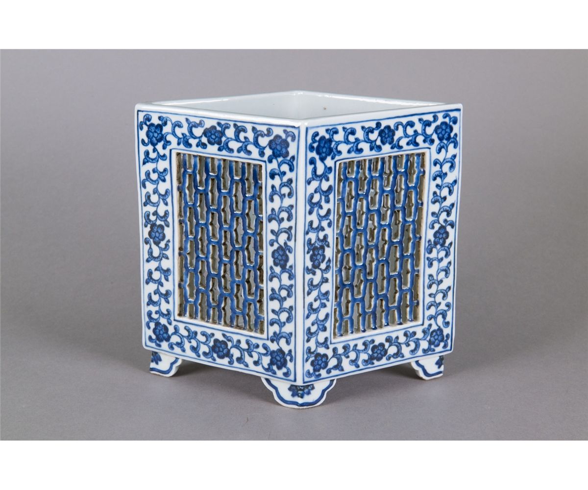 Chinese blue and white square Porcelain brush pot; of square body supported on four feet; featuring openwork flower patterns; H: 17.5 cm, W: 19.5 cm, 1014 grams