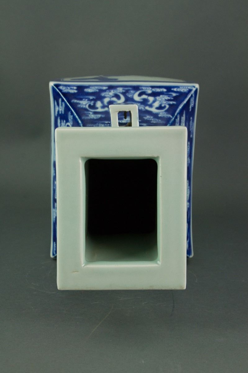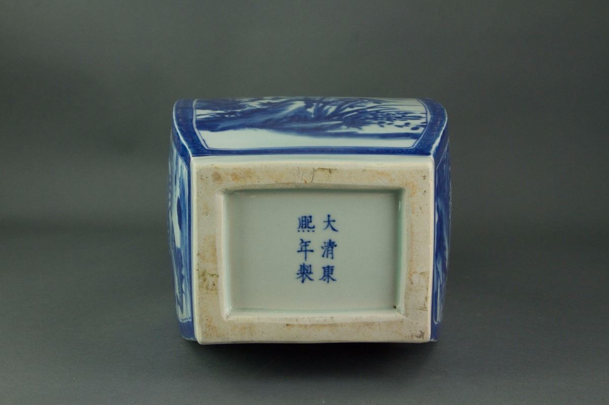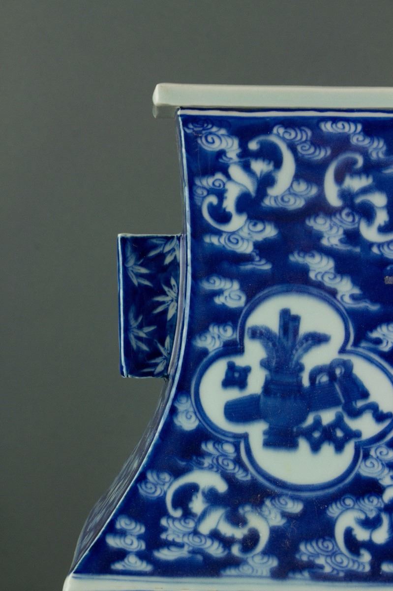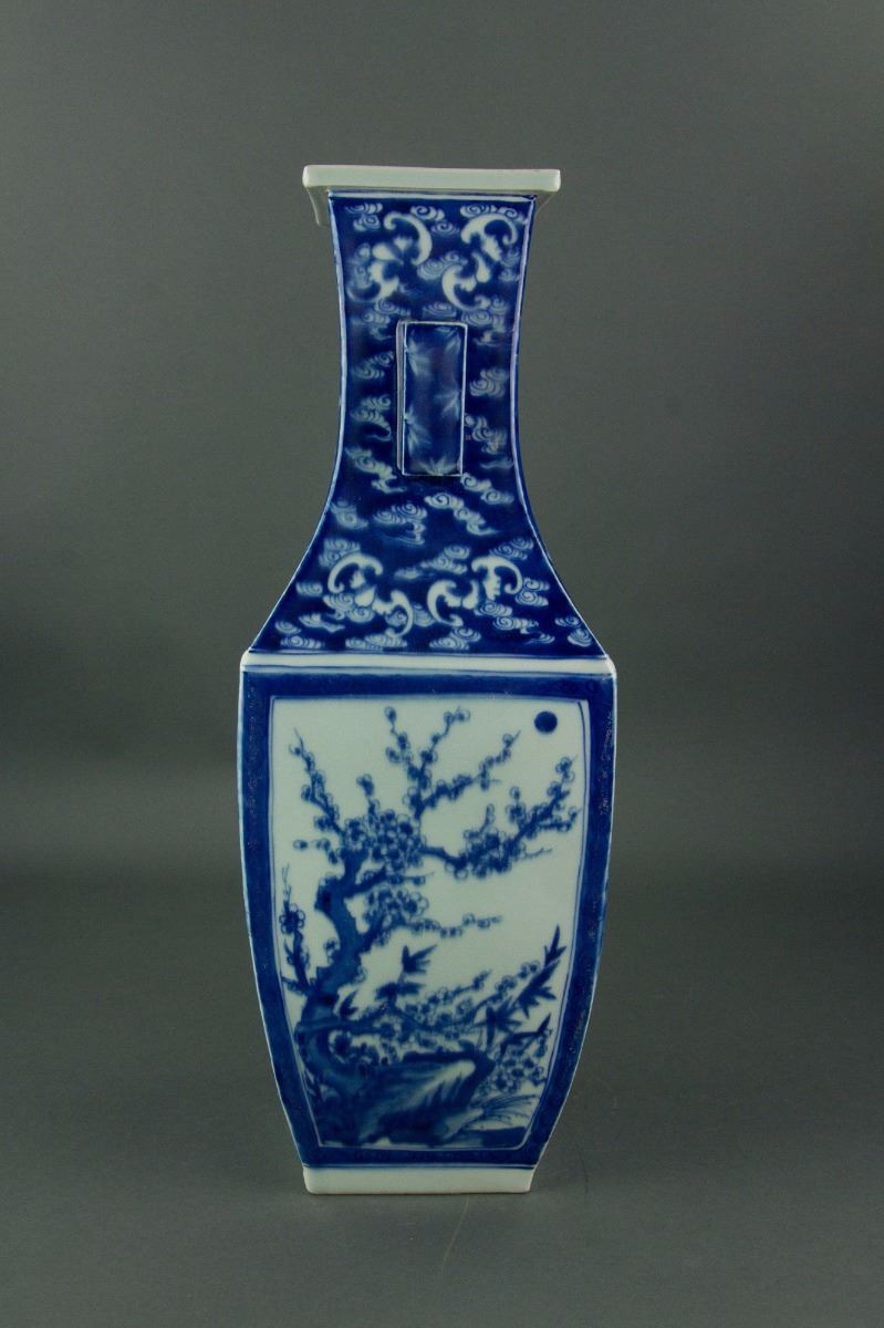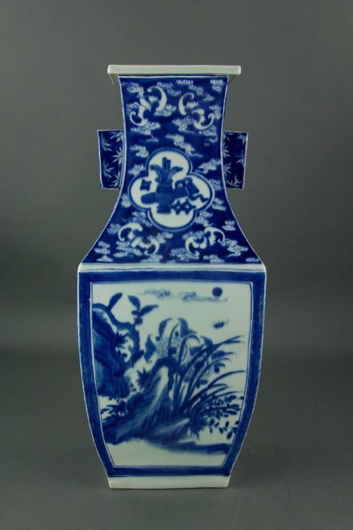 Chinese blue and white porcelain vase; of square baluster form flanked by a pair of rectangular ears; the body painted with panels enclosing roosters in a garden landscape and herons besides lotus pond; the neck decorated with bats amidst auspicious clouds; six-character Kangxi mark on base; H: 43.5 cm, W: 18 cm, 4501 grams