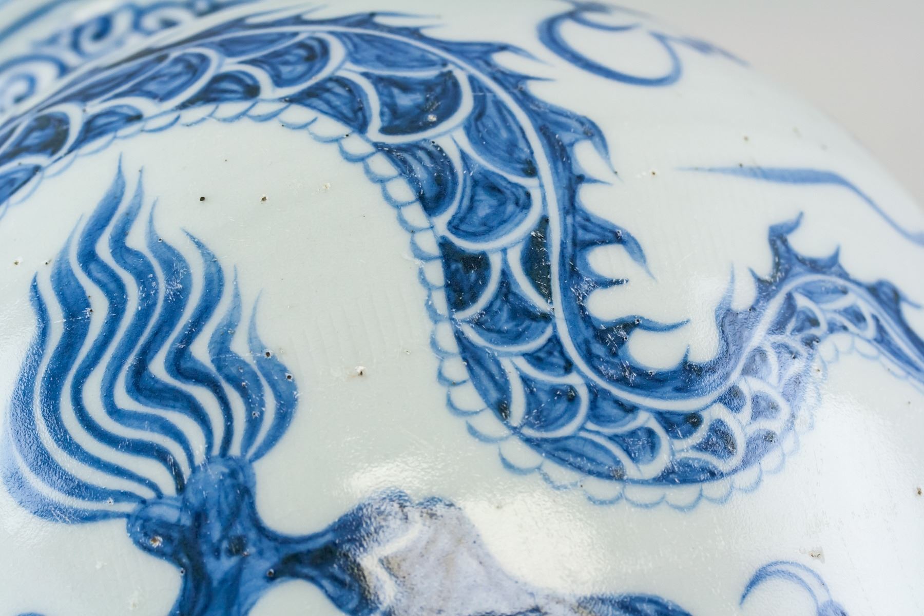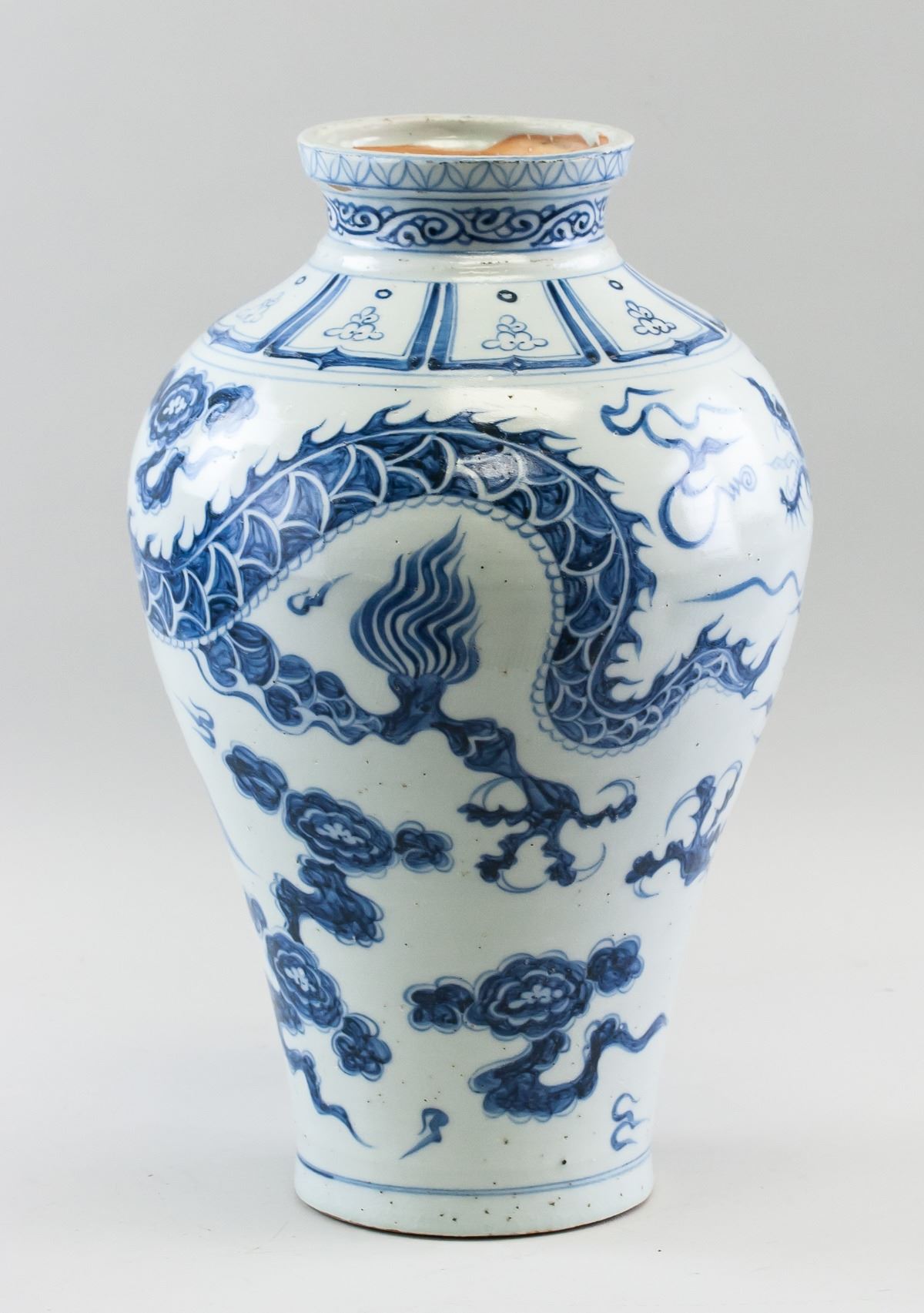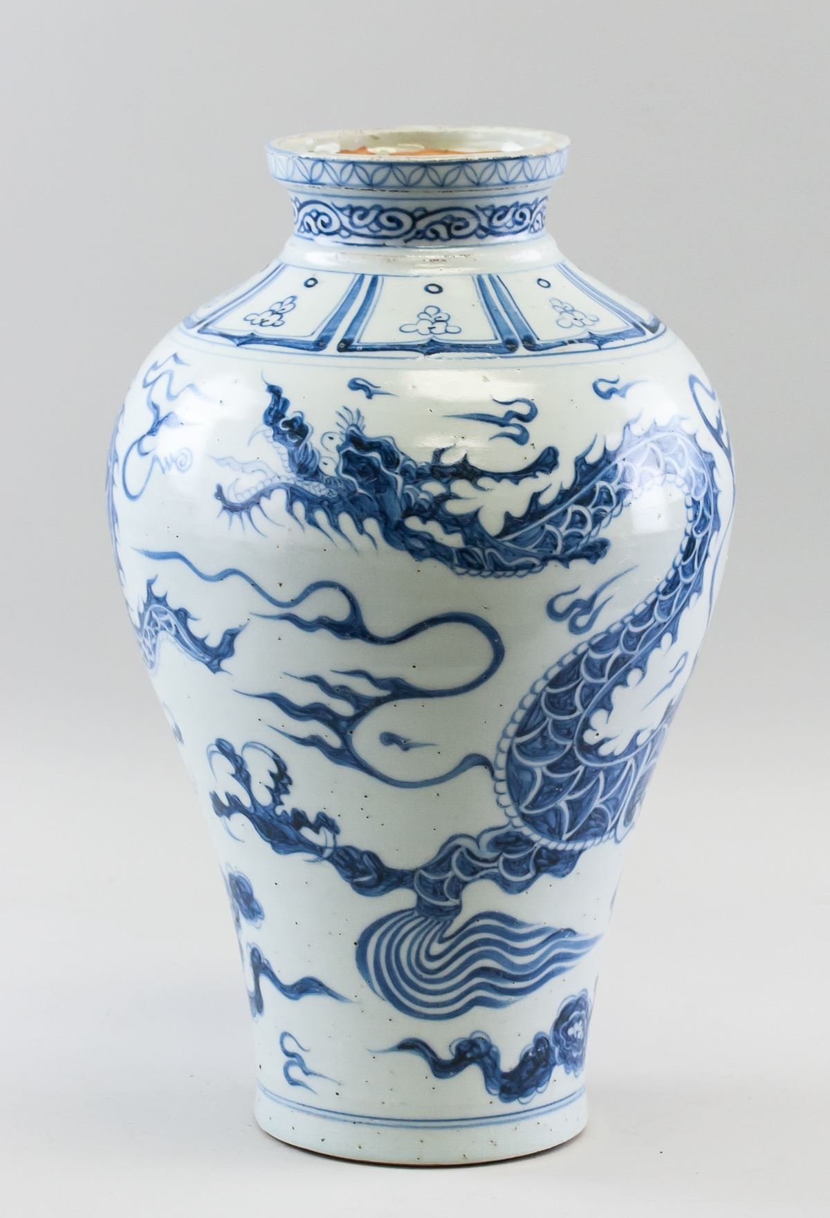 Chinese porcelain vase. Of white and blue tone. Painted with dragons. Of narrow opening and short neck, with long oval body. Resting on flat base. 41 x 24 cm, 5kg.
