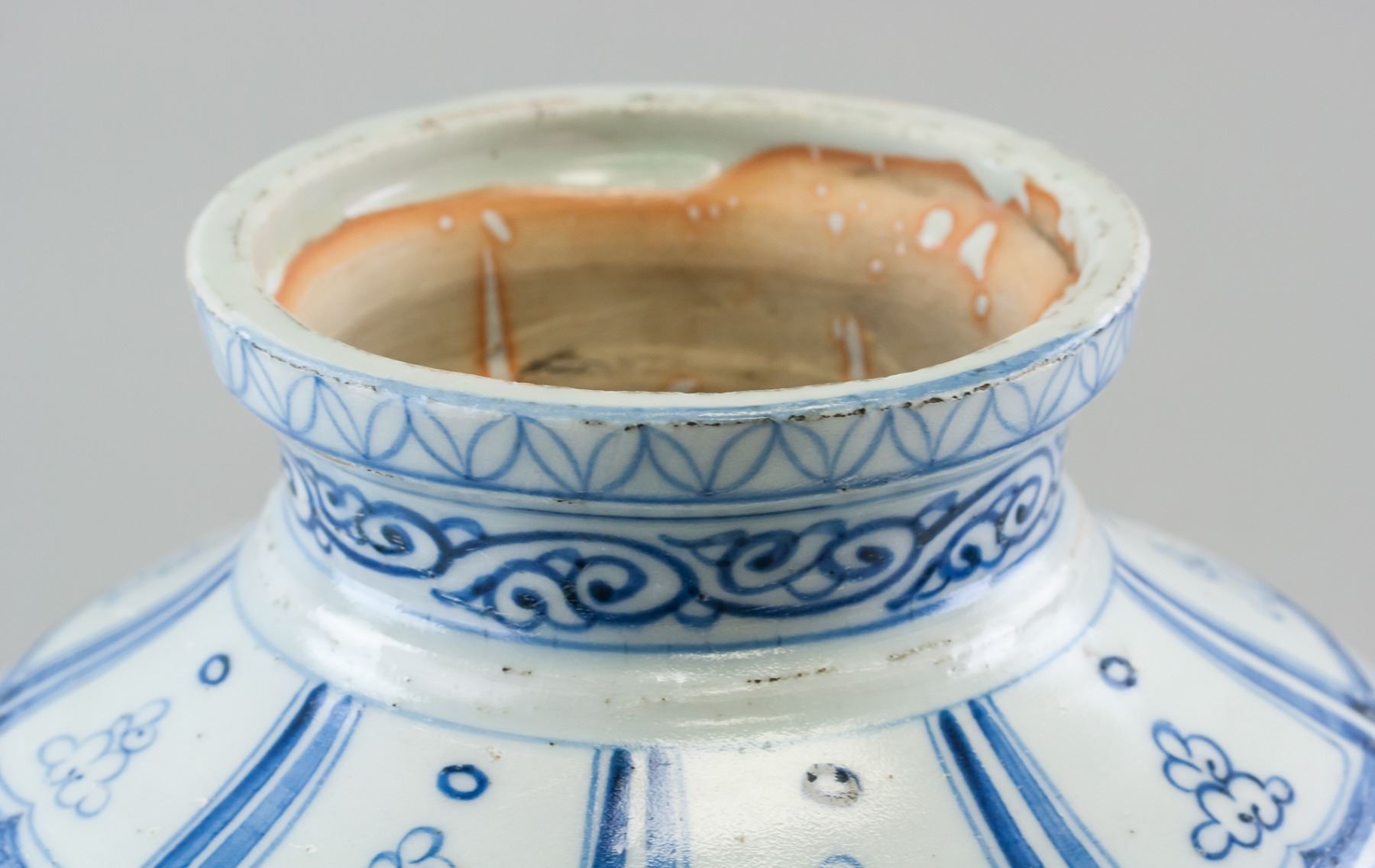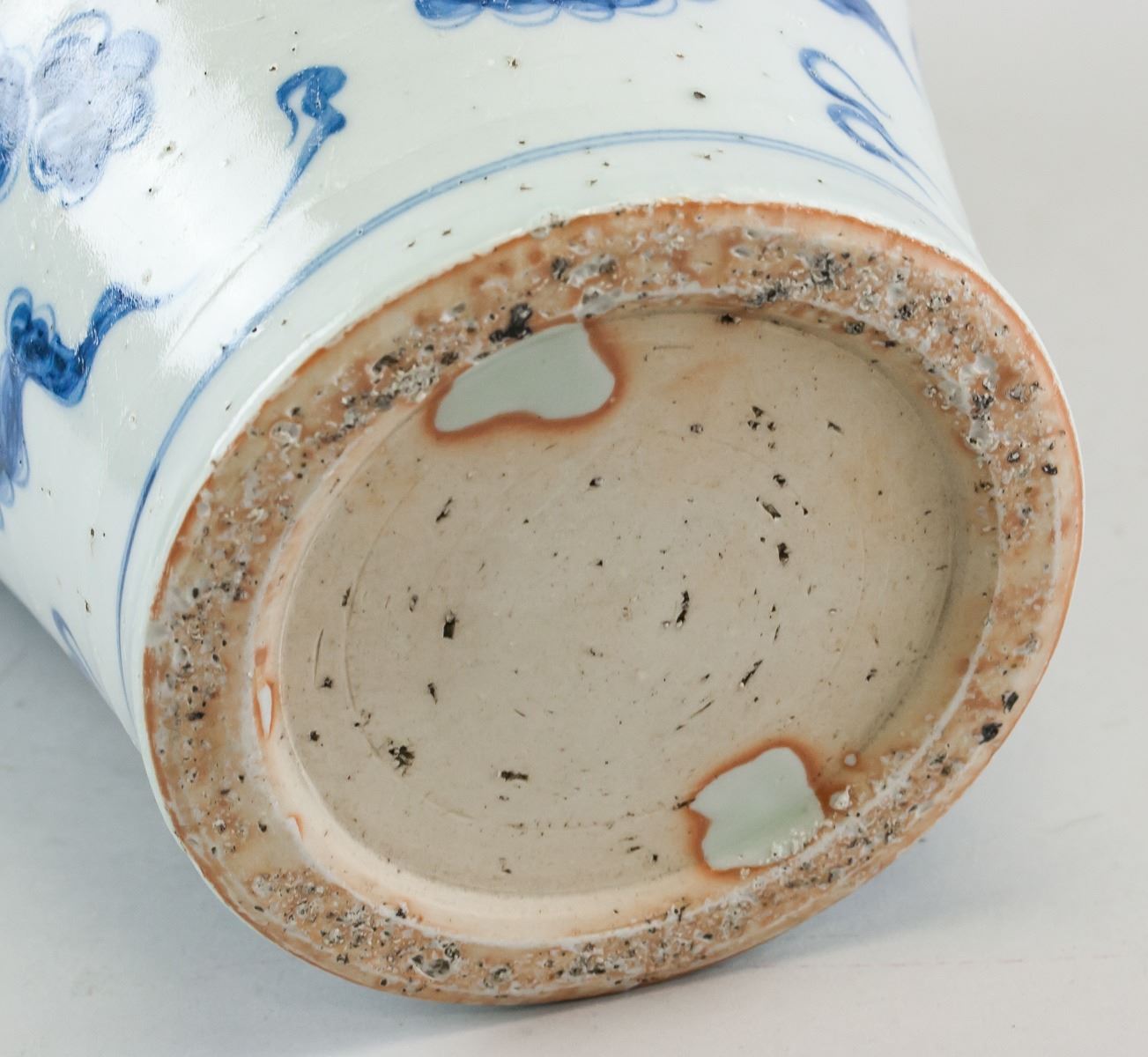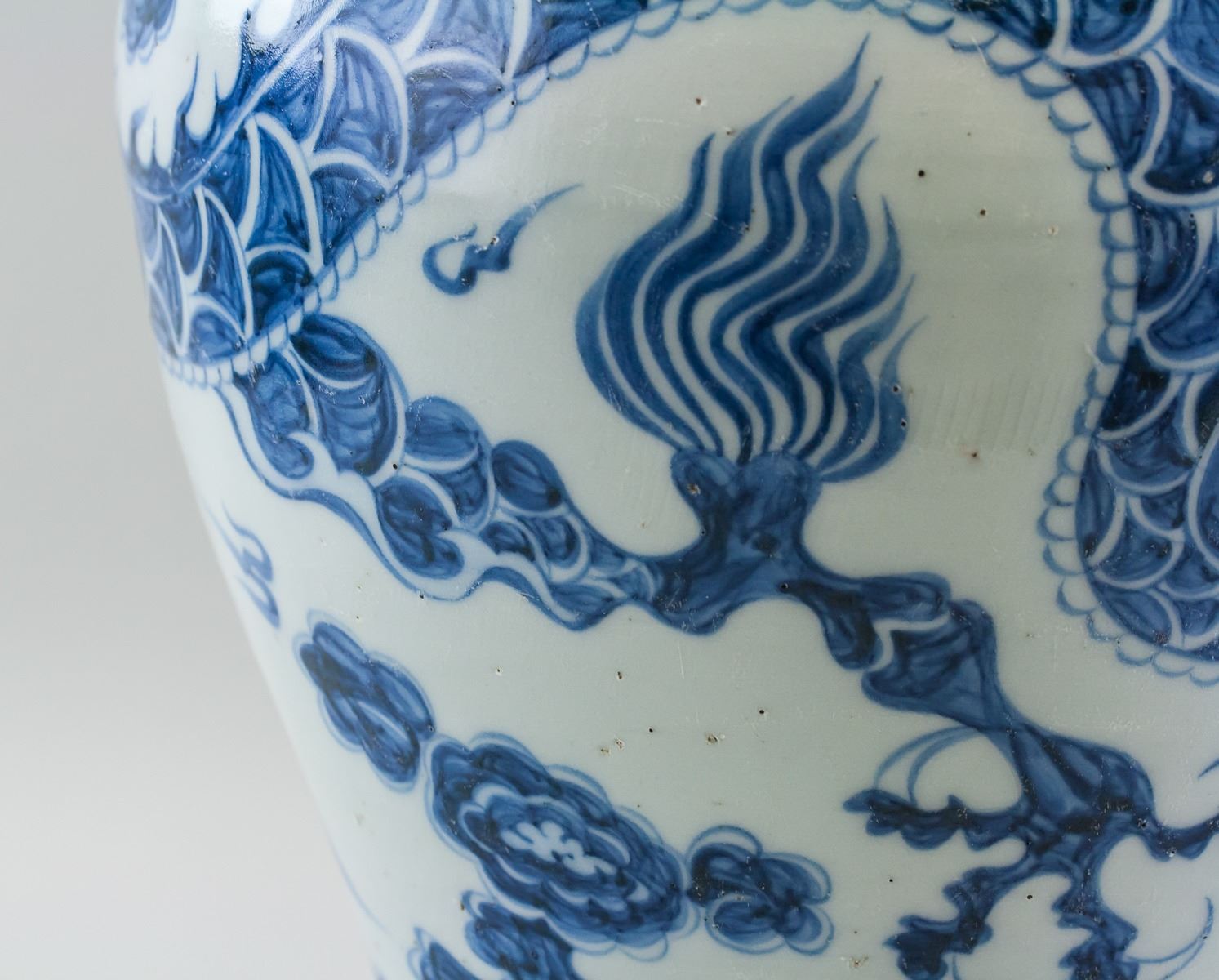 Chinese porcelain vase. Of white and blue tone. Painted with dragons. Of narrow opening and short neck, with long oval body. Resting on flat base. 41 x 24 cm, 5kg.