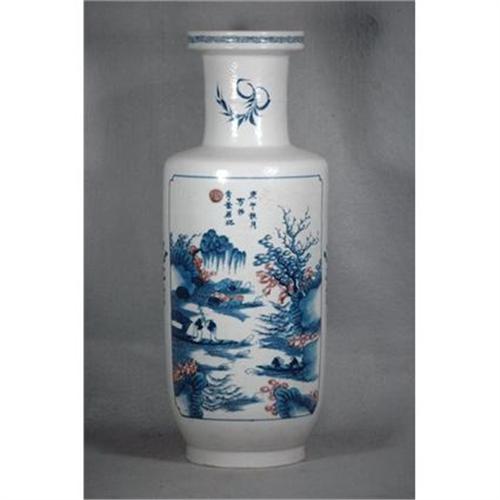 Chinese Blue and White with Red Porcelain Vase. Decorate with landscape and mountain. Good condition. 19.5" high.