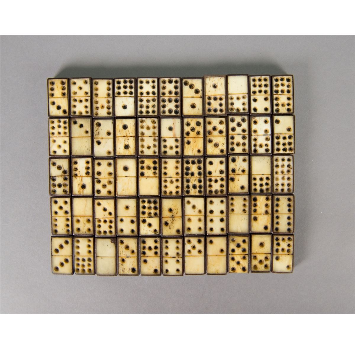 Chinese bone carved domino set with rosewood carved case; each bone carved piece framed by rosewood frame, 55 pieces in set; bone piece: H: 3.2 cm, W: 1.8 cm, box: L: 21.5 cm, W: 4.5 cm, H: 5.5 cm, 415 grams total (slightly splintered box )