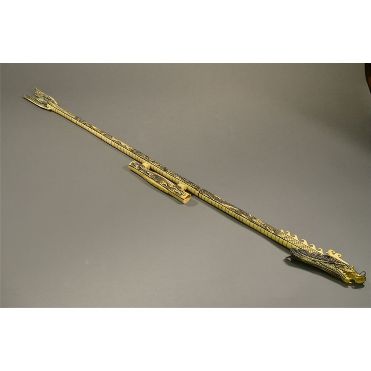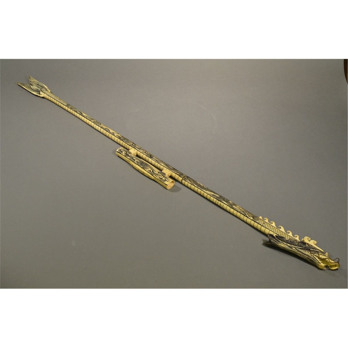 Decorated Chinese bone spear with incised dragon features finished off with dragon head finiale at end; 54" long