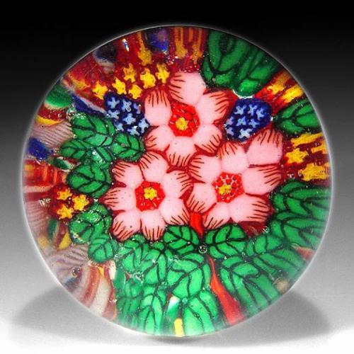Chinese bouquet and millefiori paperweight. A bouquet of three pink flowers and green leaves, is surrounded by assorted complex star canes, in red, yellow, blue, and white. Diameter 2 3/4".